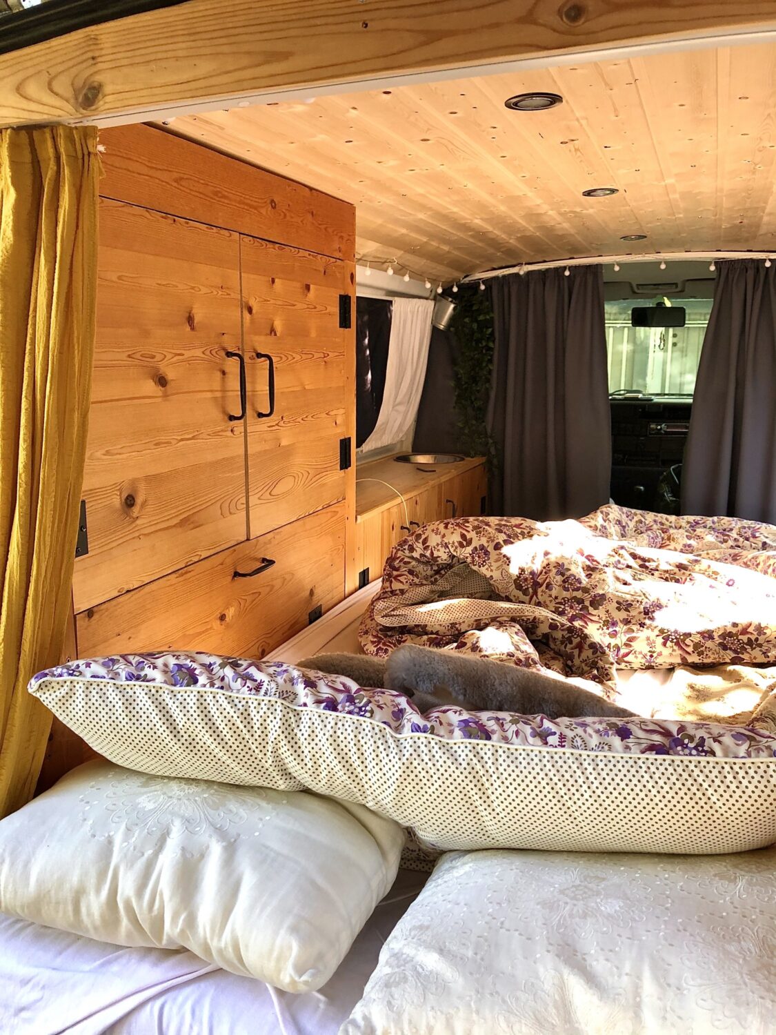 Der Ausbau hat circa 3-4 Monate gedauert. Der Ausbau besteht aus ausziehbarem Bett, Schrank, Küchenzeile und viel Stauraum. Extra Features gibt es keine, allerdings habe ich das meiste Holz für den Ausbau von einem alten Kleiderschrank verwenden können und das finde ich super. Auch die Bodenplatte und Zweitbatterie konnte ich gebraucht erwerben. Ich liebe Nachhaltigkeit. :-)