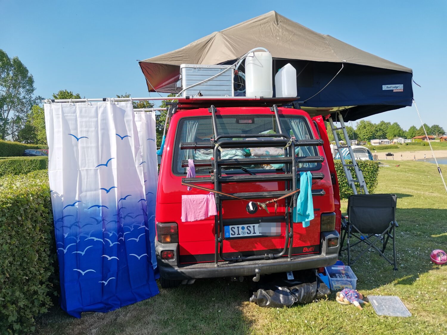 Zb bei der Dusche muss ein längerer Schlauch für die Handbrause her, ans Dachzelt soll noch ein Sonnensegel dran und an der Küche soll zum schon vorhandenen steh Tisch für draußen noch ein niedriger Tisch Platz finden zum Sitzen oder für die Kinder.