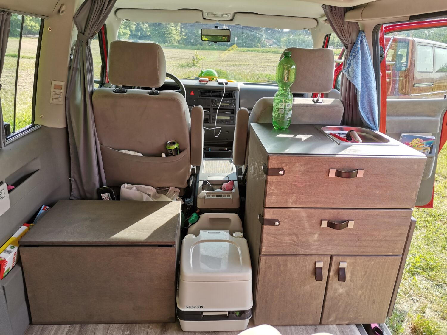 Und im Frühjahr haben wir dann die Küche und Heckschublade gebaut 👍 die Kiste am Tisch wird aktuell neu gebaut denn da soll unsere TrockenTrennToilette (TTT) rein.