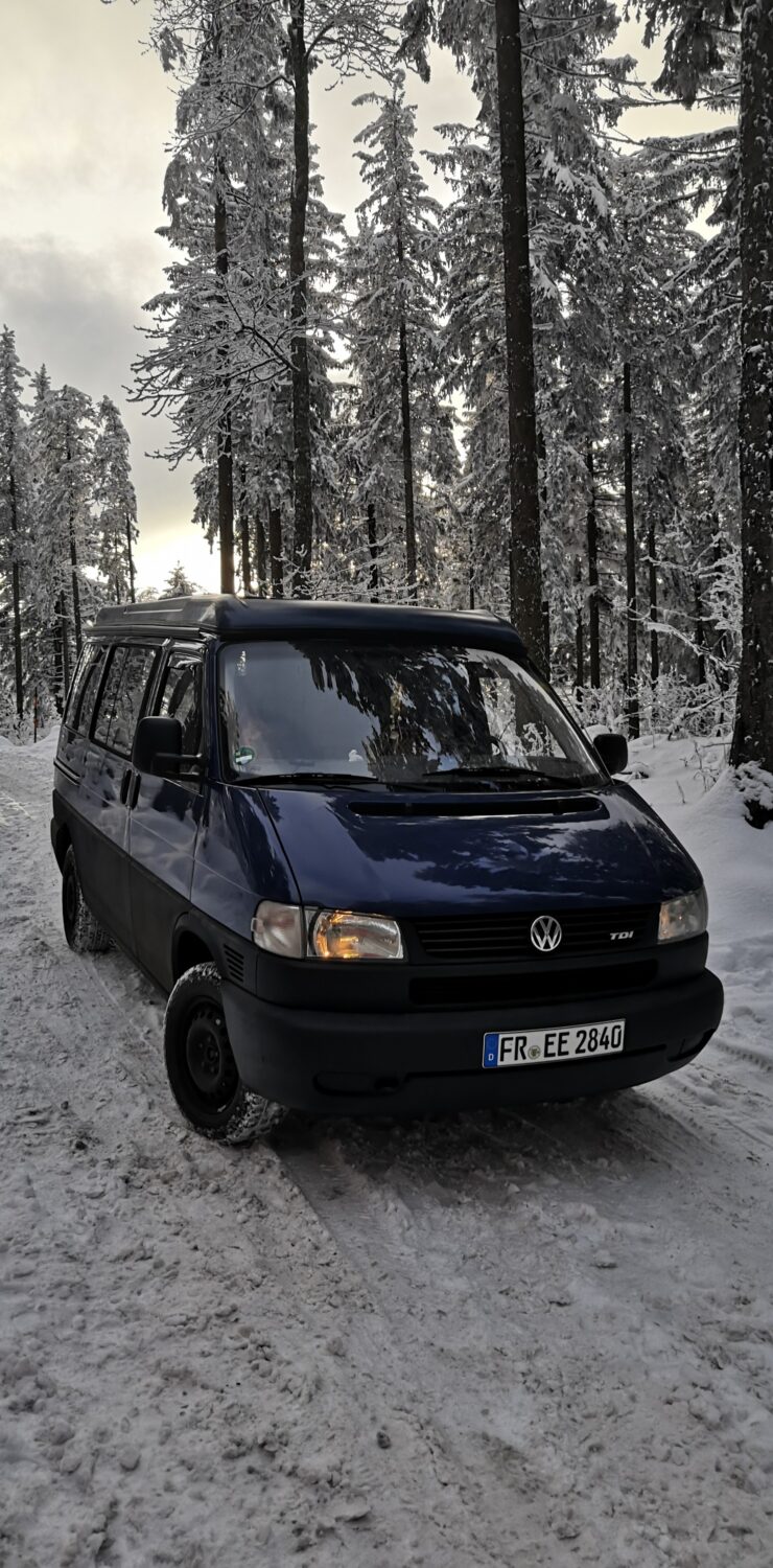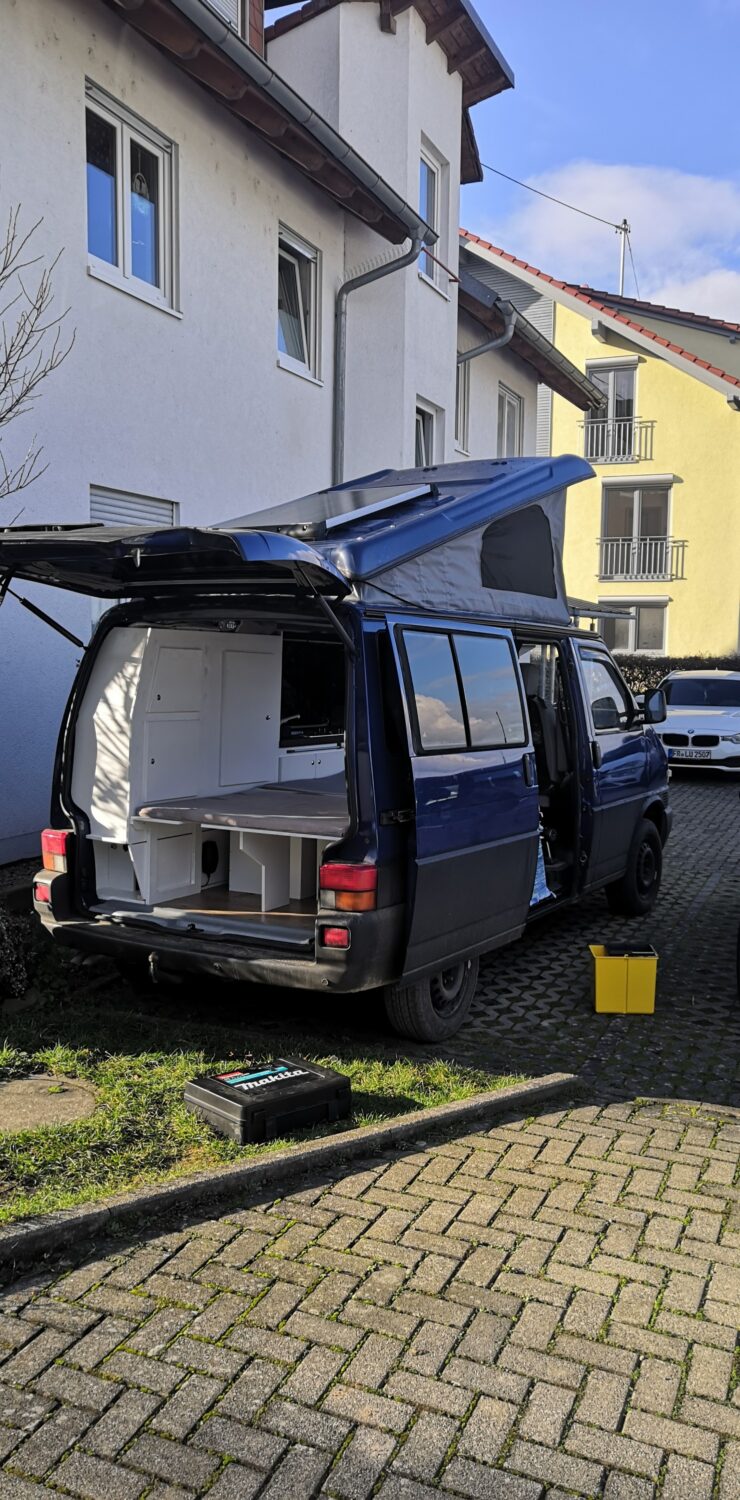 Per Zufall im Juni 2020 an den komplett runtergelebten und verrosteten T4 Transporter gelaufen und direkt verliebt. Seitdem von außen nach Innen mehr oder weniger hergerichtet. Innen komplett neu ausgebaut und das Aufstelldach erneuert. Jetzt freue ich mich auf die kommenden Trips. :) Paar Details zum Ausbau: Aufteilung ähnlich wie im California mit Küchenzeile und Schrankwand. Danaben eine Klappbank von Reimo und eine eigene Bettkonstruktion dahiner, so dass man unten ebenfalls eine Liegefläche von 195x115cm hat. 30l Frischwassertank (Spülbecken und Heckklappendusche) und 10l Abwassertank. Dometic Koch-& Spülkombination. Gaskasten mit 2x 5kg Gasflasche. Truma E2400 Gasstandheizung. 150W Solar aufm Dach, 80AH LiFePo4, MPPT-Solarladeregler, Ladebooster, Batteriecomputer, etc. weitere Infos gibts auf Instagram :)