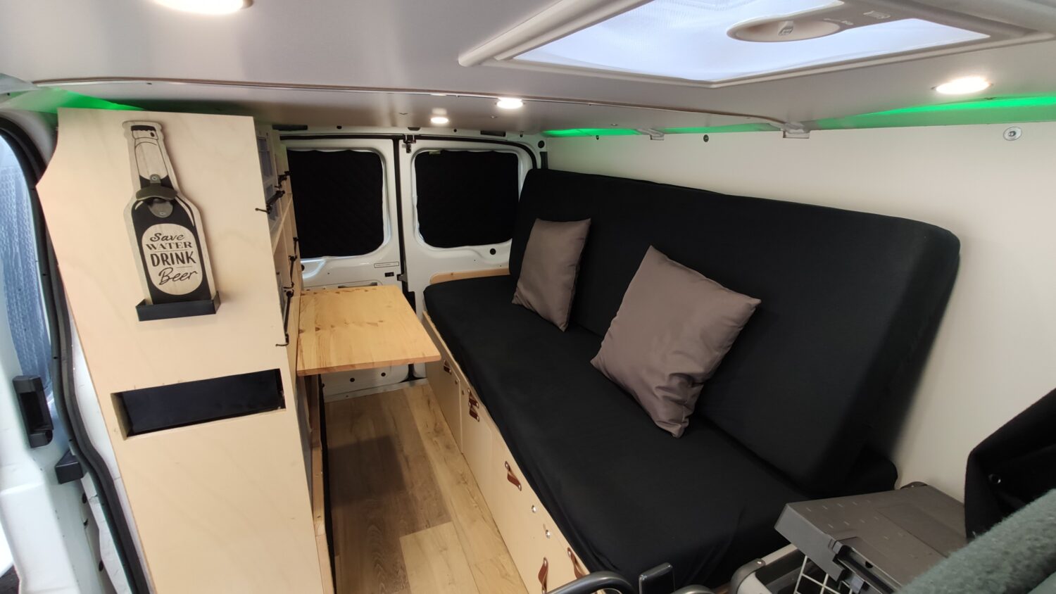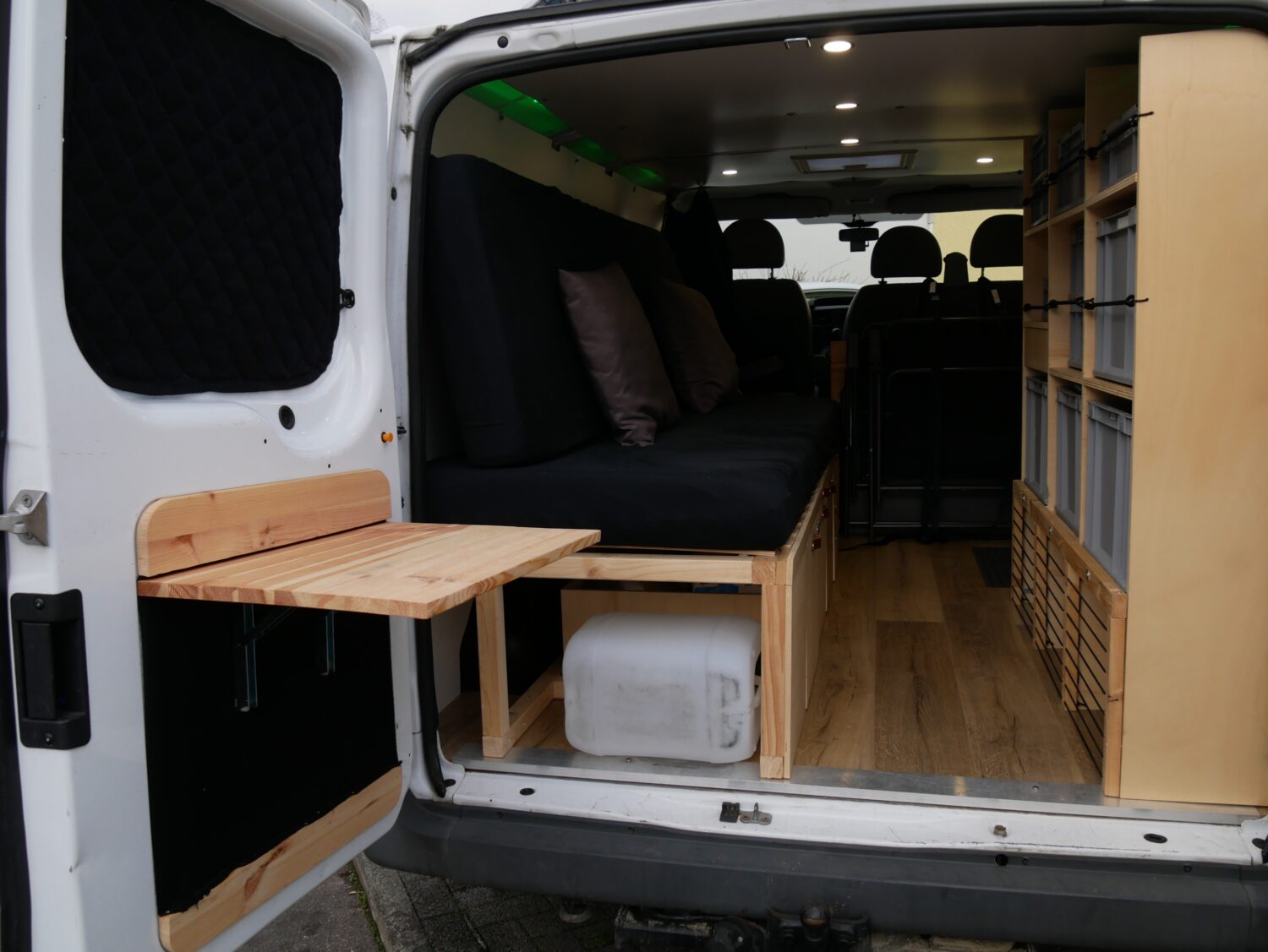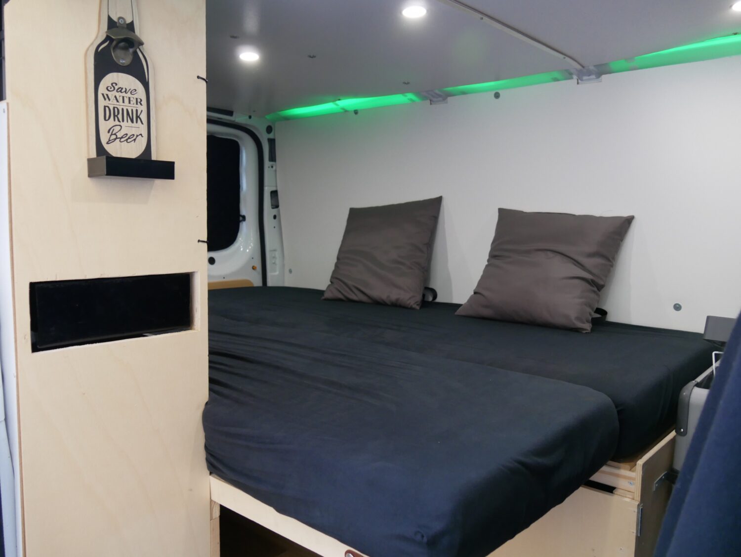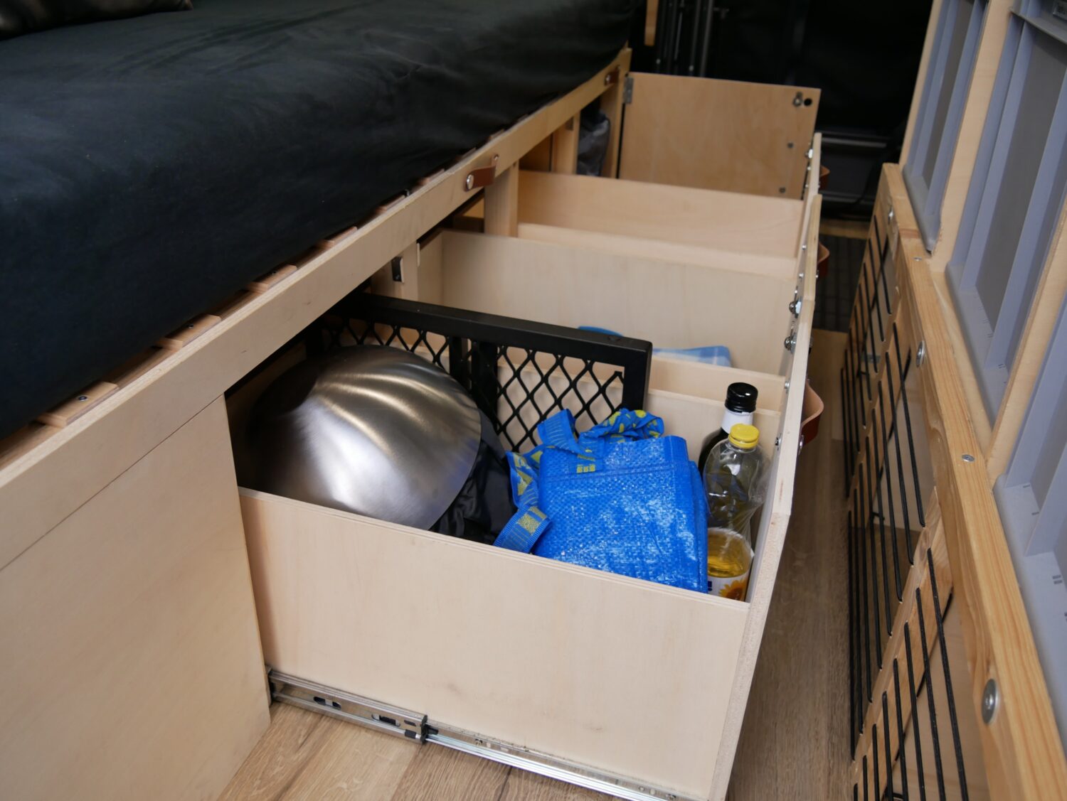 Für den Ausbau habe ich ungefähr ein halbes Jahr gebraucht und habe immer abends nach der Arbeit oder an Wochenenden dran gearbeitet. Ich wollte alles möglichst simpel und einfach gestalten, sodass alles gut erreichbar ist und z.b. das Bett mit wenigen Handgriffen aufgebaut ist. Der Bus hat alles an Ausstattung, was man sich so vorstellen kann. Fließend Wasser gibt es nicht, mir reicht dafür ein 20l Wasserkanister.