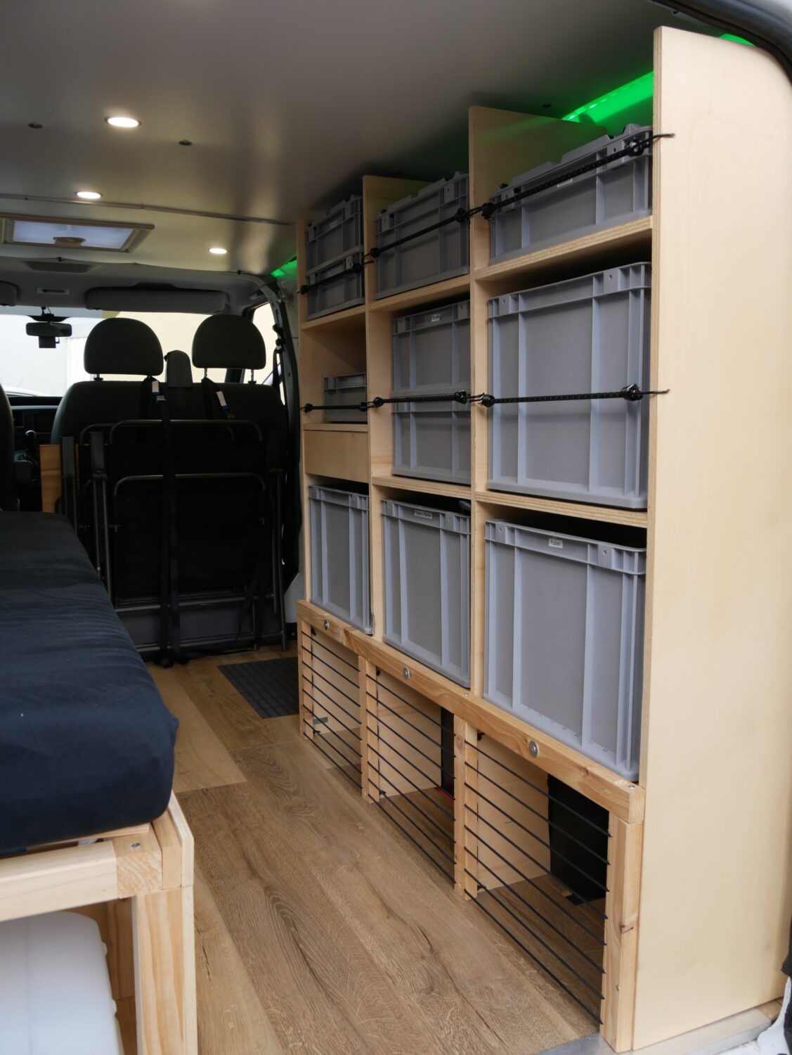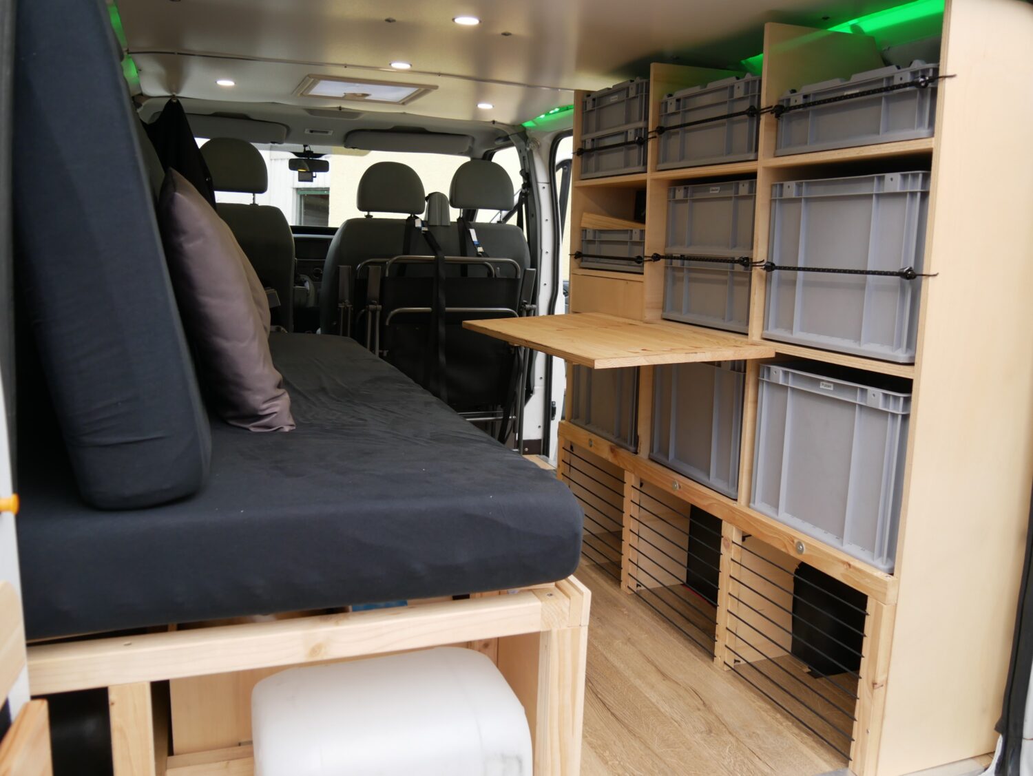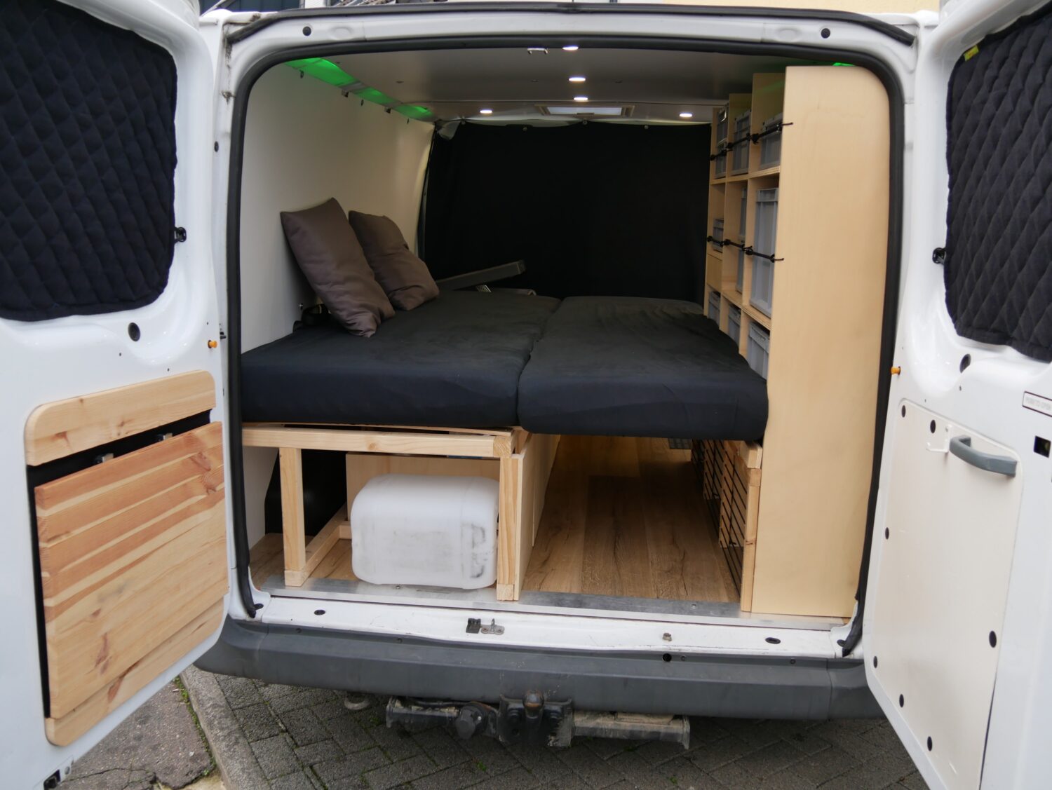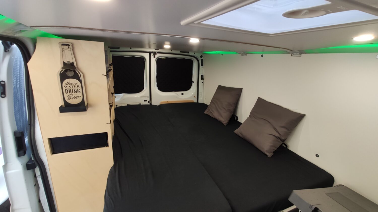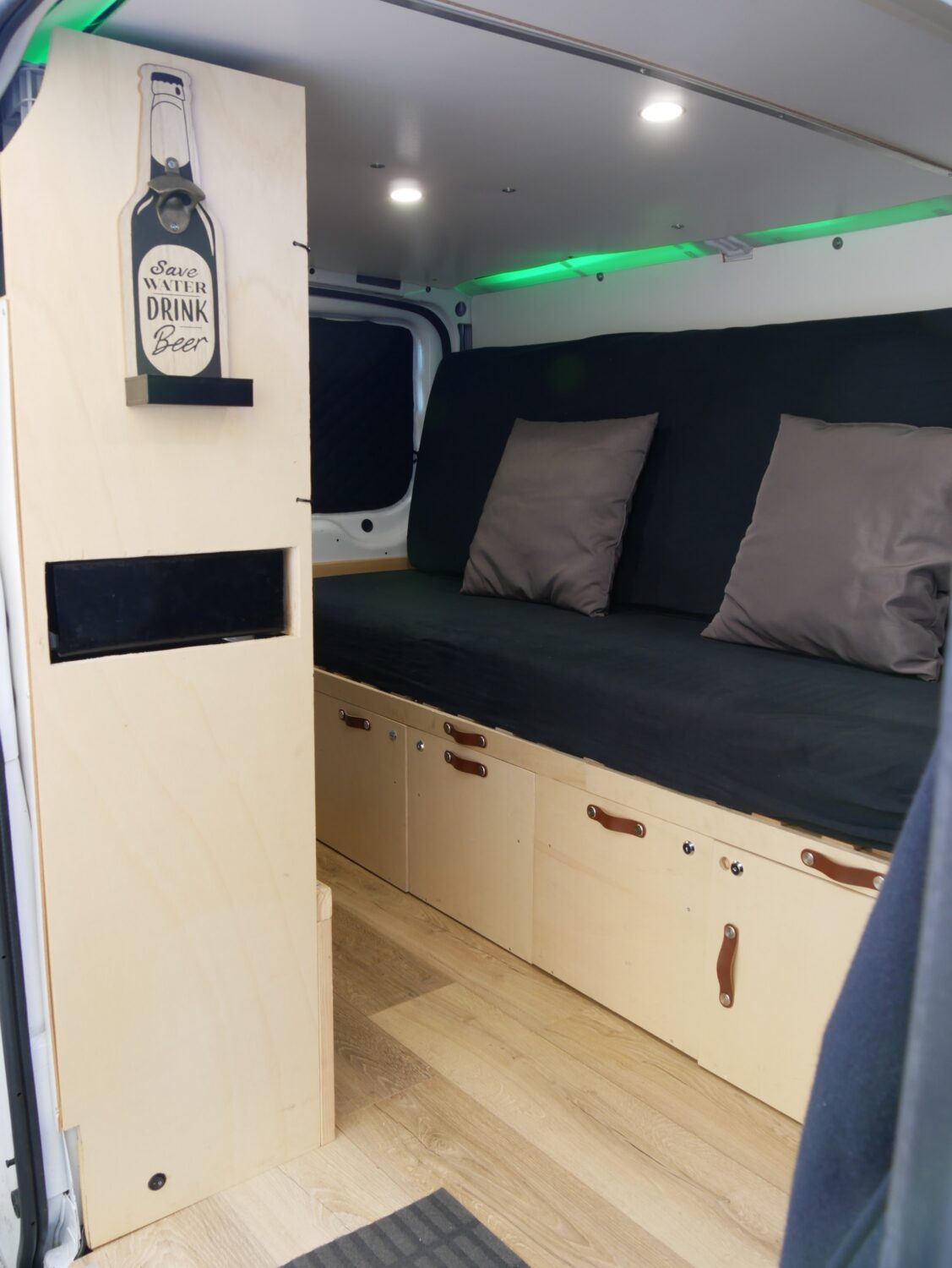 Für den Ausbau habe ich ungefähr ein halbes Jahr gebraucht und habe immer abends nach der Arbeit oder an Wochenenden dran gearbeitet. Ich wollte alles möglichst simpel und einfach gestalten, sodass alles gut erreichbar ist und z.b. das Bett mit wenigen Handgriffen aufgebaut ist. Der Bus hat alles an Ausstattung, was man sich so vorstellen kann. Fließend Wasser gibt es nicht, mir reicht dafür ein 20l Wasserkanister.