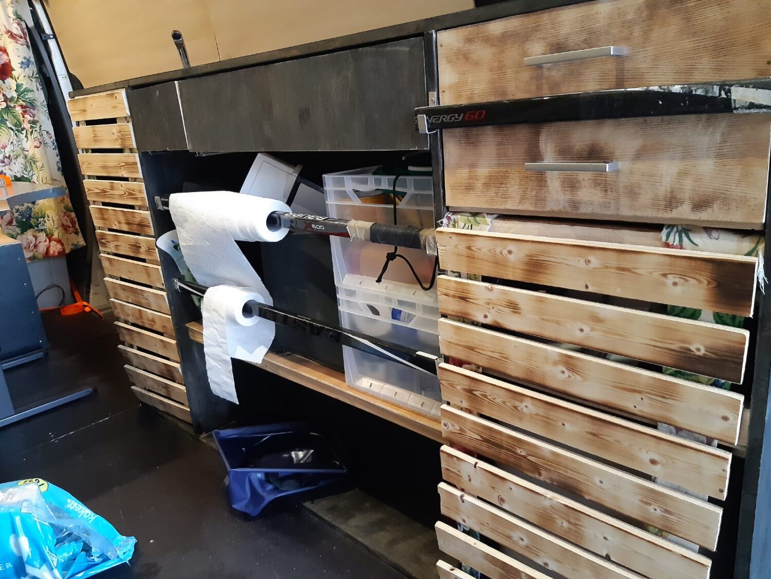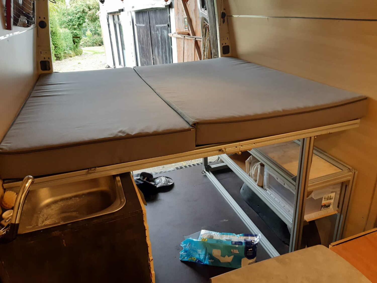 Den Ausbau habe ich nach dem Abi begonnen mit Blick auf günstig und schnell. Viele Teile sind Scheunen oder Kellerfunde. Die wichtigen Teile wie Elektro, Matratze, Bettgestell und Küche sind aber neu und hochwertig. Besonders stolz bin ich auf meine Bettkonstruktion, die das Bett ohne viel umräumen aufbaut.