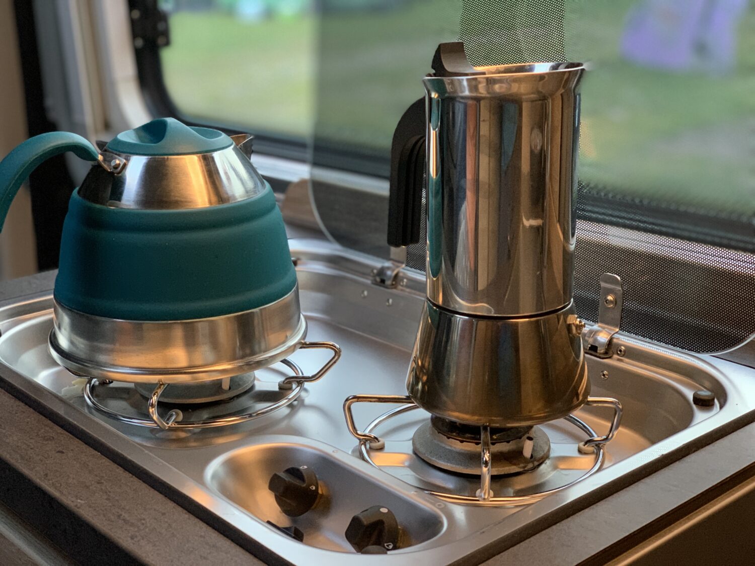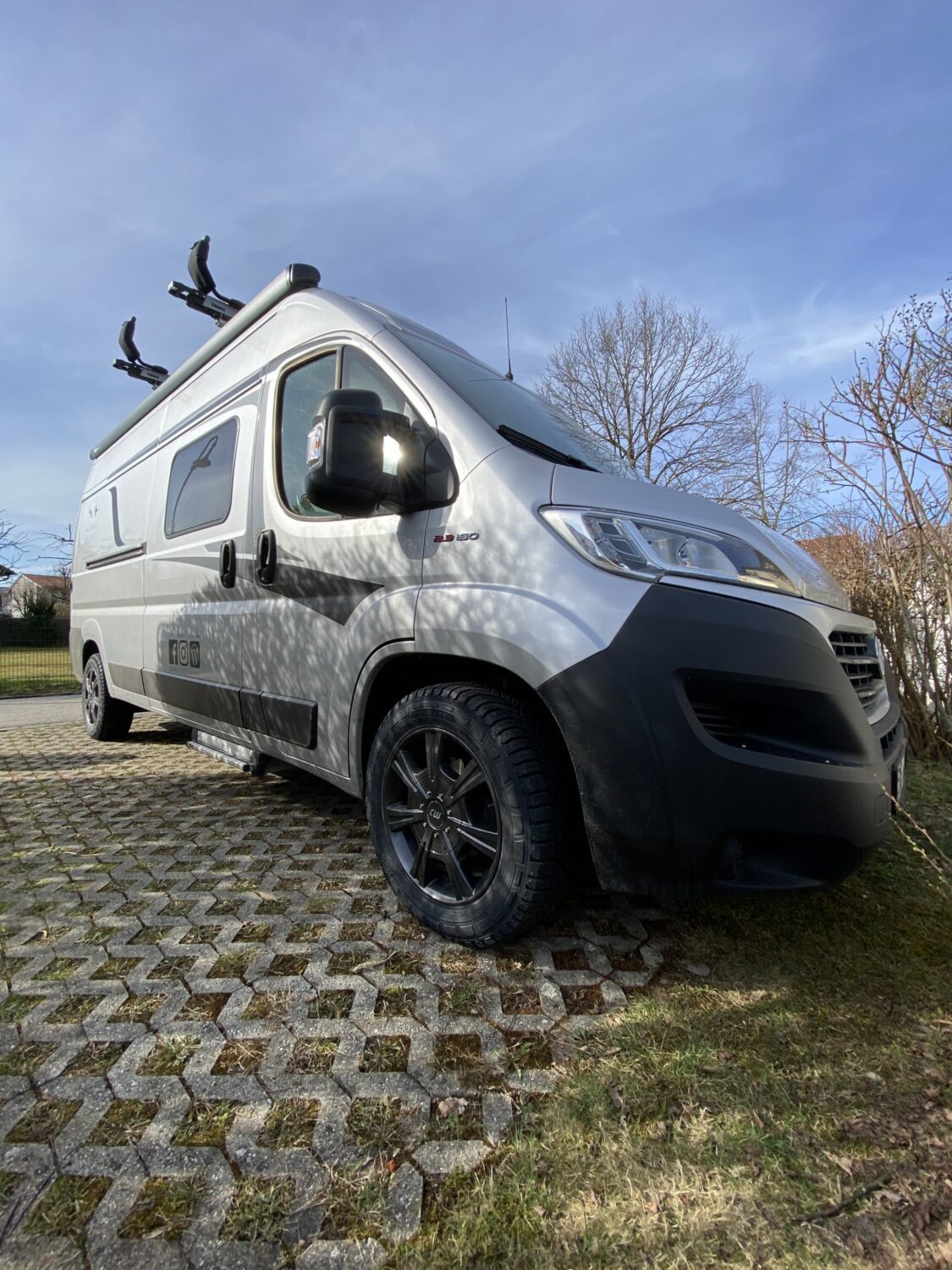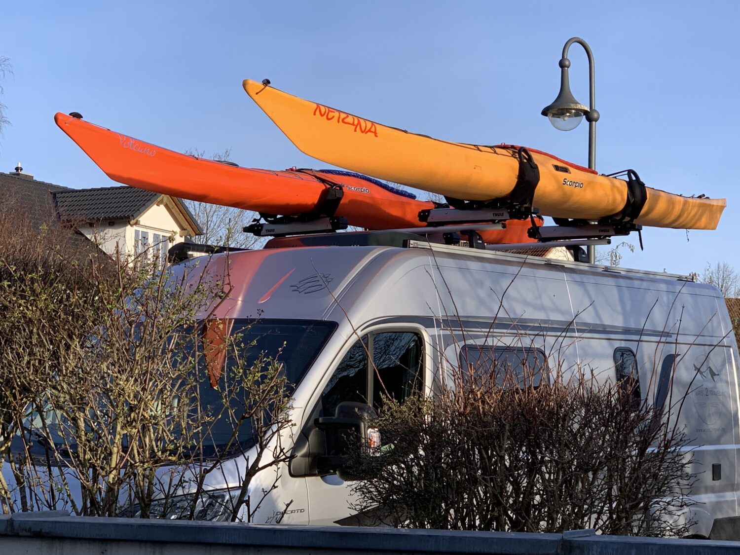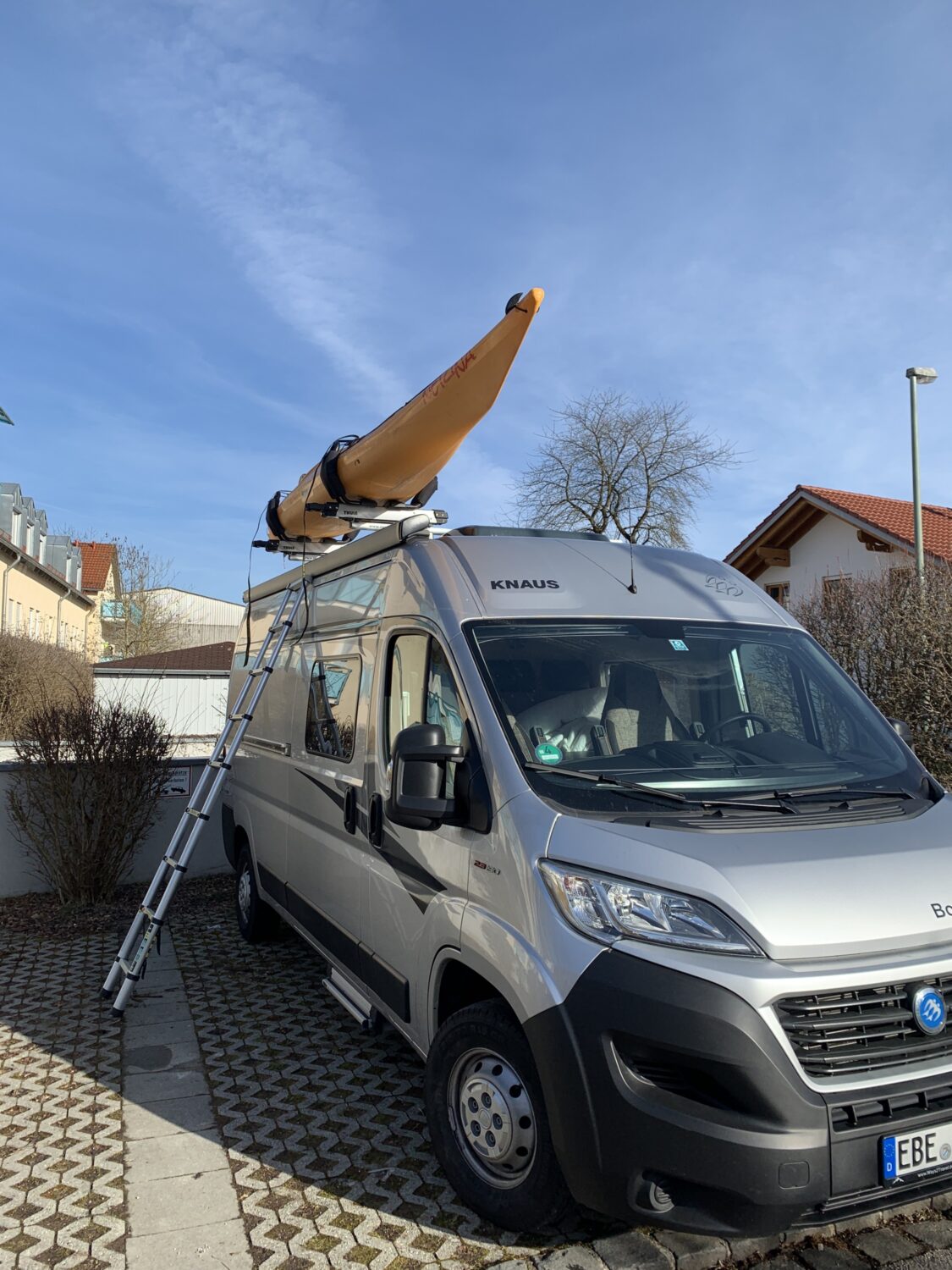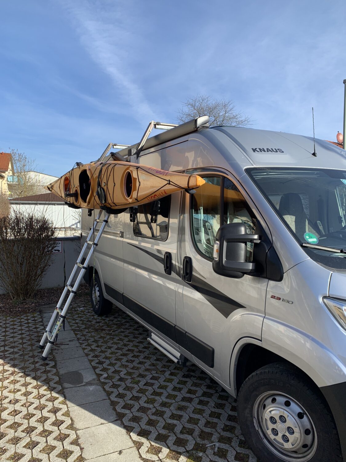 Der Ausbau an sich stammt von Knaus, es handelt sich um einen BoxStar Street 600. Wir haben den auf unsere Outdoor-Bedürfnisse angepasst. Dazu gehören neben neuen Kompletträdern u.a. ein entsprechender Vollauszug im Heck. Besonders stolz sind wir auf den angepassten beidseitigen Ladeträger für unsere Seekajaks, die wir mittels Hullavator recht einfach aufs Dach bekommen.