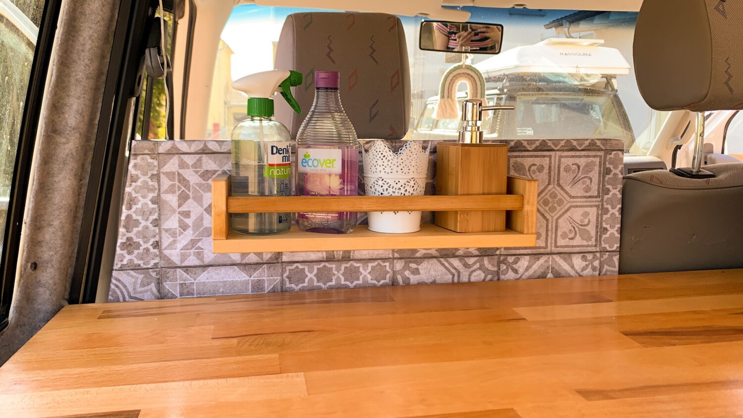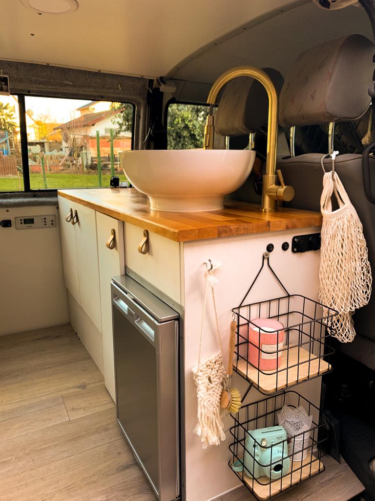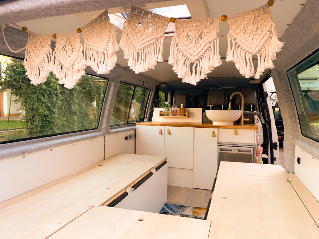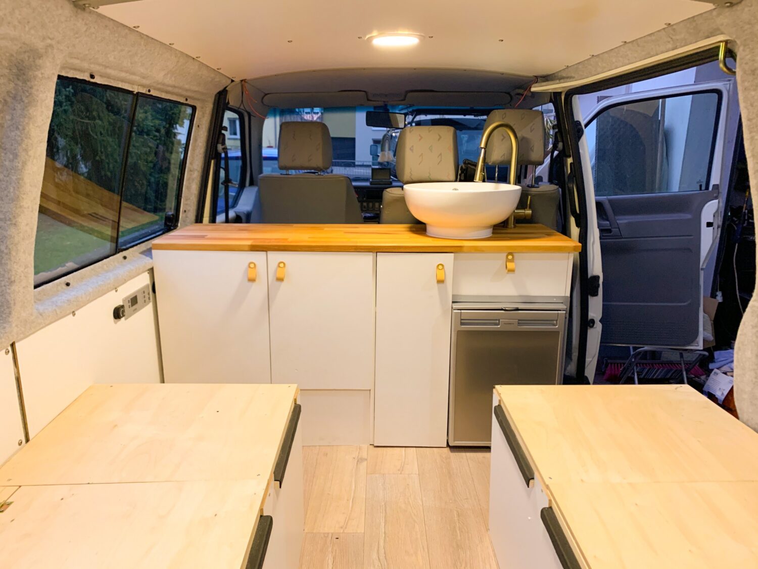 Der Ausbau hat 18 Arbeitstage gedauert. Wir haben eine Standheizung, Toilette, eine Außendusche, einen Kühlschrank mit Gefrierfach und einen mobilen Gaskocher. Das Waschbecken mit goldenem Wasserhahn ist unser Highlight. Unsere sitzecke kann man durch den herunterklappbaren Tisch zu einem Bett umbauen. Durch ein Solar Panel und eine 280 ah AGM Batterie können wir recht lange Autark stehen. Wir haben 10.000€ für Bus & Ausbau bezahlt.