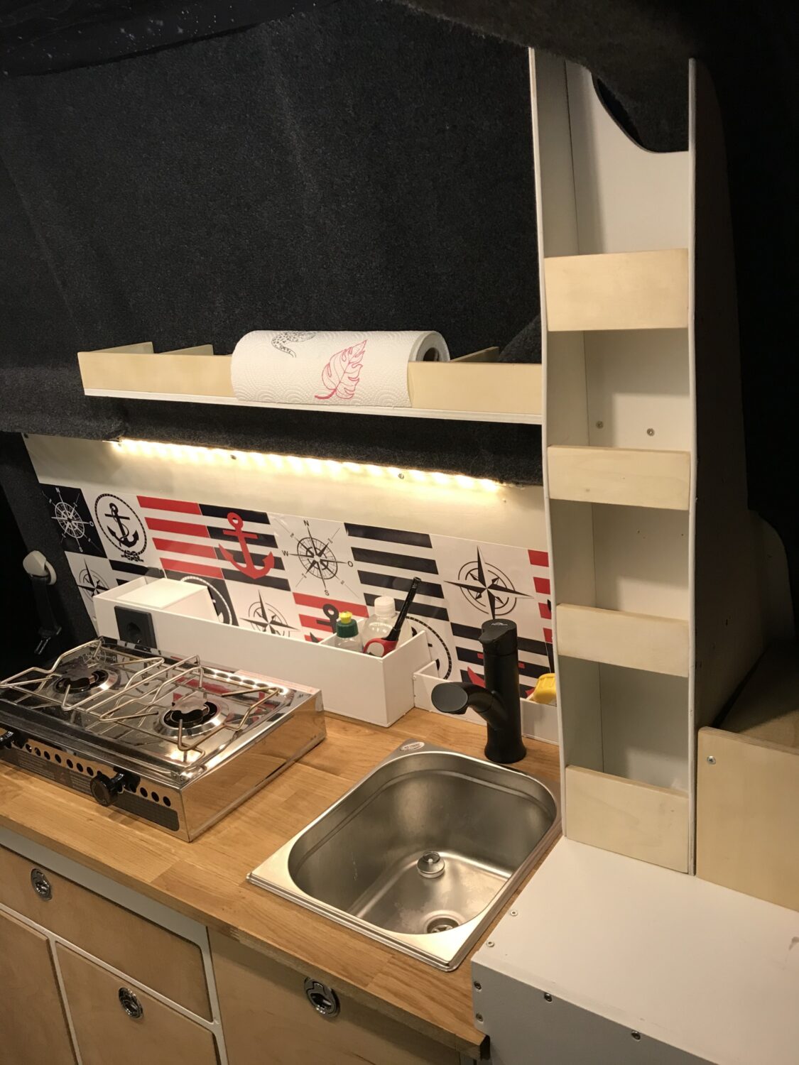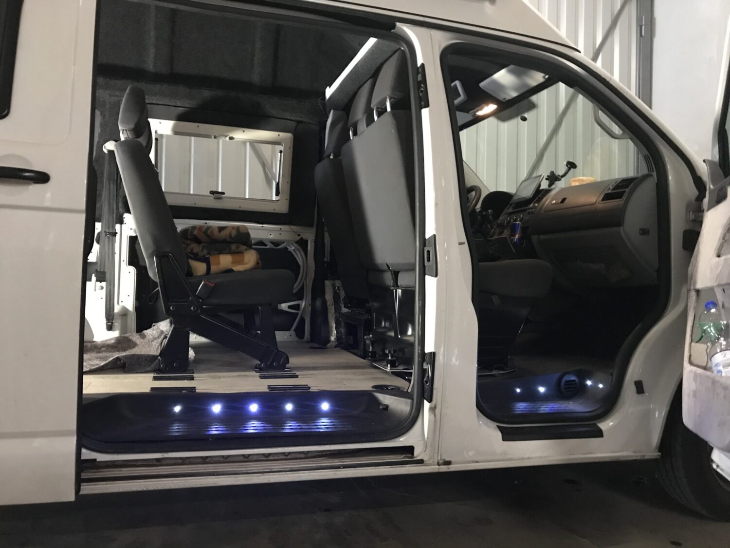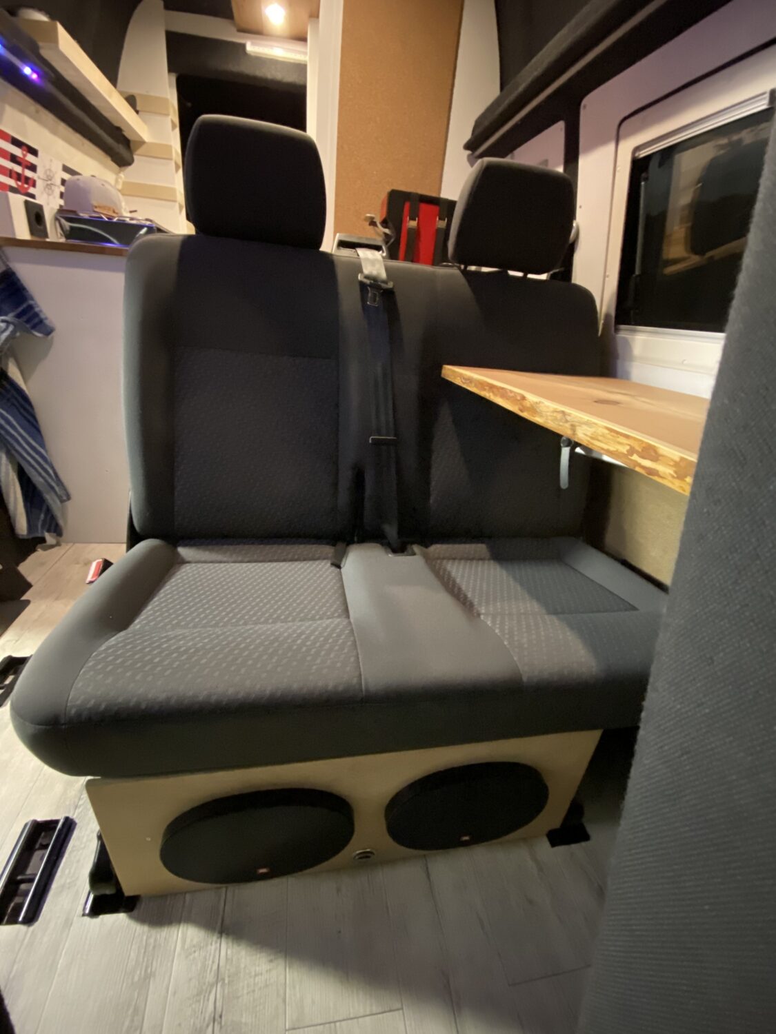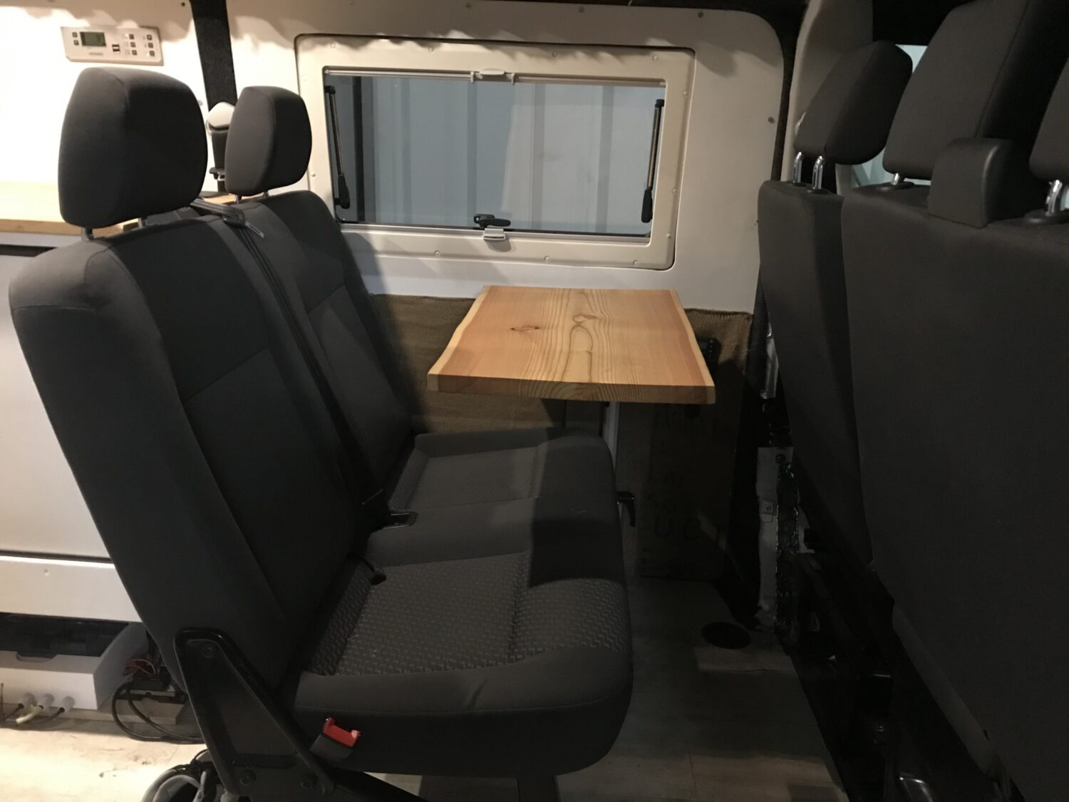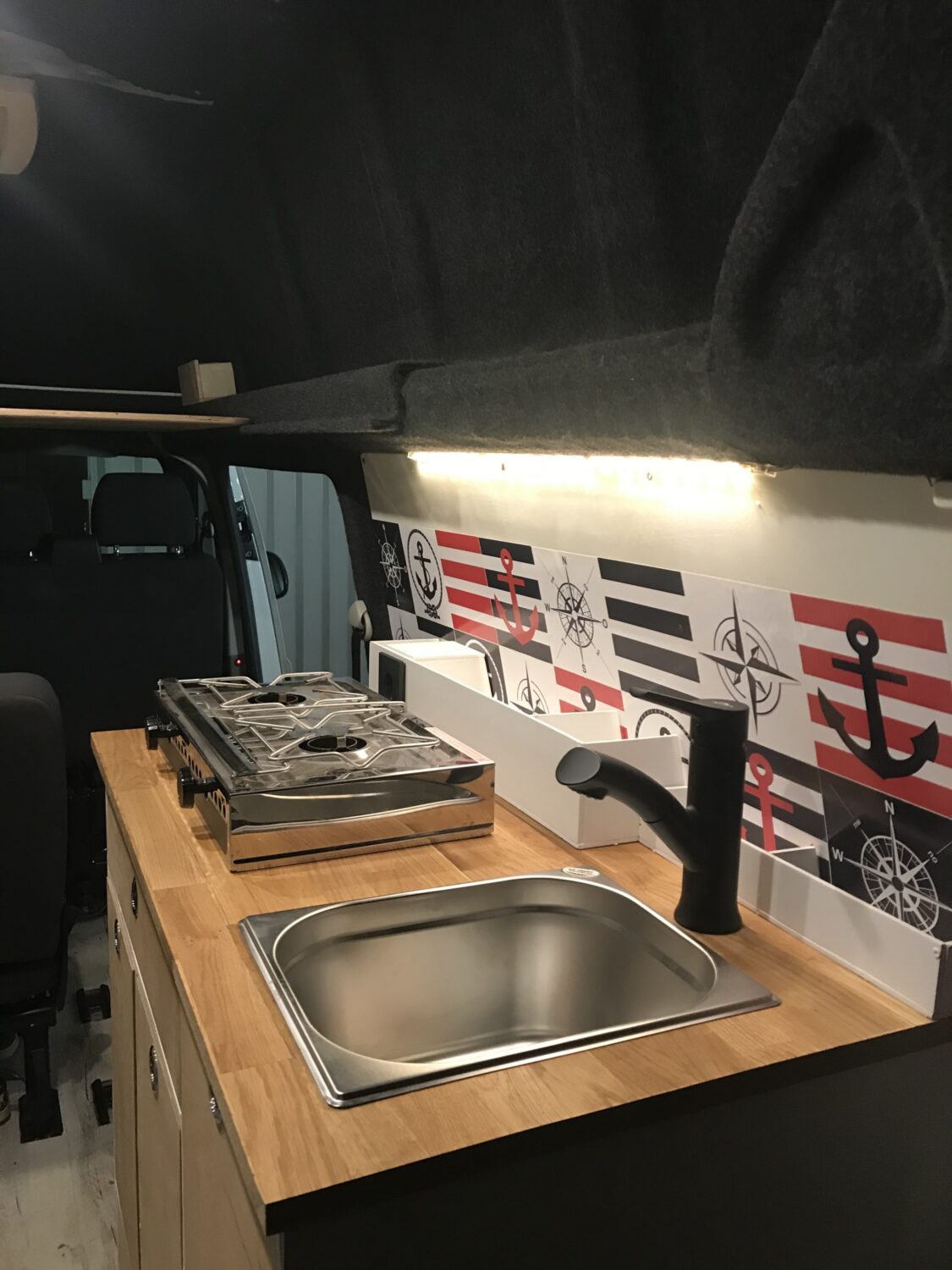 Wir sind seit knapp einem Jahr am Ausbau. Verbaut sind in unserem Benni eine zweite Sitzreihe, vorne unter den Sitzen haben wir Drehkonsolen und so haben wir eine riesige Sitzecke wenn wir stehen. An Elektrik haben wir eine Lifepo4 Batterie mit 100ah verbaut, ein 150 Watt Solarpanel, 30A Ladebooster, 1500 Watt Wechselrichter. Für das Wasser haben wir einen 80 Liter Tank und einen 20 Liter Warmwasserboiler der über Strom (230v) oder den Kühlwasserkreis vom Motor betrieben wird, das ganze wird für die innen und die Außendusche benötigt. Besonders stolz sind wir auf unsere Küchenzeile mit großer Spüle, Spirituskocher und viel Stauraum. Lustige Features an Bennie sind die eingebaute Beleuchtung die man auch zum Party machen verwenden kann mit der integrierten Musik Anlage oder unsere beleuchteten Schränke und Auszüge. Auch eine Besonderheit ist der Aufbau innen mit Dusche und einem Bett im Hochdach, haben wir bisher selten so gesehen.