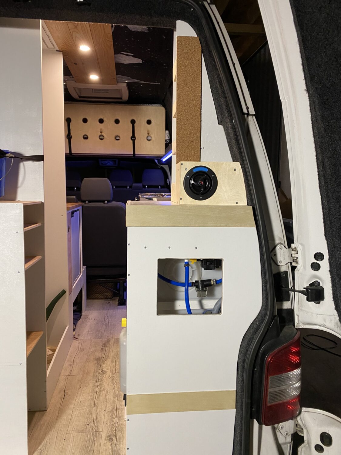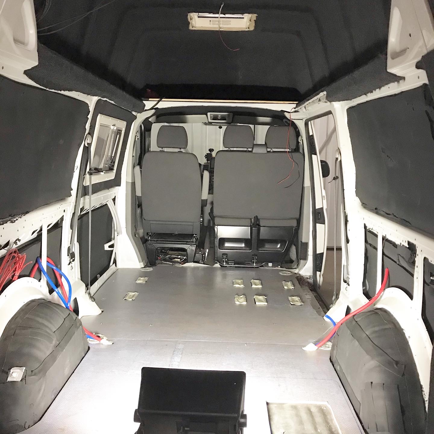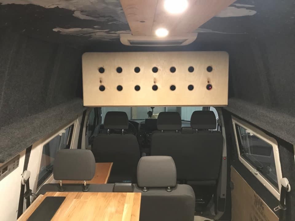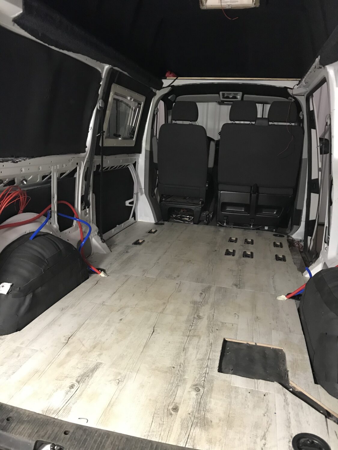 Wir sind seit knapp einem Jahr am Ausbau. Verbaut sind in unserem Benni eine zweite Sitzreihe, vorne unter den Sitzen haben wir Drehkonsolen und so haben wir eine riesige Sitzecke wenn wir stehen. An Elektrik haben wir eine Lifepo4 Batterie mit 100ah verbaut, ein 150 Watt Solarpanel, 30A Ladebooster, 1500 Watt Wechselrichter. Für das Wasser haben wir einen 80 Liter Tank und einen 20 Liter Warmwasserboiler der über Strom (230v) oder den Kühlwasserkreis vom Motor betrieben wird, das ganze wird für die innen und die Außendusche benötigt. Besonders stolz sind wir auf unsere Küchenzeile mit großer Spüle, Spirituskocher und viel Stauraum. Lustige Features an Bennie sind die eingebaute Beleuchtung die man auch zum Party machen verwenden kann mit der integrierten Musik Anlage oder unsere beleuchteten Schränke und Auszüge. Auch eine Besonderheit ist der Aufbau innen mit Dusche und einem Bett im Hochdach, haben wir bisher selten so gesehen.