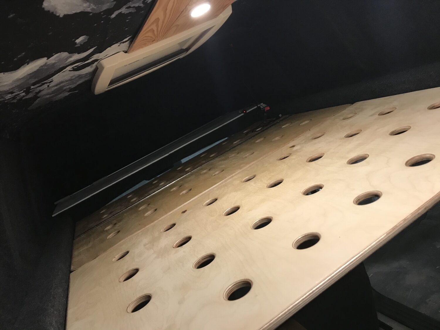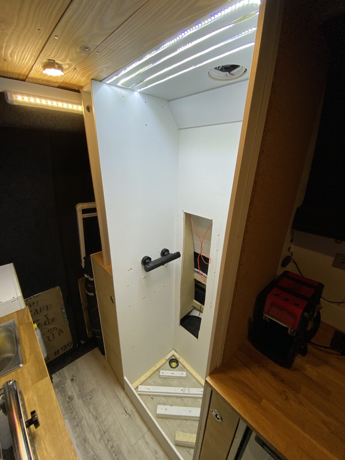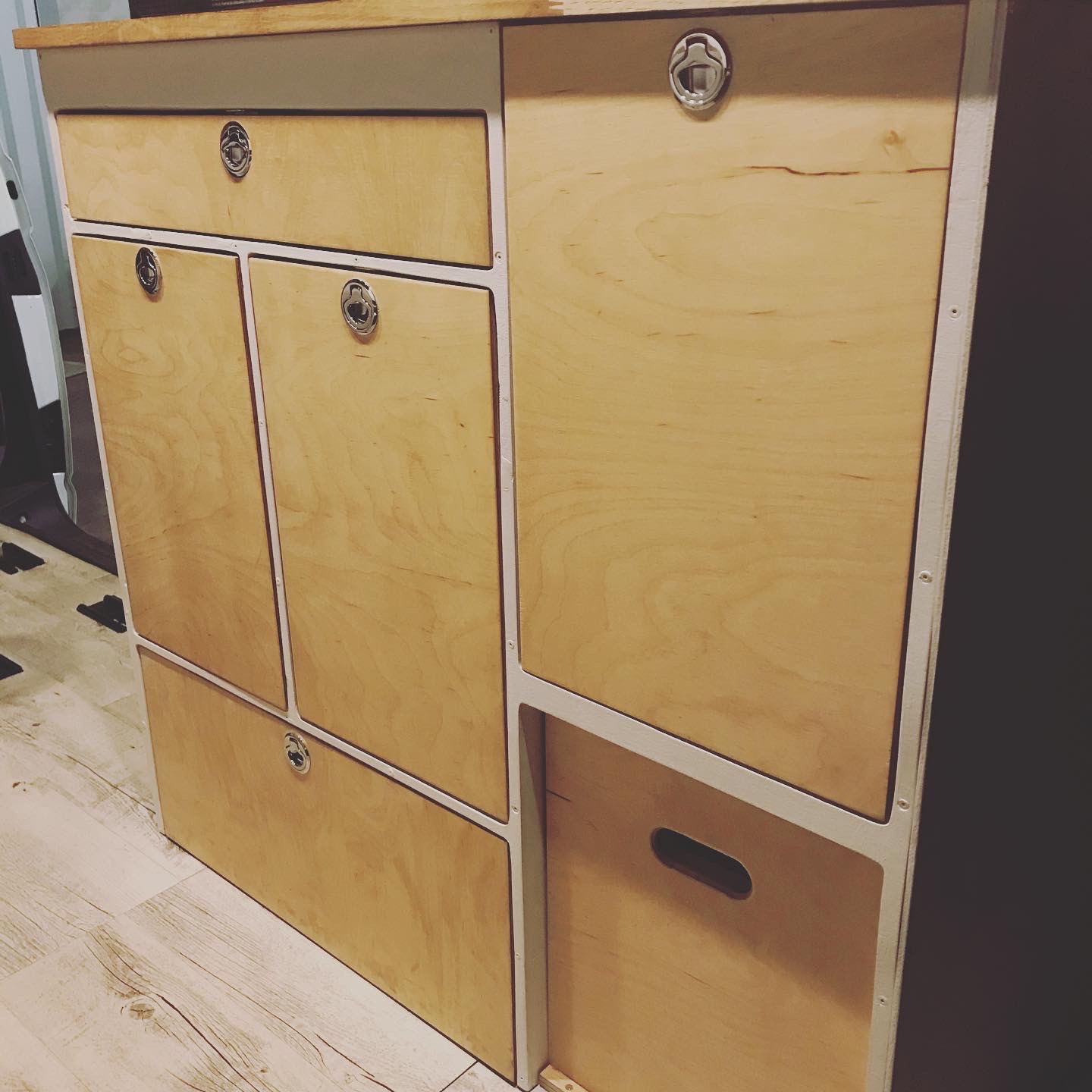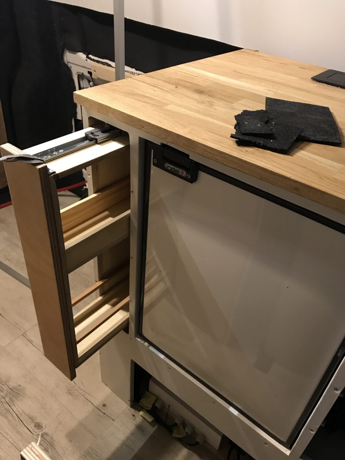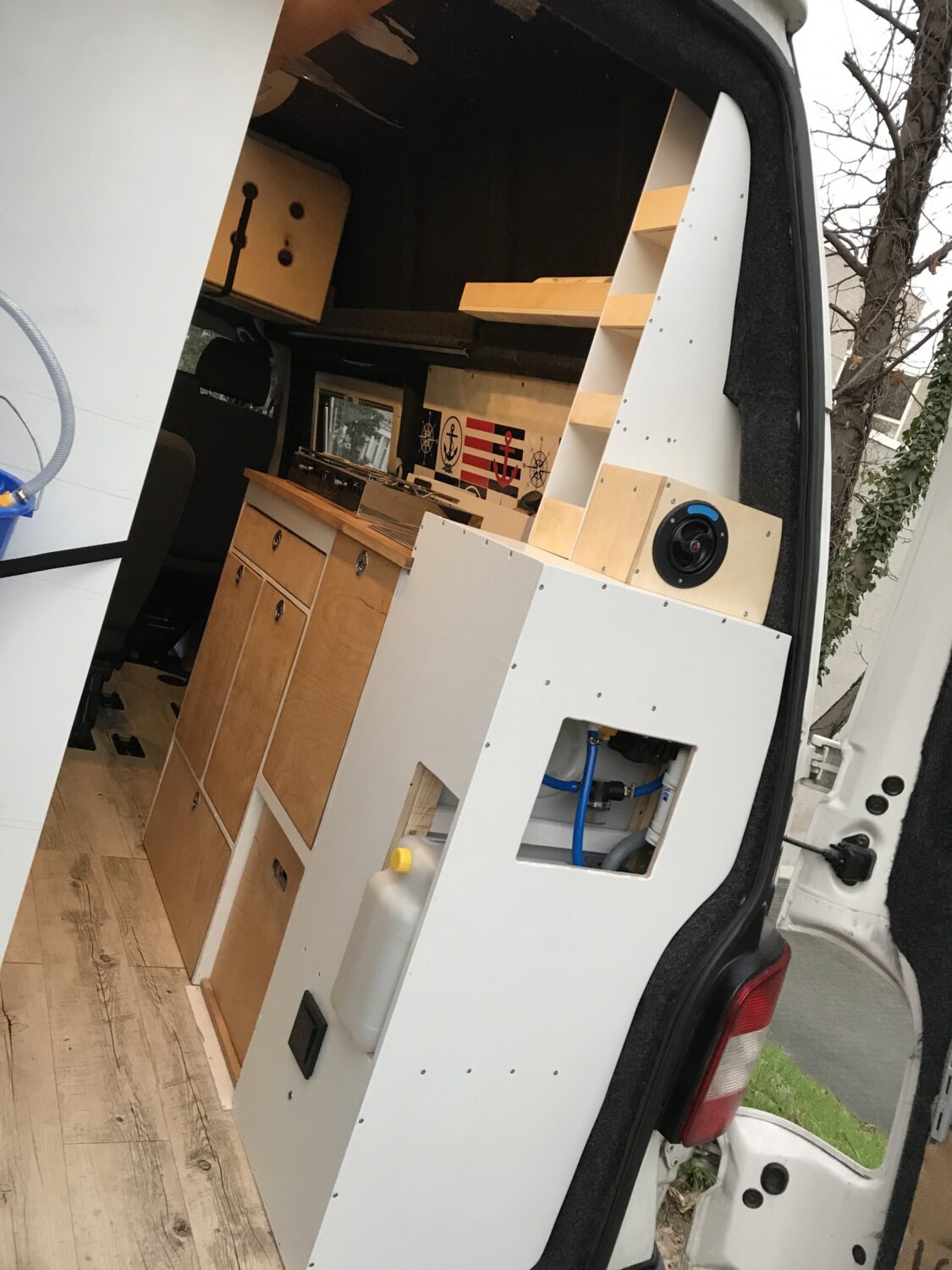 Wir sind seit knapp einem Jahr am Ausbau. Verbaut sind in unserem Benni eine zweite Sitzreihe, vorne unter den Sitzen haben wir Drehkonsolen und so haben wir eine riesige Sitzecke wenn wir stehen. An Elektrik haben wir eine Lifepo4 Batterie mit 100ah verbaut, ein 150 Watt Solarpanel, 30A Ladebooster, 1500 Watt Wechselrichter. Für das Wasser haben wir einen 80 Liter Tank und einen 20 Liter Warmwasserboiler der über Strom (230v) oder den Kühlwasserkreis vom Motor betrieben wird, das ganze wird für die innen und die Außendusche benötigt. Besonders stolz sind wir auf unsere Küchenzeile mit großer Spüle, Spirituskocher und viel Stauraum. Lustige Features an Bennie sind die eingebaute Beleuchtung die man auch zum Party machen verwenden kann mit der integrierten Musik Anlage oder unsere beleuchteten Schränke und Auszüge. Auch eine Besonderheit ist der Aufbau innen mit Dusche und einem Bett im Hochdach, haben wir bisher selten so gesehen.
