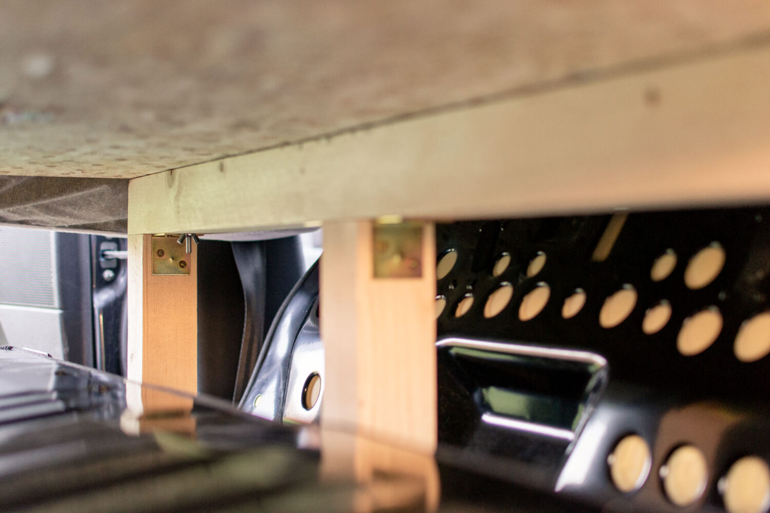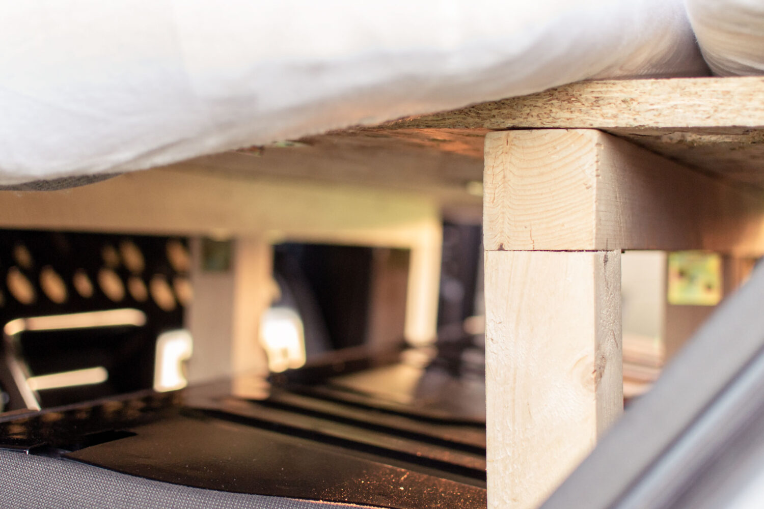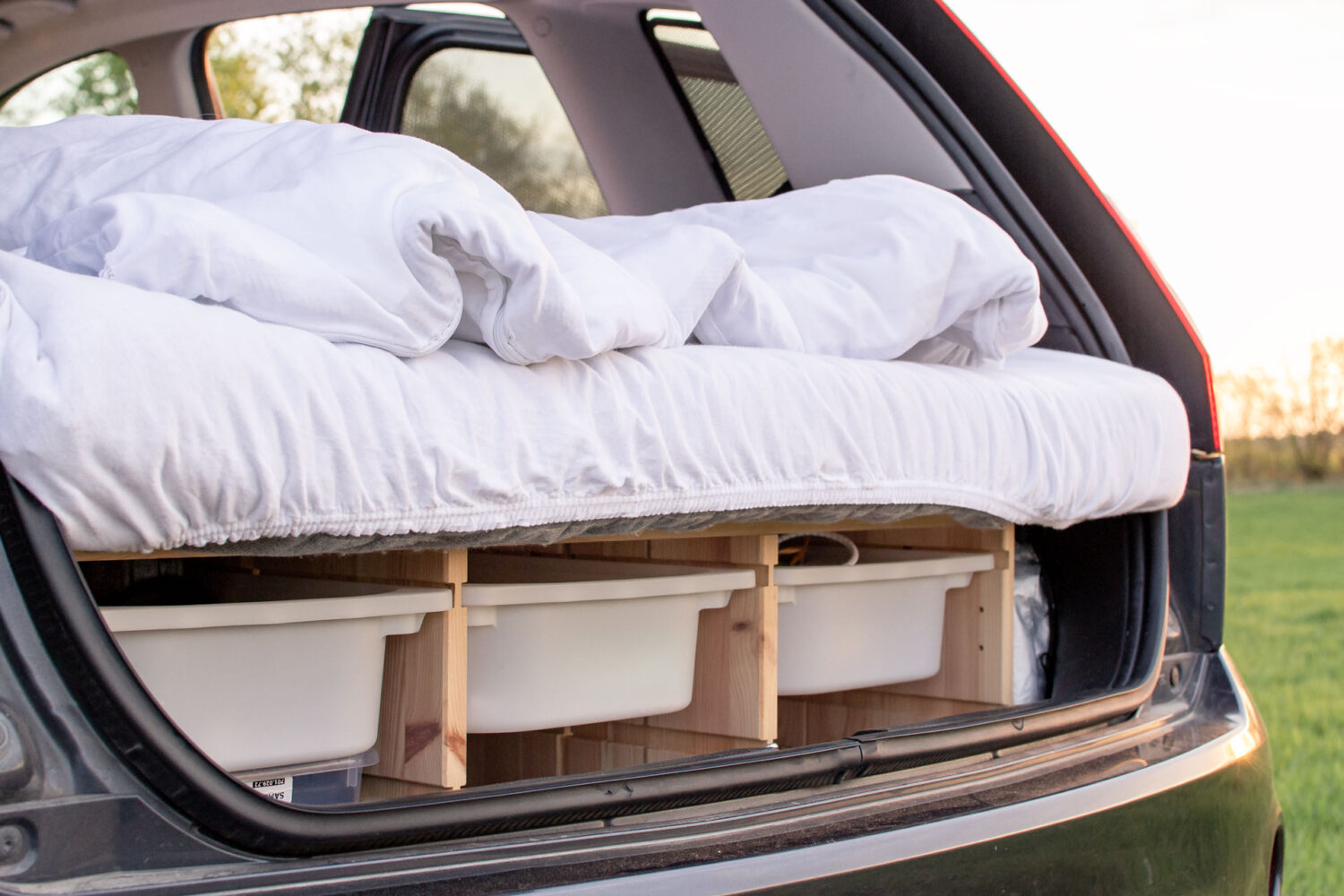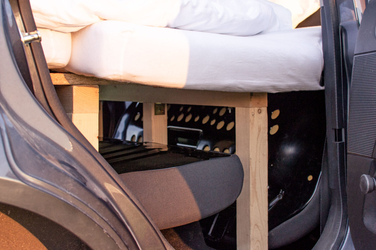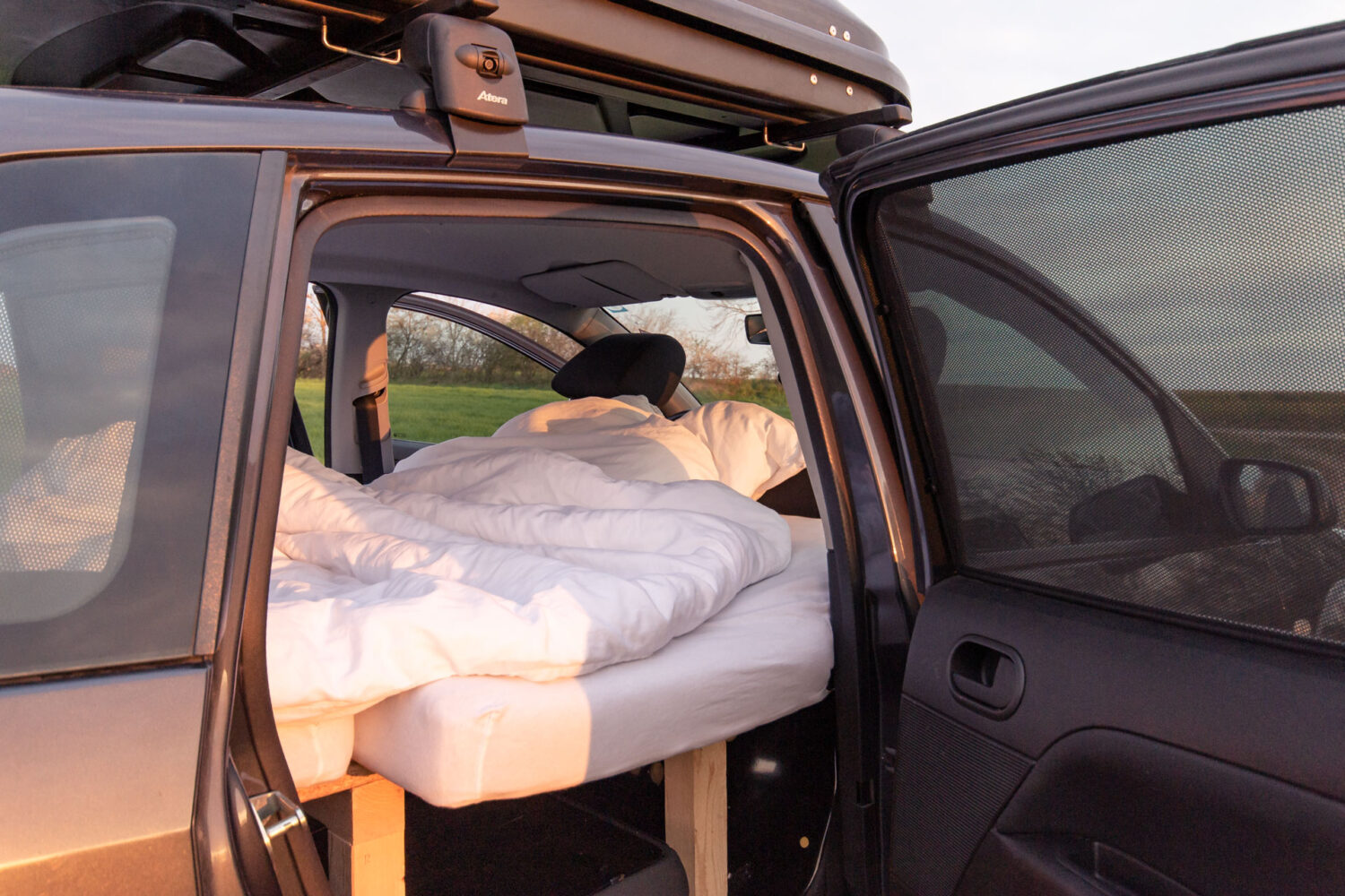 Der Ausbau hat bisschen mehr als eine Woche gedauert von der Planung bis zur Fertigstellung. Das ganze war auch sehr günstig ~ 200€. Wichtig war, dass sich das Bett leicht auf und abbauen lässt und nichts am Auto verschraubt werden muss.