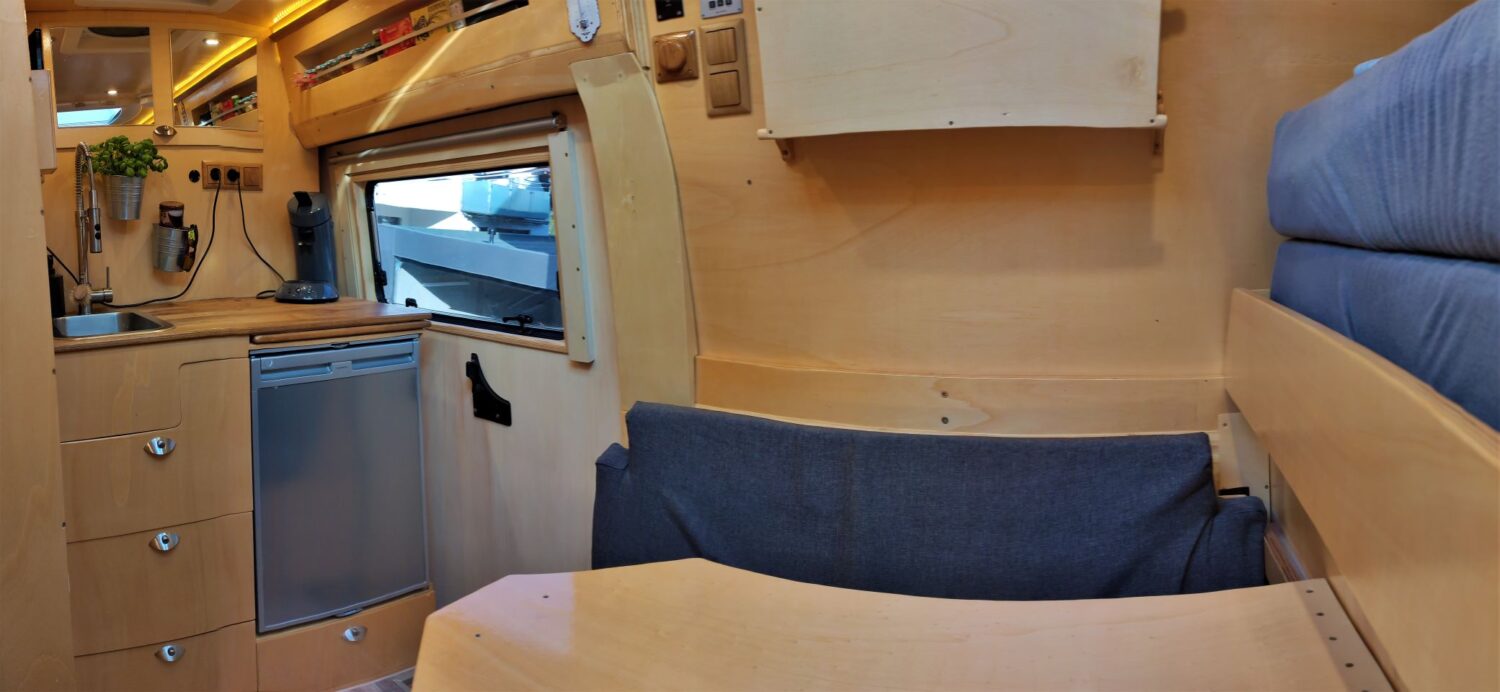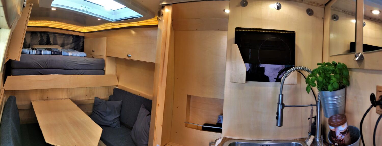 Die letzten 2 Jahre habe ich „den Kleinen- ausgebaut. Ich bin Maschinenbau-Ingenieur und habe beruflich viele Jahre Erfahrung im Fahrzeugausbau. Der Ausbau ist mit viel Liebe zum Detail und ohne Kompromisse in der Qualität geplant und umgesetzt. Bevor ich weiter unten genauer beschreibe hier eine Zusammenfassung der wichtigsten Eckpunkte: - Ideal für große Personen (Liegefläche Bett 2,10 m x 1,40 m, Stehhöhe 2 m) - Absolut wintertauglich durch wärmebrückenfreie Isolierung und Dieselstandheizung - Gasfrei mit Induktionskochfeld - 300 W Solar, 3 kW Wechselrichter, 280 Ah LiFePo4 Akku - Dusche & Trenntoilette - 120 L Frisch- / Abwasser, winterfest, da im Innenraum verbaut - 4 Schlafplätze (Hauptbett 2,10 m x 1,40 m, Gästebett 1,90 m x 1,10 m) - Riesige Heckgarage (2 Bikes +6 x 40 x 60 cm Euroboxen) - Großer Tisch für 4 Personen - Großer Kühlschrank Basisfahrzeug: Modell: Peugeot Boxer H3L3 Baujahr: 2016 Leistung: 160 PS Kilometerstand: ca. 180.000 KM (150.000 KM als Lieferfahrzeug im Langstreckenbetrieb daher sehr guter Zustand) Antrieb: 6-Gang Handschaltung Abmessungen: Höhe 2,90 m Länge 5,95 m Besondere Ausstattung Berganfahrassistent, Rückfahrkamera, Klimaanlage, 3 Sitzplätze, 8-fach bereift, Navi, abnehmbare Anhängerkupplung Elektronik Der „Votronic VBCS Triple 60/40/430 Battery Charger- lädt die Aufbau-Batterie über die Lichtmaschine, Solar oder Landstrom. Auch die Starterbatterie wird mitgeladen. Ein „3 kW Reiner Sinuswechselrichter- versorgt die Steckdosen mit 230 V, auch wenn kein Landstrom vorhanden ist. Der „Dometic CRX 80- Kompressor-Kühlschrank ist sehr effizient und wird ausschließlich mit 12 V betrieben. Er besitzt ein Gefrierfach, welches bei Bedarf entnommen werden kann. Ein „MaxxAir Fan- sorgt dafür das, egal ob es draußen regnet oder heiß ist, auch bei geschlossenen Fenstern immer genug frische Luft ins Fahrzeug gelangt. Zudem ist er über der Küchenzeile auch ein perfekter Dunstabzug! Insgesamt 300 W Solar sorgen für volle Batterien. 8 separat steuerbare 3 W LED Spots lassen den Innenraum hell erstrahlen. Für die romantische Stimmung sorgt eine dimmbare indirekte LED Ambientebeleuchtung. Steckdosen mit 12 V und 230 V an allen Stellen, wo sie gebraucht werden. Ein kombinierter C02 und Rauchmelder sorgt für Sicherheit Eine 280 Ah-„LiFePo4 Batterie- versorgt alles mit genug Power für viele Tage autarkes Stehen. Wasser Zum autarken Leben im Camper gehört auch genügend Wasser. 120 L Frischwasser sowie 120 L Grauwassertank sorgen dafür, dass man auch über mehrere Tage autark campen kann. Die Tanks und Leitungen sind alle im geheizten Innenraum verbaut sodass sie im Winter nicht gefrieren können. Das Wasser wird durch eine Druckwasserpumpe befördert. Der Warmwasserboiler ist in Kombination mit der „Planar 4D Standheizung- ein Highlight unseres Campers. Durch die Standheizung wird das Wasser in etwa 45 Minuten erwärmt und ermöglicht auch im tiefsten Winter eine warme Dusche. Wenn die Standheizung mal nicht läuft kann durch 230 V vom Wechselrichter der Boiler geheizt werden. Das Spülbecken verfügt über eine hochwertige Armatur mit Brause-Funktion. In der Heckgarage befindet sich noch ein Wasseranschluss für einen Gartenschlauch, der sich perfekt für eine Außendusche oder um die Bikes ab zu spritzen eignet. Isolation / Heizung Der ganze Wohnraum ist mit 19 mm Armaflex isoliert. Bei dem Aufbau wurde darauf geachtet das keine Wärmebrücken vorhanden sind. So wurden auf die Holme sehr feuchtigkeitsresistente Duglasienlatten geklebt, in welche die Innenverkleidung verschraubt ist. So ist NICHT -wie sonst so oft- eine Bohrschraube im Blech, welche sicher nach kurzer Zeit rostet. Durch die vorhandene Trennwand, die ebenfalls isoliert ist, wird der Innenraum von den ungedämmten Flächen (Scheiben, Bleche) der Fahrerkabine getrennt. Eine 4 kW-„Planar 4D Dieselstandheizung- heizt wahlweise in den Innenraum oder die Dusche. Somit kann die Dusche auch perfekt als Trockenkammer genutzt werden. Sonstiges Im Dach sorgt ein großes 90 x 60 cm Panorama-Dachfenster mit Fliegengitter und Verdunkelung für viel Licht. Es kann -ohne das Fliegengitter zu öffnen- mit einer Kurbel geschlossen werden (sehr praktisch um keine Mücken reinzulassen! 😉). In der Seitentür sorgt ein weiteres Fenster für Aussicht. Das Bett lässt sich mit wenigen Handgriffen ausziehen und bietet dann mit 2,10 m Länge und 1,40 m Breite genug Platz - auch für große Personen. Die Sitzganitur unter dem Bett lässt sich zu einer weiteren Liegefläche mit 1,90 m x 1,10 m umbauen. Allgemein ist der Ausbau für große Personen bestens geeignet (ich selbst bin 1,93 m). Die Trenntoilette hat ein sehr großes Fassungsvermögen und kann, da sie keine Chemie benötigt, an jedem Rastplatz oder jeder Toilette entleert werden. Feststoff kann als Restmüll behandelt werden (glaubt mir es ist viel, viel angenehmer als eine Kasettentoilette!!!). Für einen Schattenplatz vor dem Fahrzeug sorgt ein Sonnensegel, das schnell aufgebaut ist und ansonsten klein verpackt in der Heckgarage Platz findet (so sieht das Fahrzeug nicht schon auf den ersten Blick nach Camper aus). Im Innenraum wurde an allen erdenklichen Plätzen Stauraum geschaffen, 2 große Fächer im Zwischenboden, riesiger Stauraum über der Küchenzeile, Oberschränke, Schubladen, leere Sitzkisten, usw. So ist immer alles sofort griffbereit! In die Heckgarage passen 2 Mountain-Bikes und 6 große Euroboxen und es findet sich immer noch genügend Platz für Auffahrkeile, Campingstühle und -tische! Der Van ist das perfekte Basislager für Abenteuerlustige, die sich fern von Campingplätzen stellen möchten und dem Drang nach Freiheit ungehindert nachgehen möchten und das zu jeder Jahreszeit!