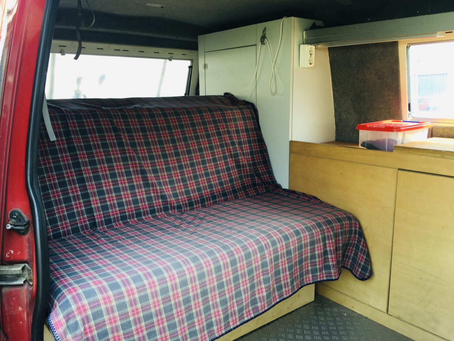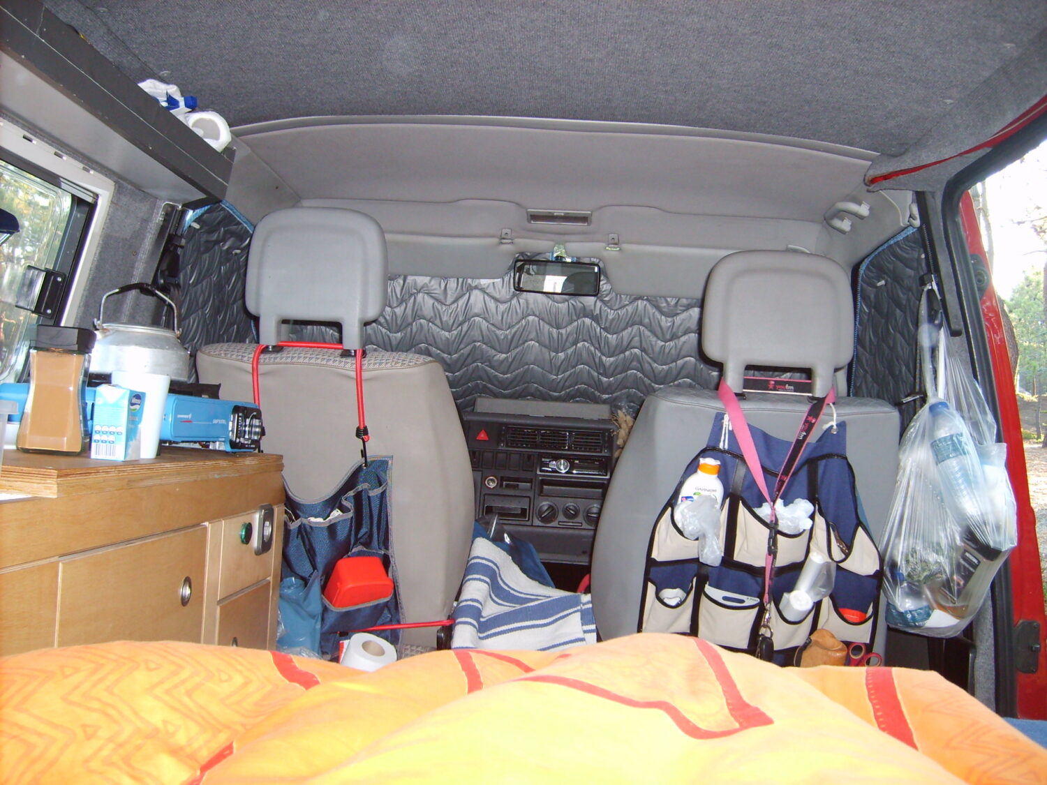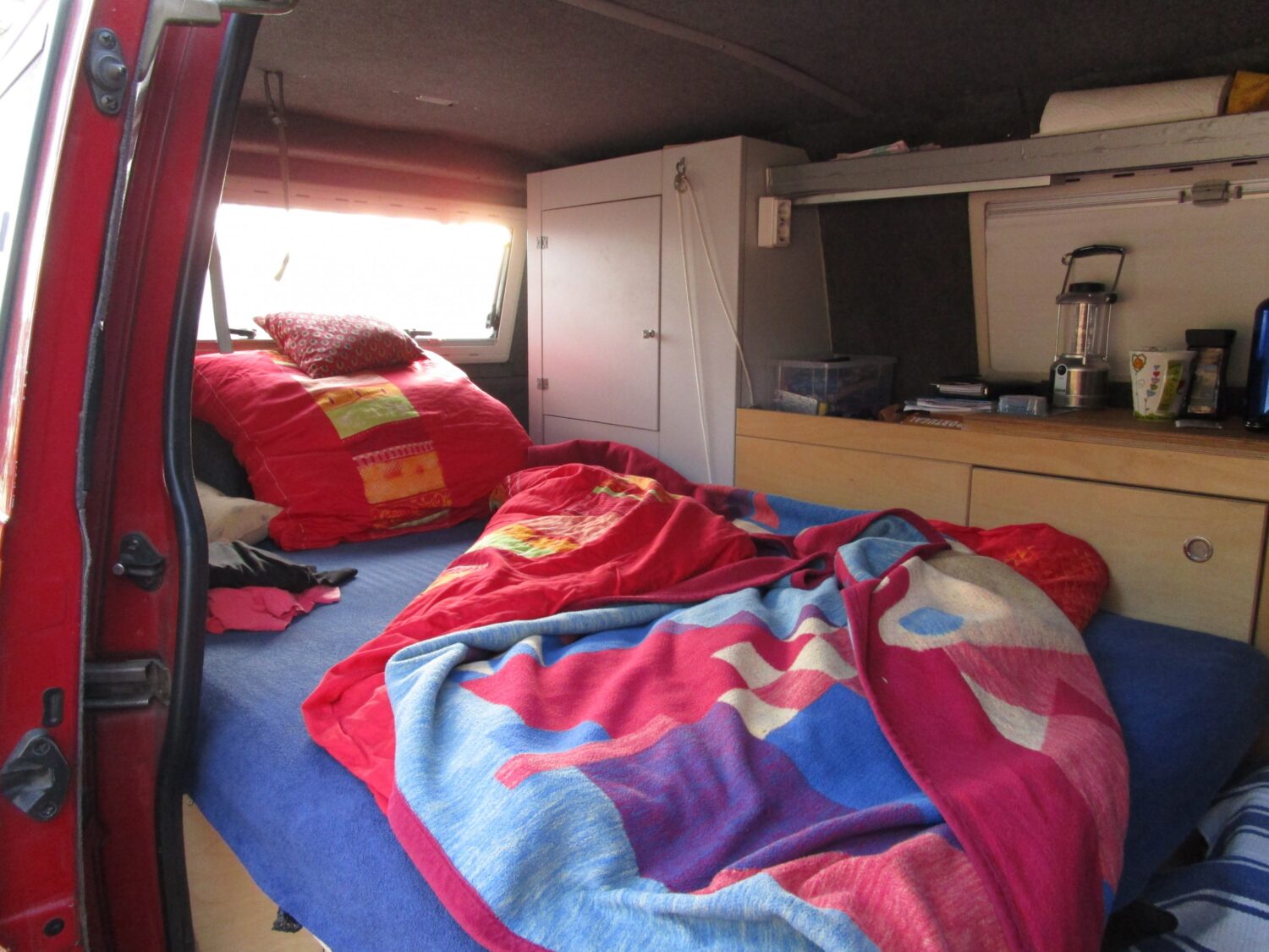 Der Bus ist als LKW zugelassen und war komplett ausgebaut als ich ihn kaufte. Beim nächsten TÜV bekam ich wagenmangelnder Stehhöhe keinen TÜV für Campingbus, wegen mangelnder Trennwand keinen für LKW und weil nur 2 Sitzplätze eingetragen sind, keinen für Pkw. So baute ich die Kochzeile wieder aus, eine Platte wieder ein, und koche nur noch mit dem mobilen Gaskocher. Im Schrank ist ein faltbarer Wassersack und eine Schüssel. Und schwups, ging der Bus wieder als LKW durch. Die umklappbare Bank war sehr Rückenunfreundlich. Die Konstruktion für das Bett begeistert mich immer wieder, welche mein Sohn einbaute: mit einem Handgriff ist eine Fläche von 200 auf 120 mit einer fantastischen Matratze, die jedem Bandscheibengepeinigten Menschen wunderbare Nachtruhe beschert. Die medizinische Matratze wurde viergeteilt, bezogen und mit Klettband versehen, so dass die Teile nicht verrutschen können. Oben drauf habe ich noch eine dicke Matratzenunterlage von Tchibo gelegt. Die wird nicht mitgeliefert. Der Fahrersitz verfügt über Armlehnen, Beifahrersitz ist drehbar, die Schiebefenster rechts und links hinten im Bulli sind mit Moskitonetz und Verdunkelung versehen, sowie das hintere Aufstellfenster. Mitgeliefert werden zwei Lüftungsgitter für die vorderen Seitenscheiben und Isoliermatten für die Front- und Seitenscheiben. Radio- und CD Player, Tempomat. Fahrradträger für zwei Fahrräder. Winter- und Sommerreifen sind auf Felgen. TÜV 4/2022.