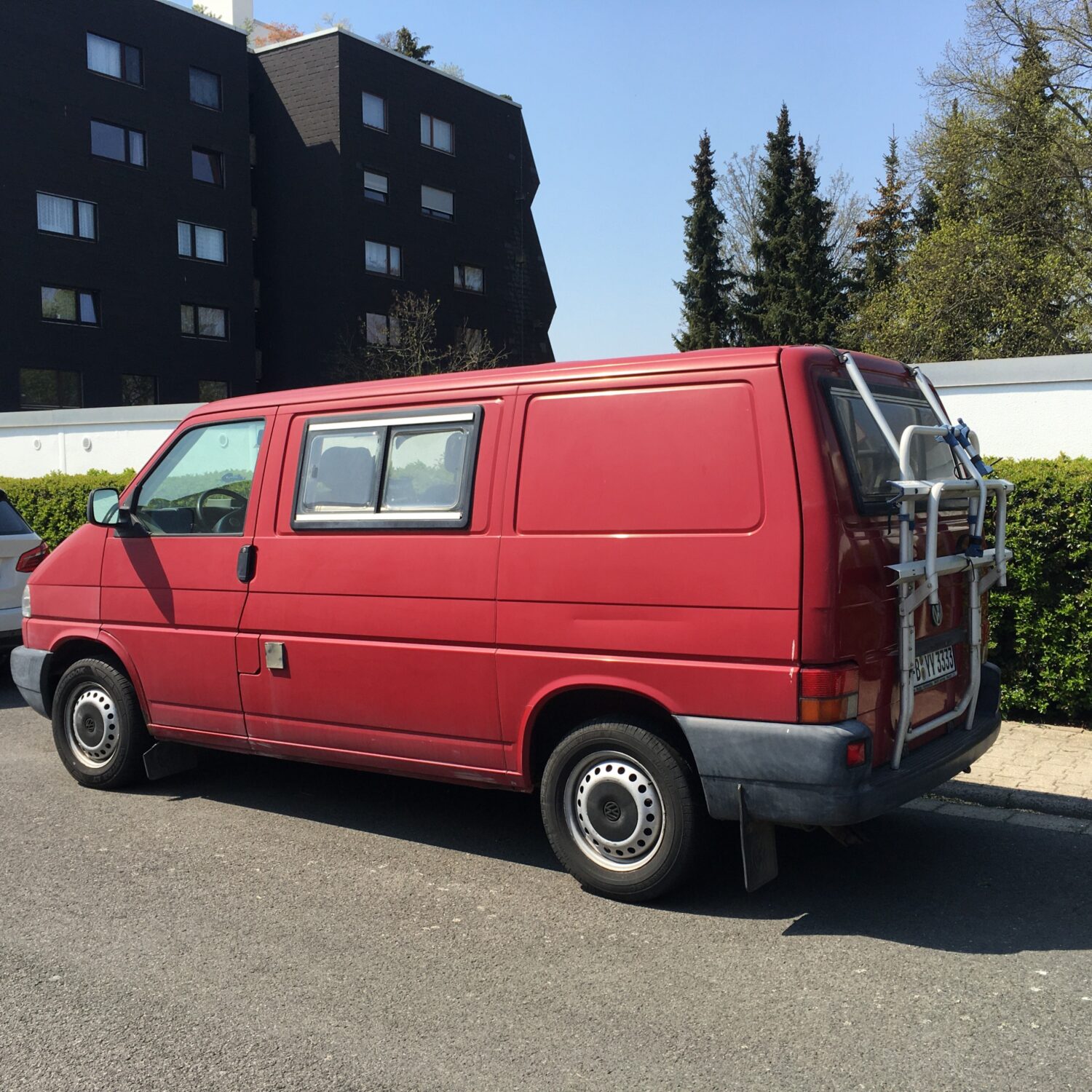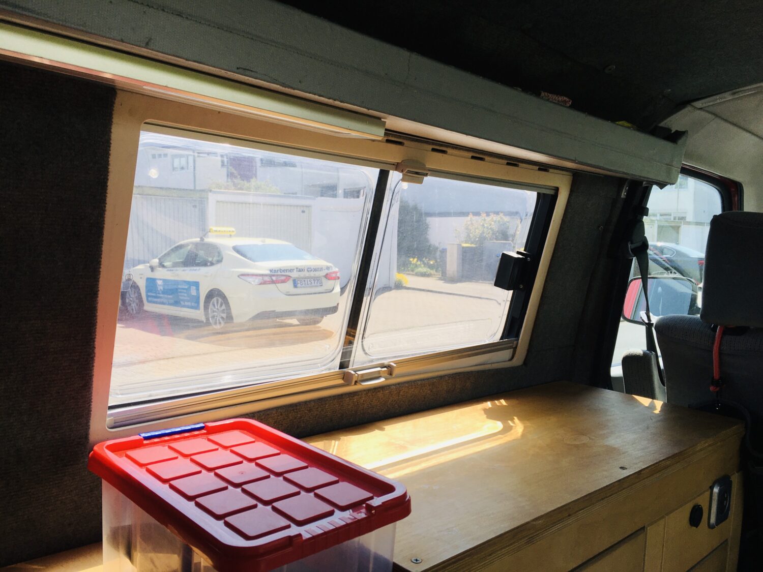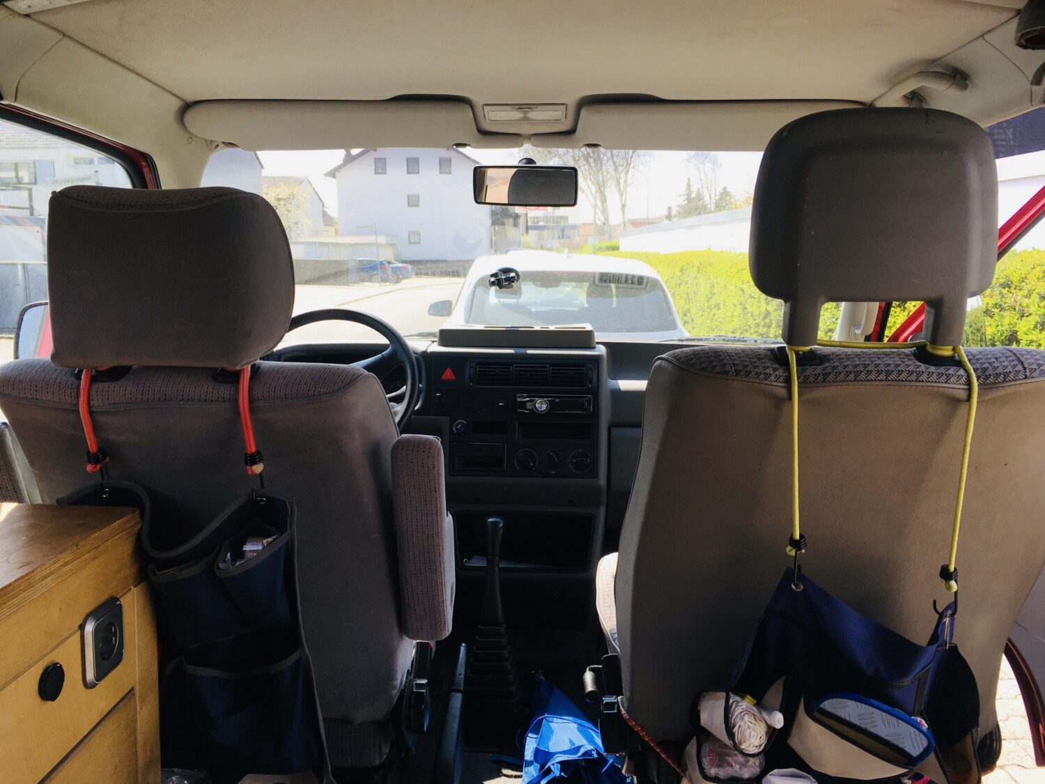 Der Bus ist als LKW zugelassen und war komplett ausgebaut als ich ihn kaufte. Beim nächsten TÜV bekam ich wagenmangelnder Stehhöhe keinen TÜV für Campingbus, wegen mangelnder Trennwand keinen für LKW und weil nur 2 Sitzplätze eingetragen sind, keinen für Pkw. So baute ich die Kochzeile wieder aus, eine Platte wieder ein, und koche nur noch mit dem mobilen Gaskocher. Im Schrank ist ein faltbarer Wassersack und eine Schüssel. Und schwups, ging der Bus wieder als LKW durch. Die umklappbare Bank war sehr Rückenunfreundlich. Die Konstruktion für das Bett begeistert mich immer wieder, welche mein Sohn einbaute: mit einem Handgriff ist eine Fläche von 200 auf 120 mit einer fantastischen Matratze, die jedem Bandscheibengepeinigten Menschen wunderbare Nachtruhe beschert. Die medizinische Matratze wurde viergeteilt, bezogen und mit Klettband versehen, so dass die Teile nicht verrutschen können. Oben drauf habe ich noch eine dicke Matratzenunterlage von Tchibo gelegt. Die wird nicht mitgeliefert. Der Fahrersitz verfügt über Armlehnen, Beifahrersitz ist drehbar, die Schiebefenster rechts und links hinten im Bulli sind mit Moskitonetz und Verdunkelung versehen, sowie das hintere Aufstellfenster. Mitgeliefert werden zwei Lüftungsgitter für die vorderen Seitenscheiben und Isoliermatten für die Front- und Seitenscheiben. Radio- und CD Player, Tempomat. Fahrradträger für zwei Fahrräder. Winter- und Sommerreifen sind auf Felgen. TÜV 4/2022.