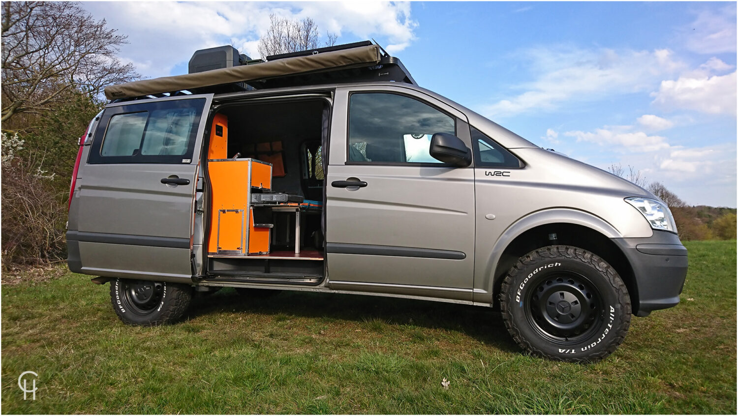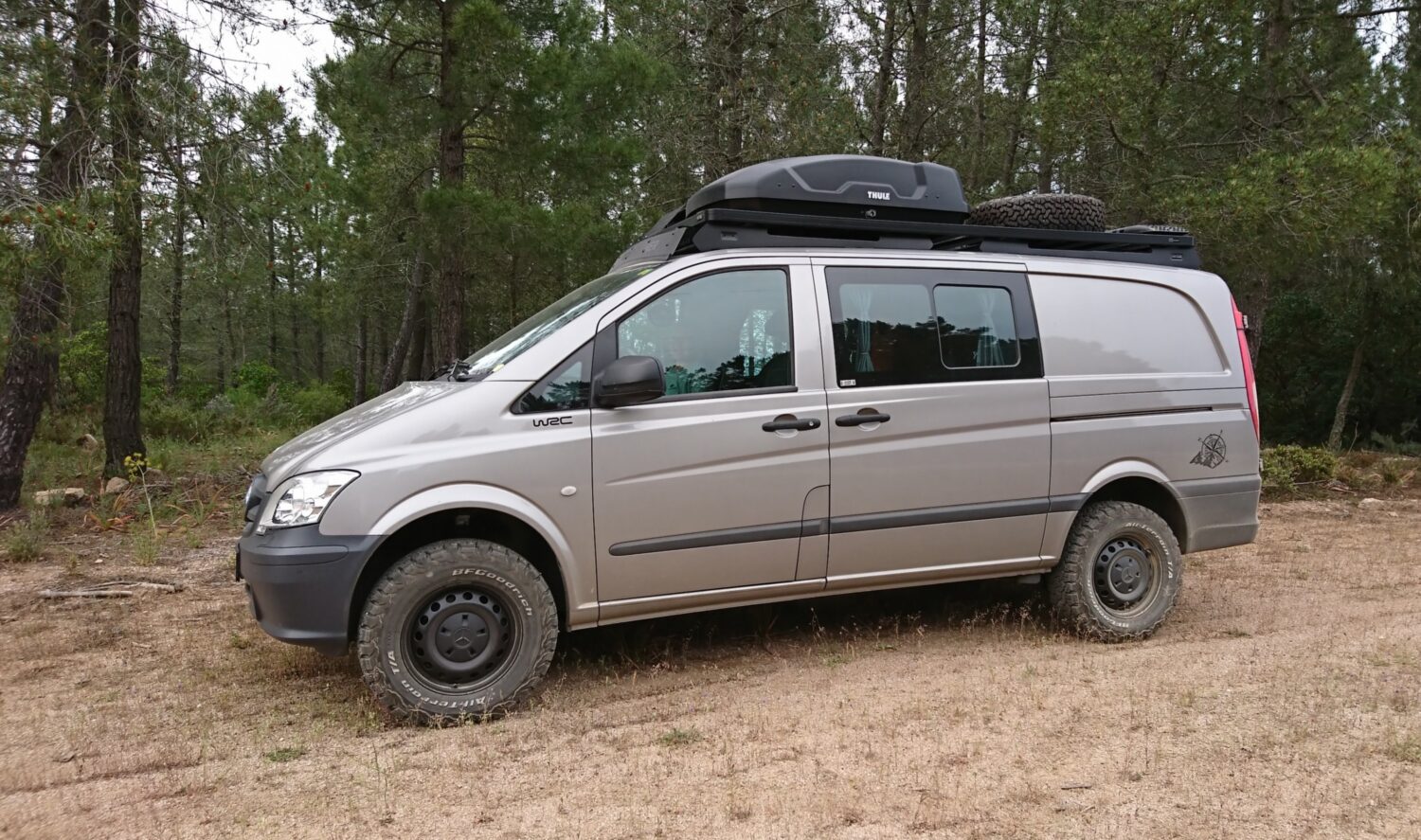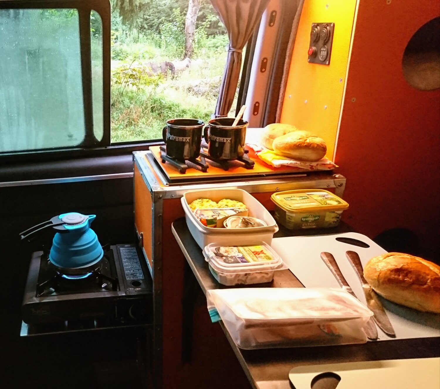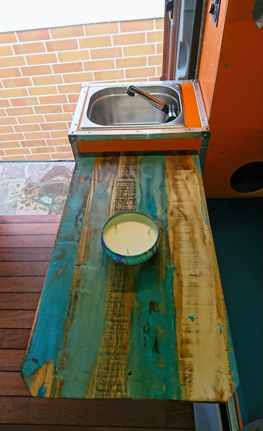 Wir haben aufgehört, die Stunden zu zählen, die wir mit dem Ausbau verbracht haben. Unser RICOBERT hat eine variable Bettkonstruktion mit integriertem Auszug aus Aluminium-Profilen. Die Möbel sind aus Flightcase-Material. Besonders stolz sind wir auf die kleinste Küche, die wir kennen - auf einer Grundfläche von 35x42 cm sind Wasserkanister, Spülbecken und Gaskocher untergebracht. Seit kurzem ist unser Bus 7 cm höhergelegt, hat fette AT-Reifen und einen Unterfahrschutz bekommen.