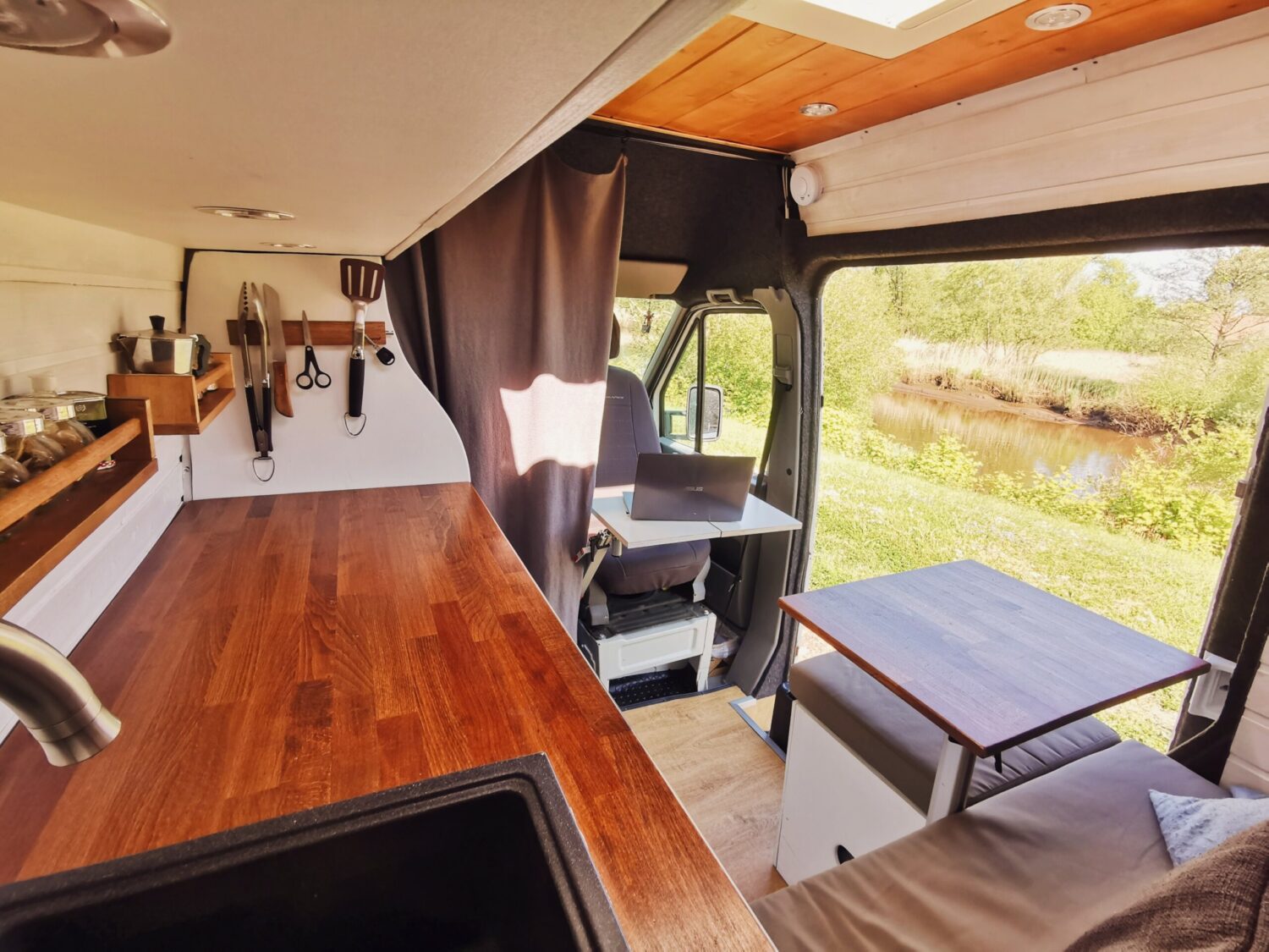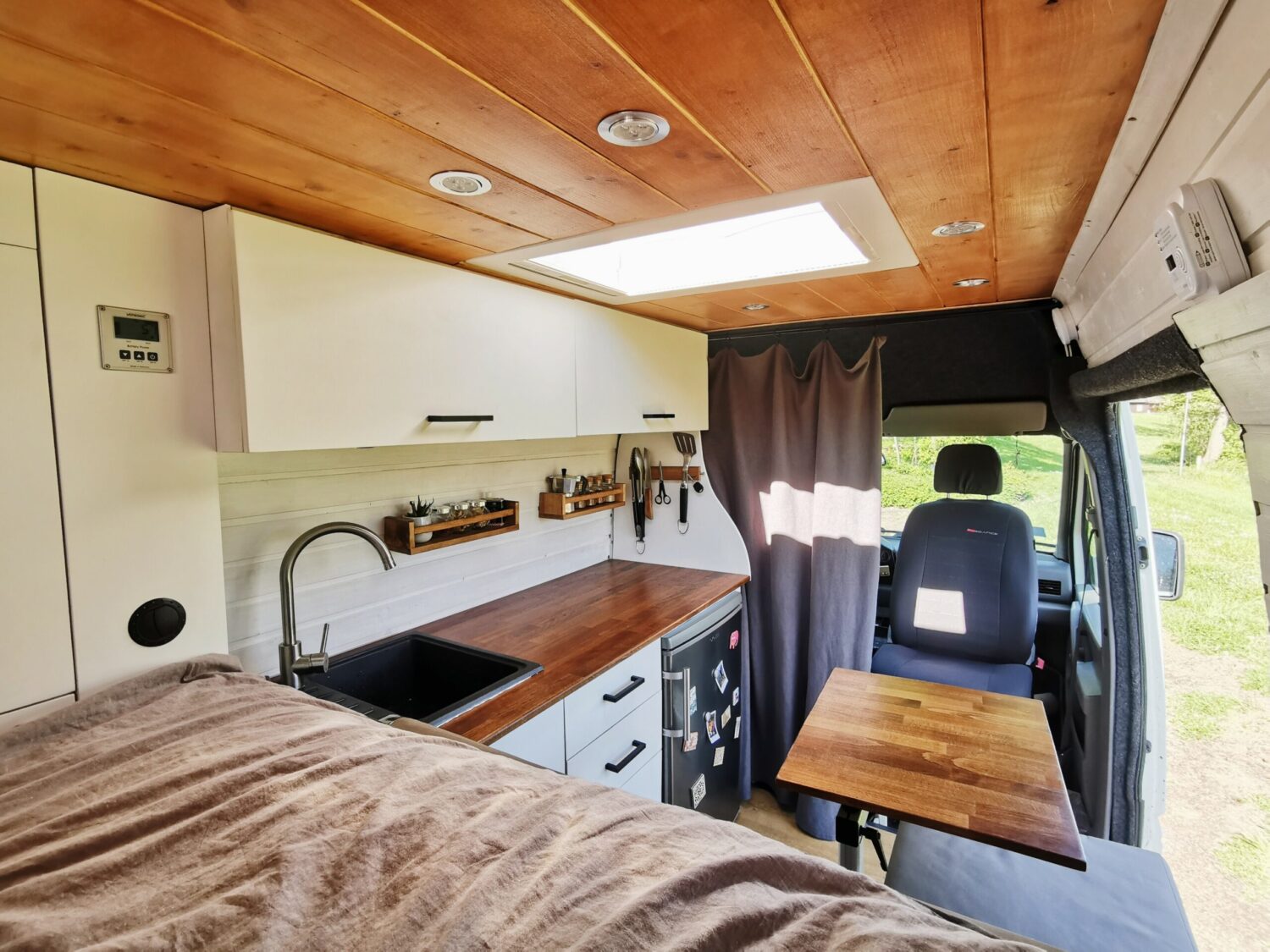 Besonders ist unser Bett, 1,93 Meter brauchen etwas mehr Platz. Unser Bett ist längs im Auto, muss allerdings nicht aufgebaut werden. So haben wir es bis jetzt noch nicht gesehen.