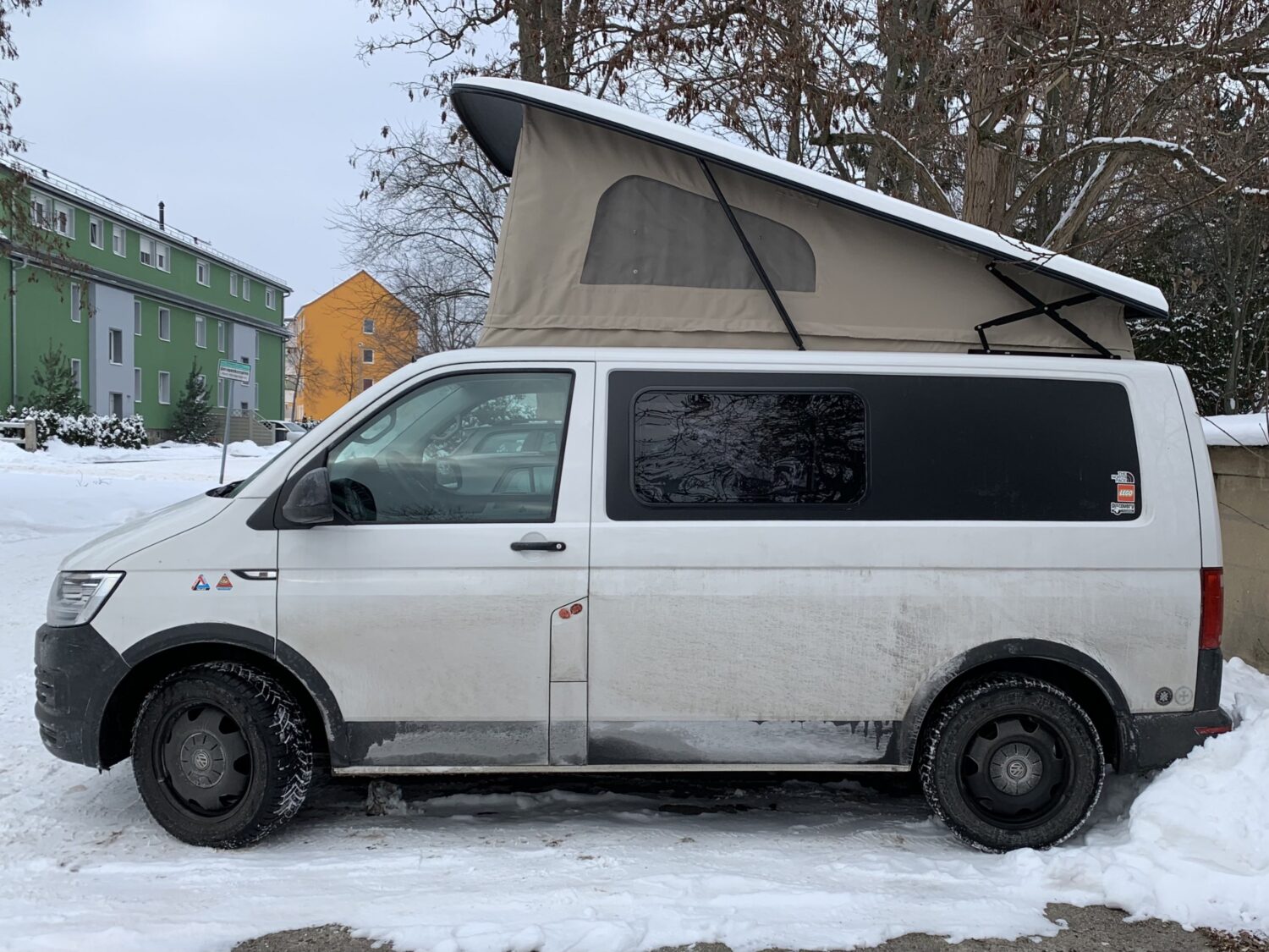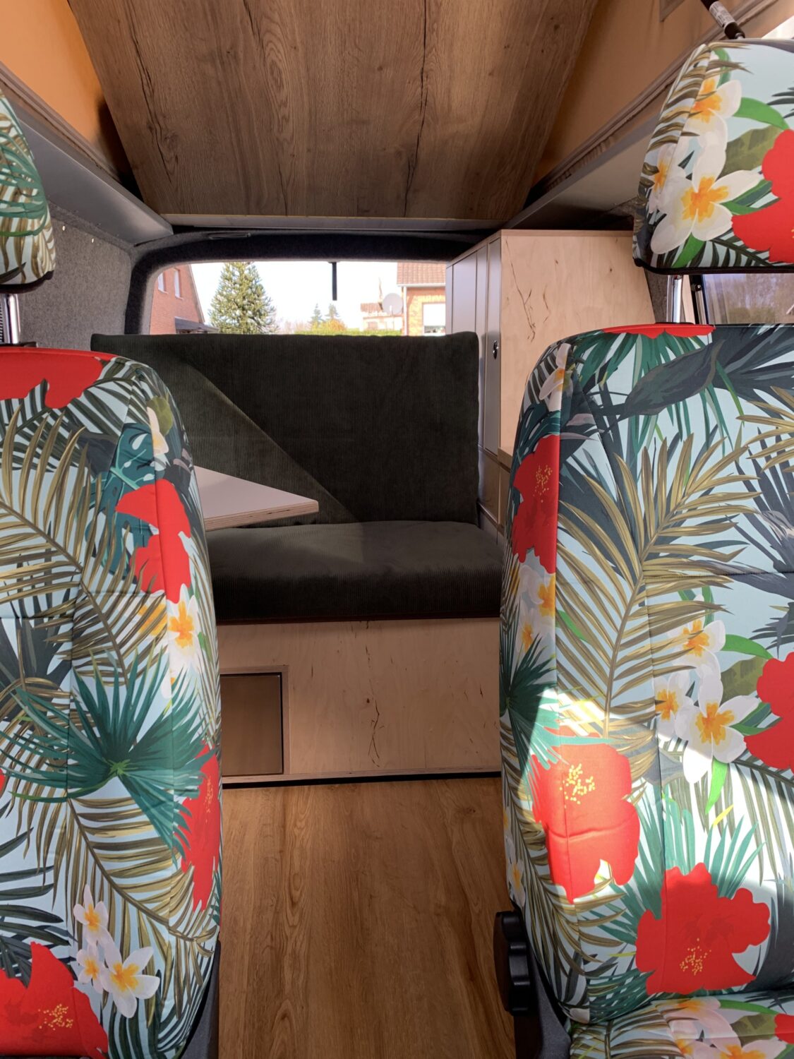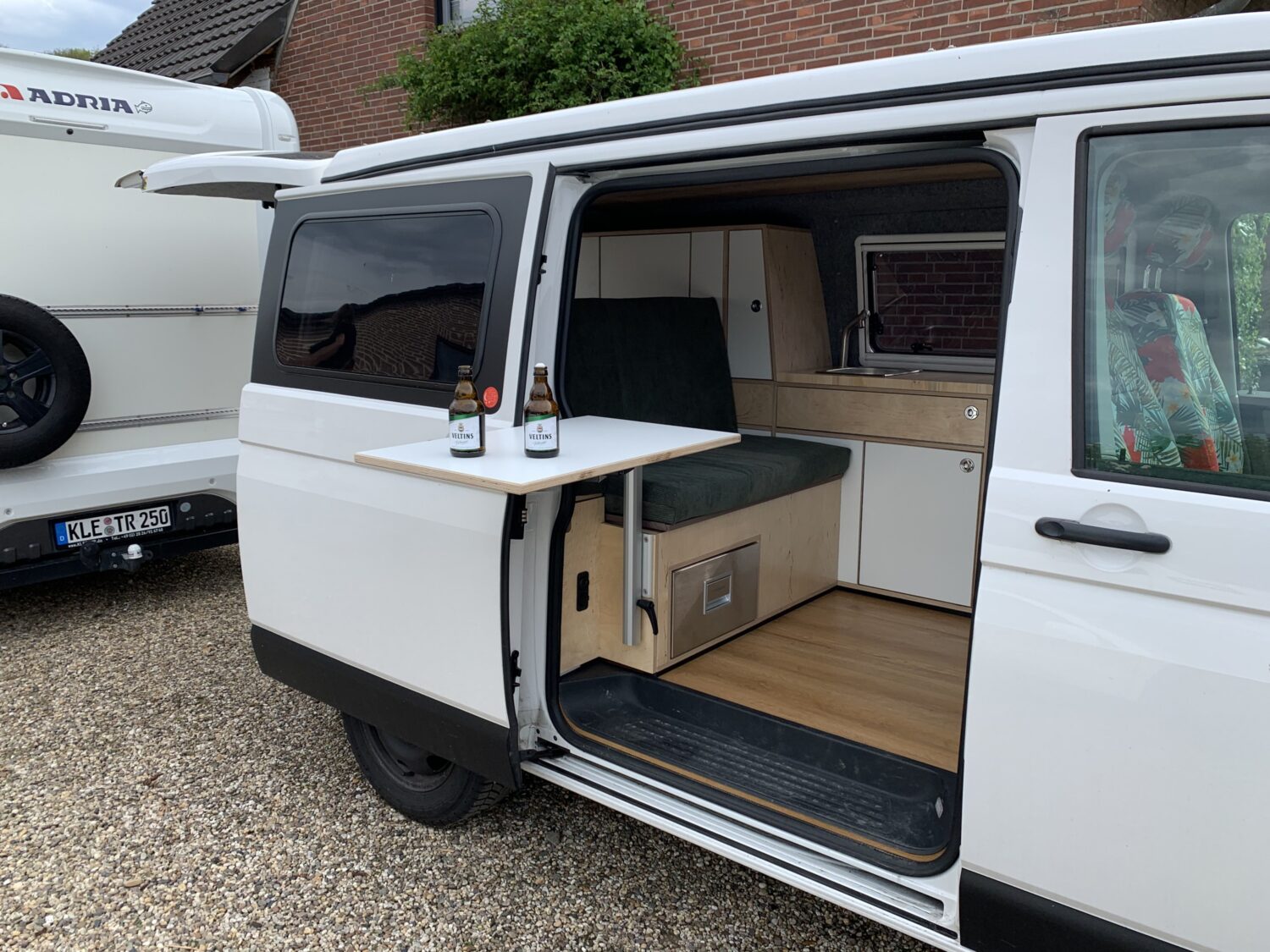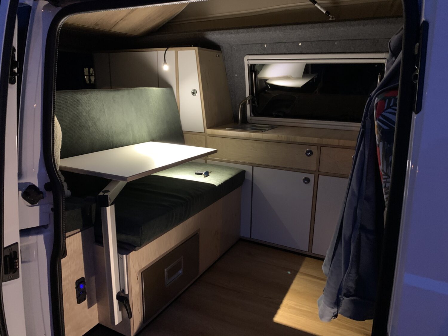 Der Bus ist komplett selber ausgebaut, das Klappdach mit Open-Sky-Zeltbalg kommt von Bus4Fun. Grundmaterialien sind 15mm Multiplex Natur und weiß beschichtet. Es gibt genügend Frischwasser, viel Strom und 4 Schlafplätze. Es wurde Wert darauf gelegt, jeden letzten Zentimeter auszunutzen. Der Umbau hat insgesamt 5 Wochen gedauert.