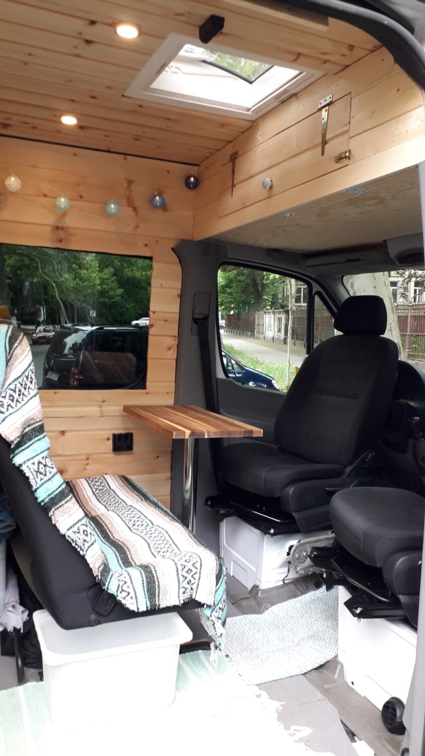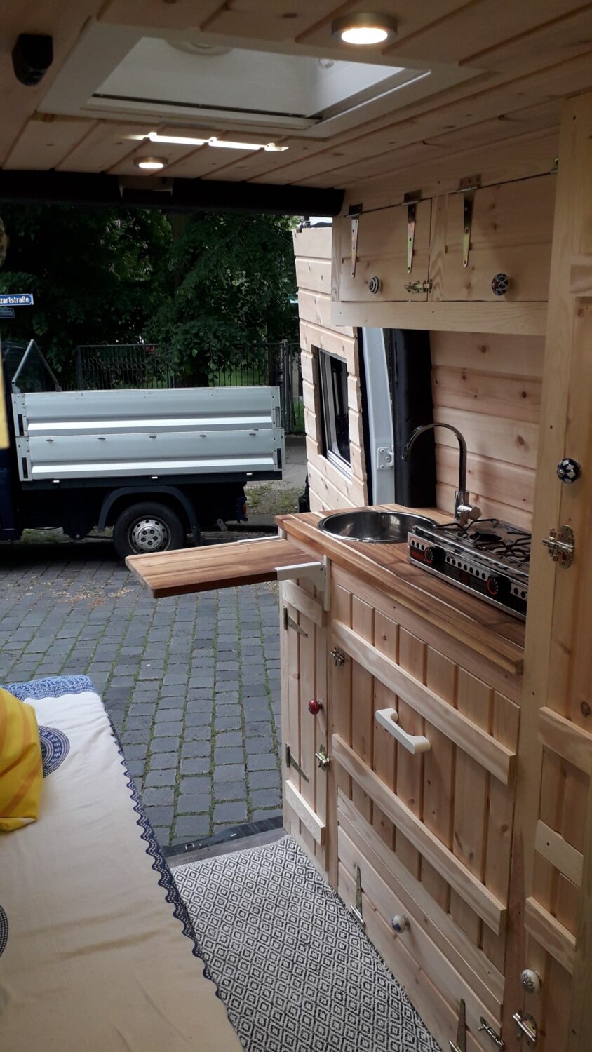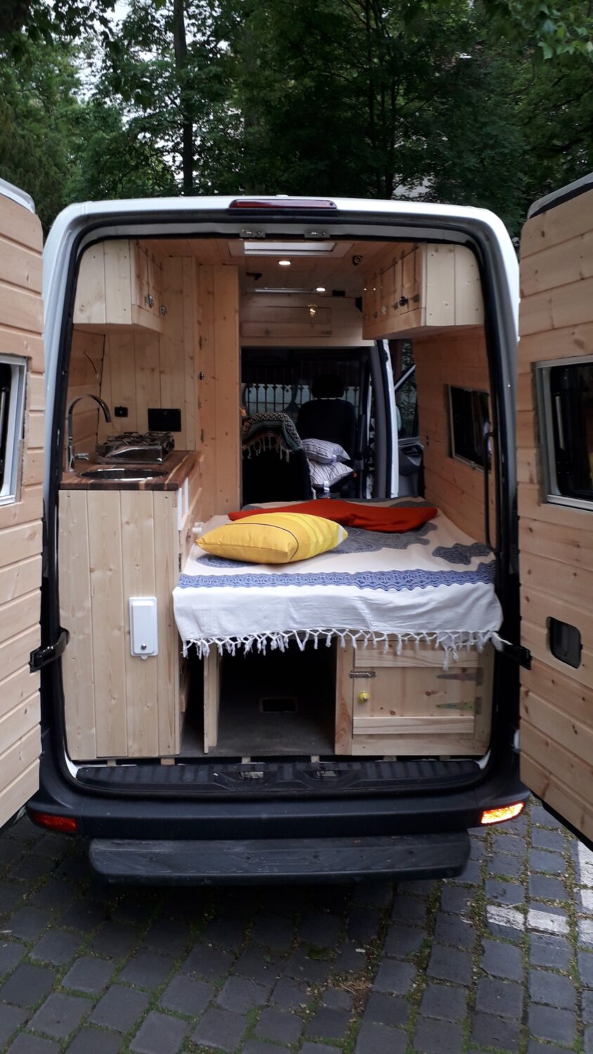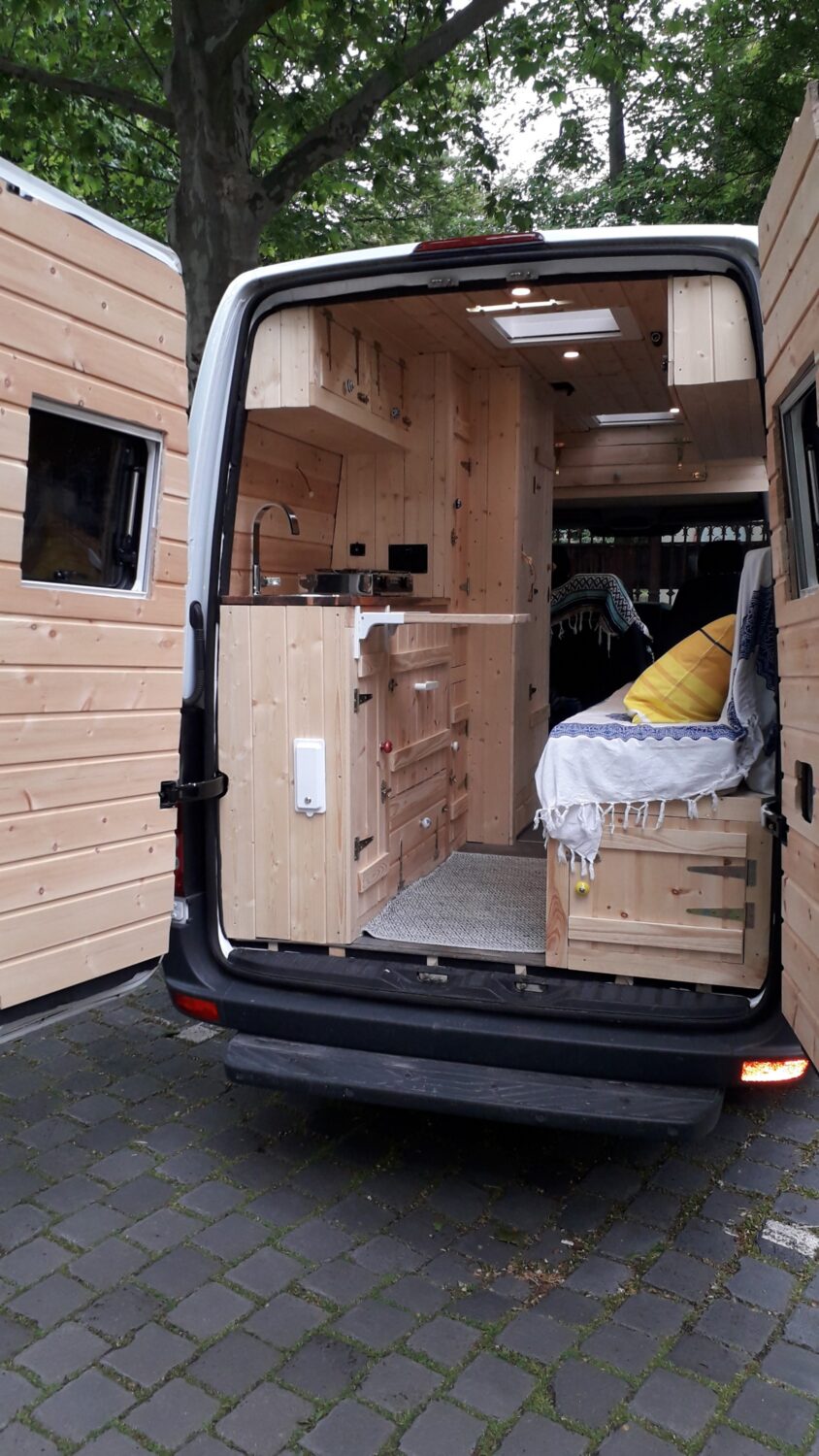 Herzlich willkommen in unserem Higgy. Er ist größtenteils während des 1. Lockdowns entstanden. Das Konzept mit der ausklappbaren Hecksitzbank hinten und der Versorgungszeile gegenüber dürfte bisher einmalig sein und entspringt komplett meinem Kopf, worauf ich sehr stolz bin. Es gab genügend Leute, die mir prophezeit haben, so etwas ginge gar nicht. Unser Sprinter ist ein Mixtosprinter, das heißt, die Sitzbank im vorderen Bereich ist original Mercedes Benz, sodass 4 Sitze auf der Fahrt genutzt werden können. Gedämmt wurde mit Armaflex, weil viel zuviel übrig war, an manchen Stellen bis zu 6,5 cm. Mit den Fenstern und Dachluken haben wir es ebenfalls etwas übertrieben, jetzt haben wir einen Fensterbank. Für die Möbel habe ich mir feinste ostsibirische Zirbelkiefer vom Direktimporteur bestellt und das riecht soooo gut. In vielerlei Hinsicht bin ich den Weg des geringsten Widerstandes gegangen, zum Beispiel haben wir eine Dusche auf einer Stufe, in der ein Abwasserkanister verbaut ist, damit ich nicht unters Auto klettern muss. Oder wir haben einen Origo-3000 Spirituskocher, der uns damals die Zulassung zum Wohnmobil gesichert hat. Ebenfalls mit an Board ist eine Außendusche, drei einzelne 100 Ah- Batterien, die während der Fahrt geladen werden, 80 Liter Frischwasserkanister und 60 Liter Abwasserkanister, eine Planar-2D, eine Porta Portion von Dometic, zwei Drehsitzkonsolen und viieeel Stauraum.