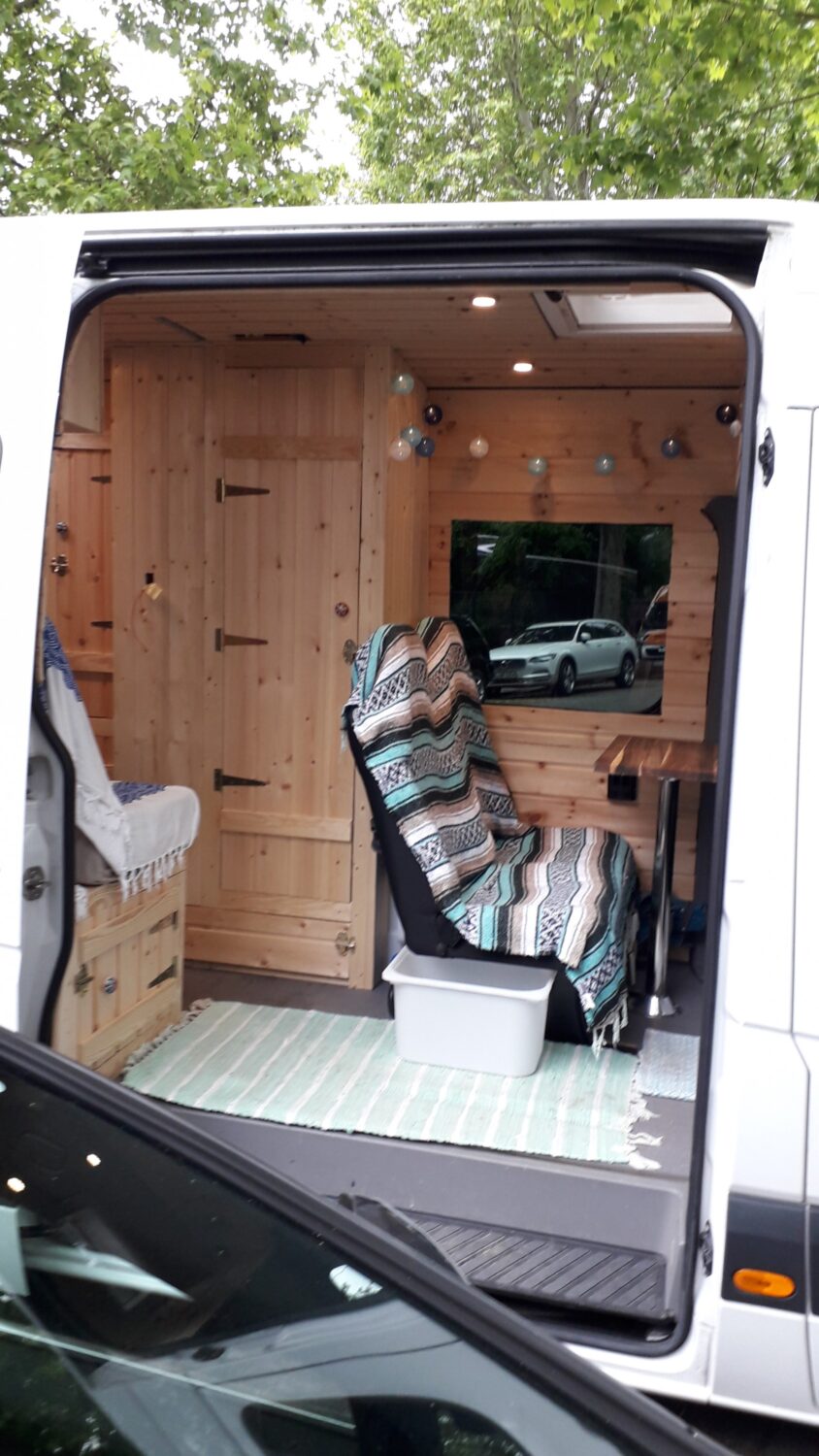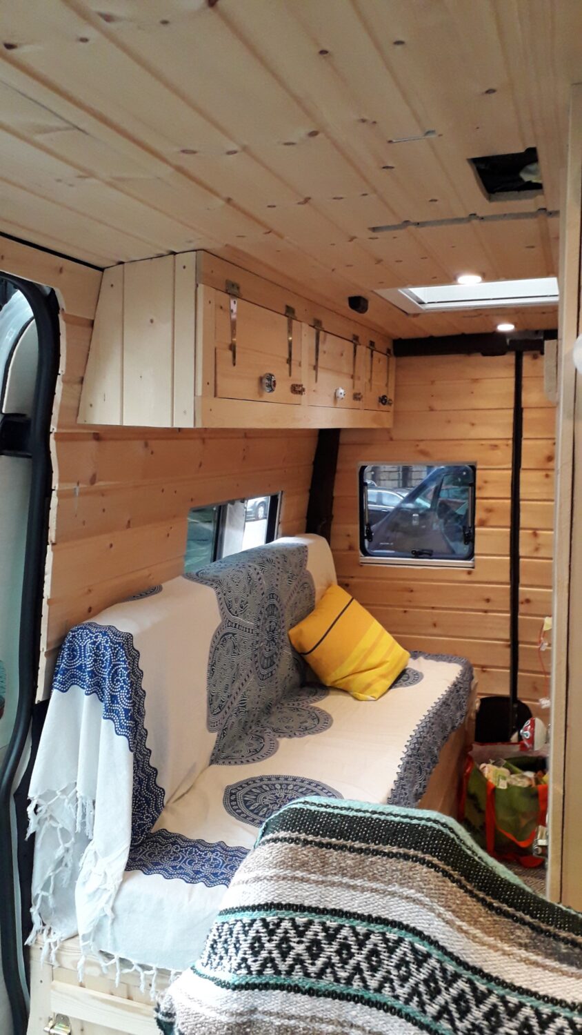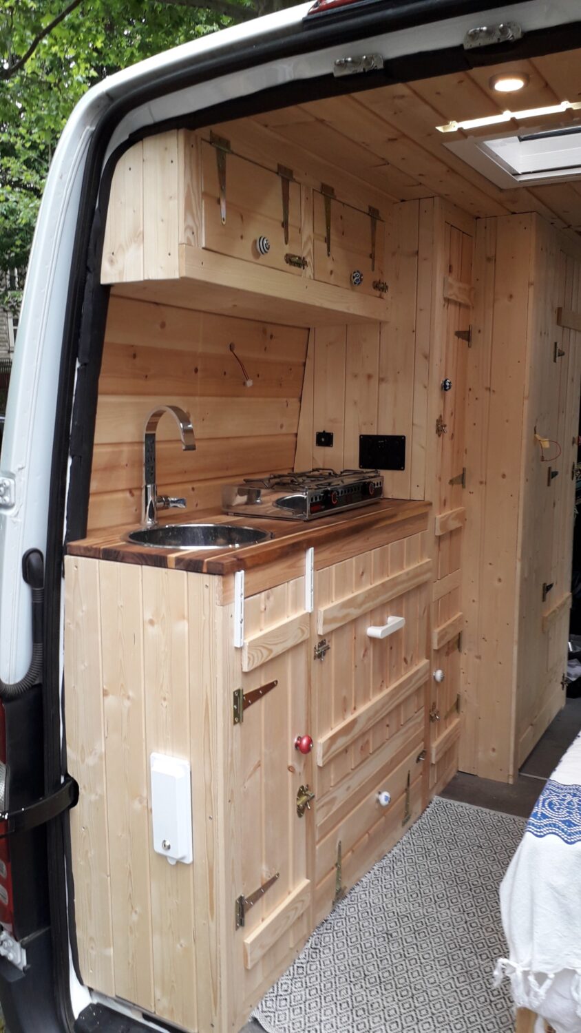 Herzlich willkommen in unserem Higgy. Er ist größtenteils während des 1. Lockdowns entstanden. Das Konzept mit der ausklappbaren Hecksitzbank hinten und der Versorgungszeile gegenüber dürfte bisher einmalig sein und entspringt komplett meinem Kopf, worauf ich sehr stolz bin. Es gab genügend Leute, die mir prophezeit haben, so etwas ginge gar nicht. Unser Sprinter ist ein Mixtosprinter, das heißt, die Sitzbank im vorderen Bereich ist original Mercedes Benz, sodass 4 Sitze auf der Fahrt genutzt werden können. Gedämmt wurde mit Armaflex, weil viel zuviel übrig war, an manchen Stellen bis zu 6,5 cm. Mit den Fenstern und Dachluken haben wir es ebenfalls etwas übertrieben, jetzt haben wir einen Fensterbank. Für die Möbel habe ich mir feinste ostsibirische Zirbelkiefer vom Direktimporteur bestellt und das riecht soooo gut. In vielerlei Hinsicht bin ich den Weg des geringsten Widerstandes gegangen, zum Beispiel haben wir eine Dusche auf einer Stufe, in der ein Abwasserkanister verbaut ist, damit ich nicht unters Auto klettern muss. Oder wir haben einen Origo-3000 Spirituskocher, der uns damals die Zulassung zum Wohnmobil gesichert hat. Ebenfalls mit an Board ist eine Außendusche, drei einzelne 100 Ah- Batterien, die während der Fahrt geladen werden, 80 Liter Frischwasserkanister und 60 Liter Abwasserkanister, eine Planar-2D, eine Porta Portion von Dometic, zwei Drehsitzkonsolen und viieeel Stauraum.