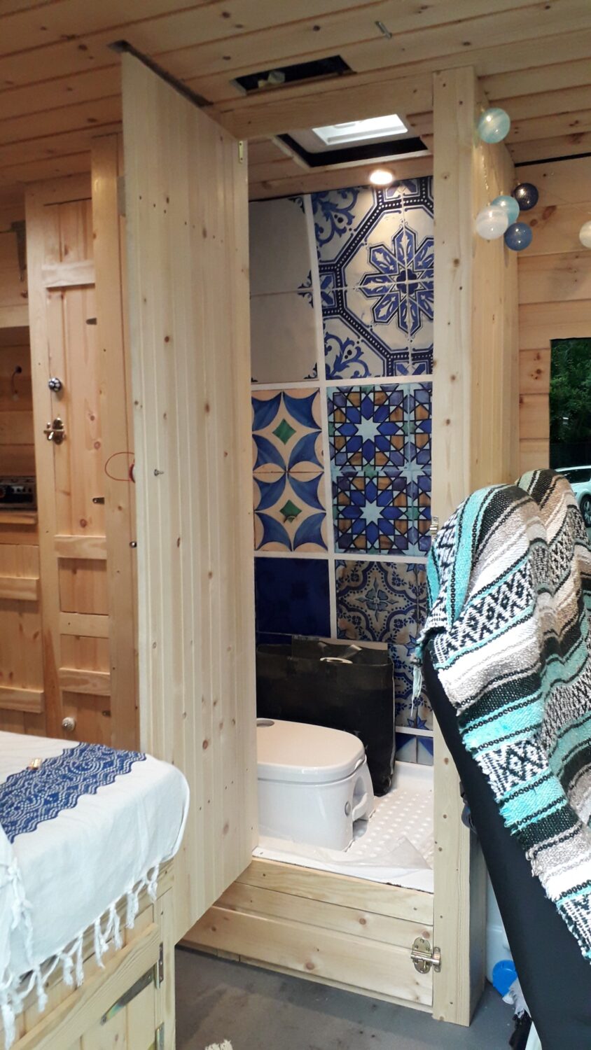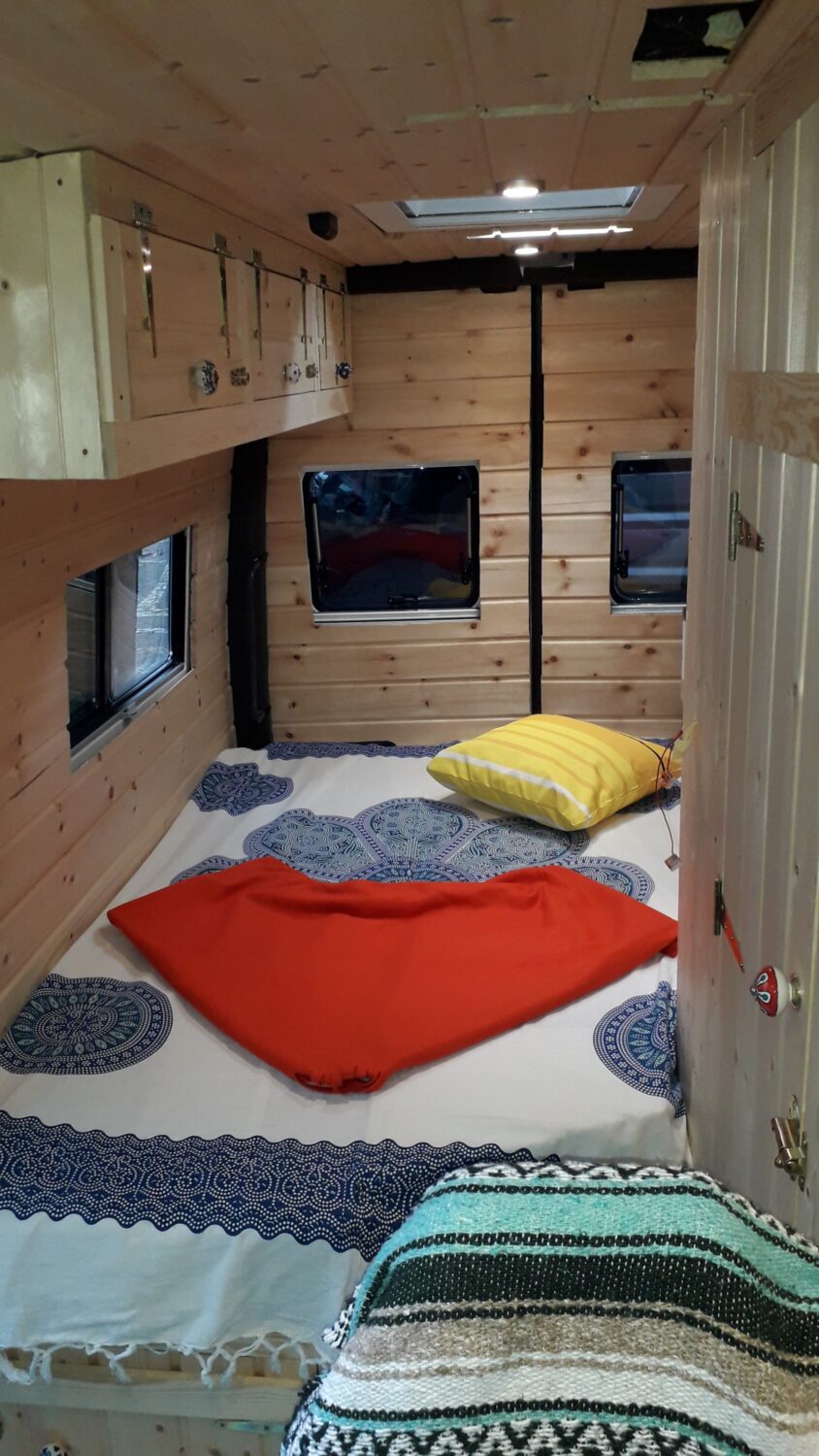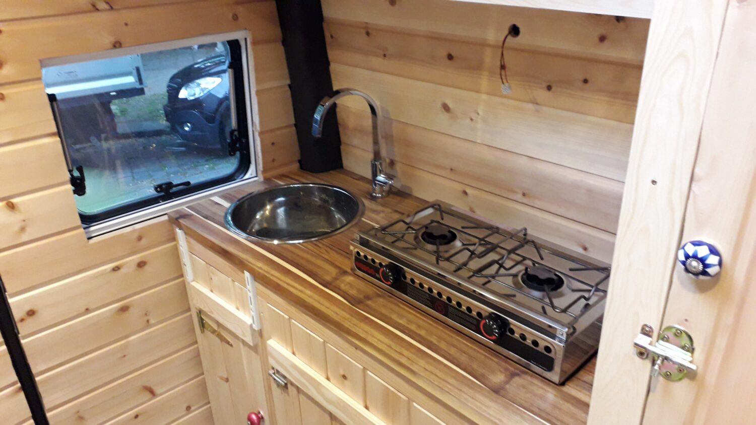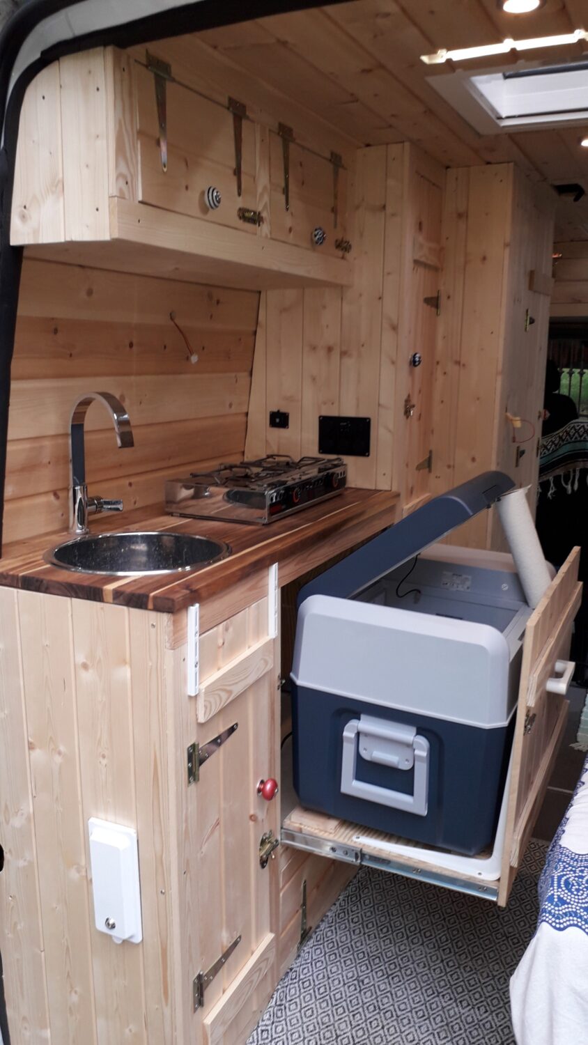 Herzlich willkommen in unserem Higgy. Er ist größtenteils während des 1. Lockdowns entstanden. Das Konzept mit der ausklappbaren Hecksitzbank hinten und der Versorgungszeile gegenüber dürfte bisher einmalig sein und entspringt komplett meinem Kopf, worauf ich sehr stolz bin. Es gab genügend Leute, die mir prophezeit haben, so etwas ginge gar nicht. Unser Sprinter ist ein Mixtosprinter, das heißt, die Sitzbank im vorderen Bereich ist original Mercedes Benz, sodass 4 Sitze auf der Fahrt genutzt werden können. Gedämmt wurde mit Armaflex, weil viel zuviel übrig war, an manchen Stellen bis zu 6,5 cm. Mit den Fenstern und Dachluken haben wir es ebenfalls etwas übertrieben, jetzt haben wir einen Fensterbank. Für die Möbel habe ich mir feinste ostsibirische Zirbelkiefer vom Direktimporteur bestellt und das riecht soooo gut. In vielerlei Hinsicht bin ich den Weg des geringsten Widerstandes gegangen, zum Beispiel haben wir eine Dusche auf einer Stufe, in der ein Abwasserkanister verbaut ist, damit ich nicht unters Auto klettern muss. Oder wir haben einen Origo-3000 Spirituskocher, der uns damals die Zulassung zum Wohnmobil gesichert hat. Ebenfalls mit an Board ist eine Außendusche, drei einzelne 100 Ah- Batterien, die während der Fahrt geladen werden, 80 Liter Frischwasserkanister und 60 Liter Abwasserkanister, eine Planar-2D, eine Porta Portion von Dometic, zwei Drehsitzkonsolen und viieeel Stauraum.