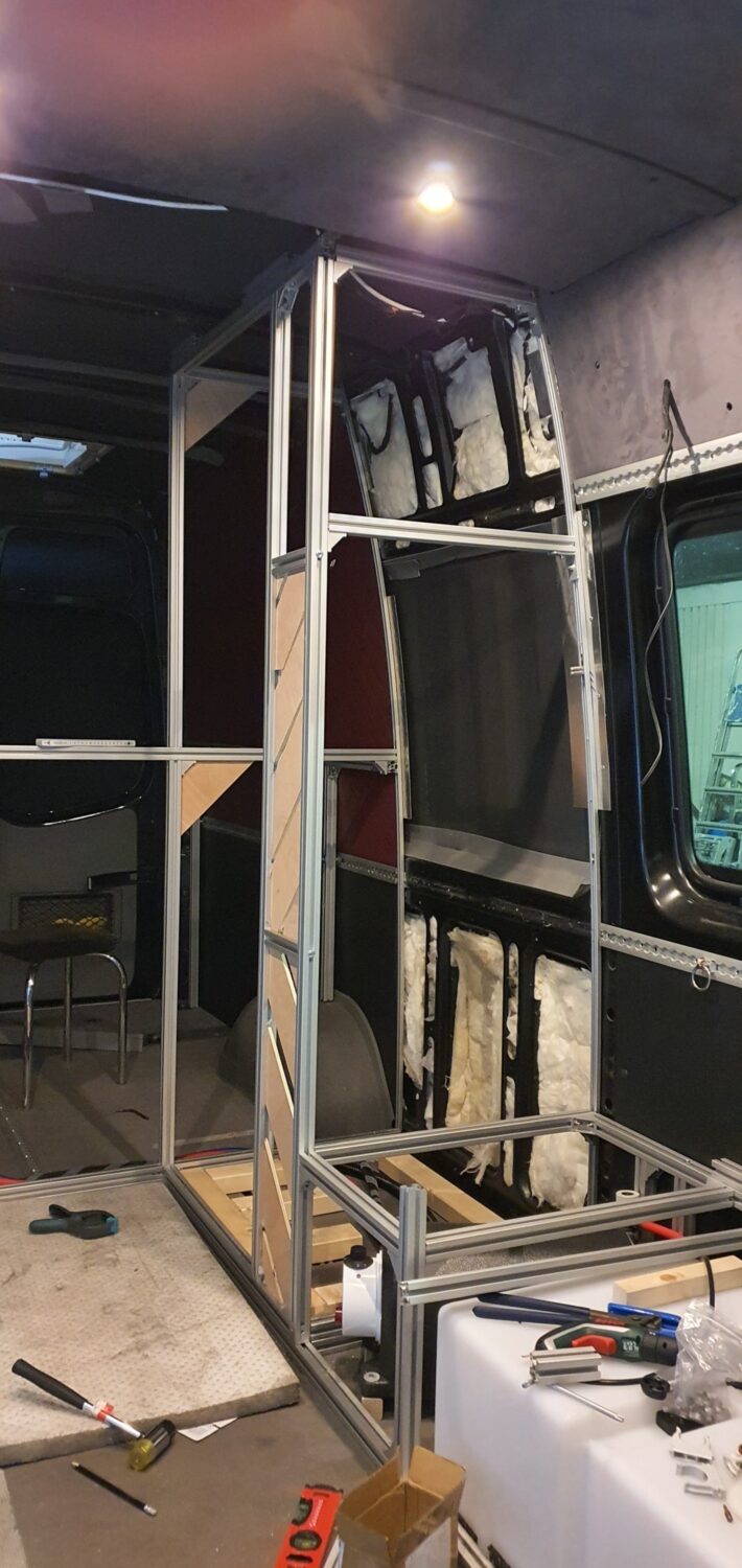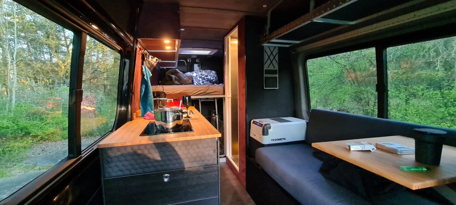 Zweiter Ausbau 2019 mit neuem Layout. Bett 160x200, unterm Bett Platz für zwei Fahrräder. Dusche in Aluoptik, Elgena WW Boiler mit Kühlmittelanschluss. Kein Gas, Heizen und Kochen mit Diesel. Konstruktion aus Aluprofilen. Dachfenster 70x50 überm Bett zum Sterne gucken. Aach und soo viel mehr :)