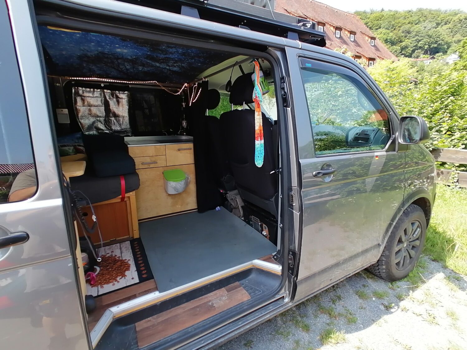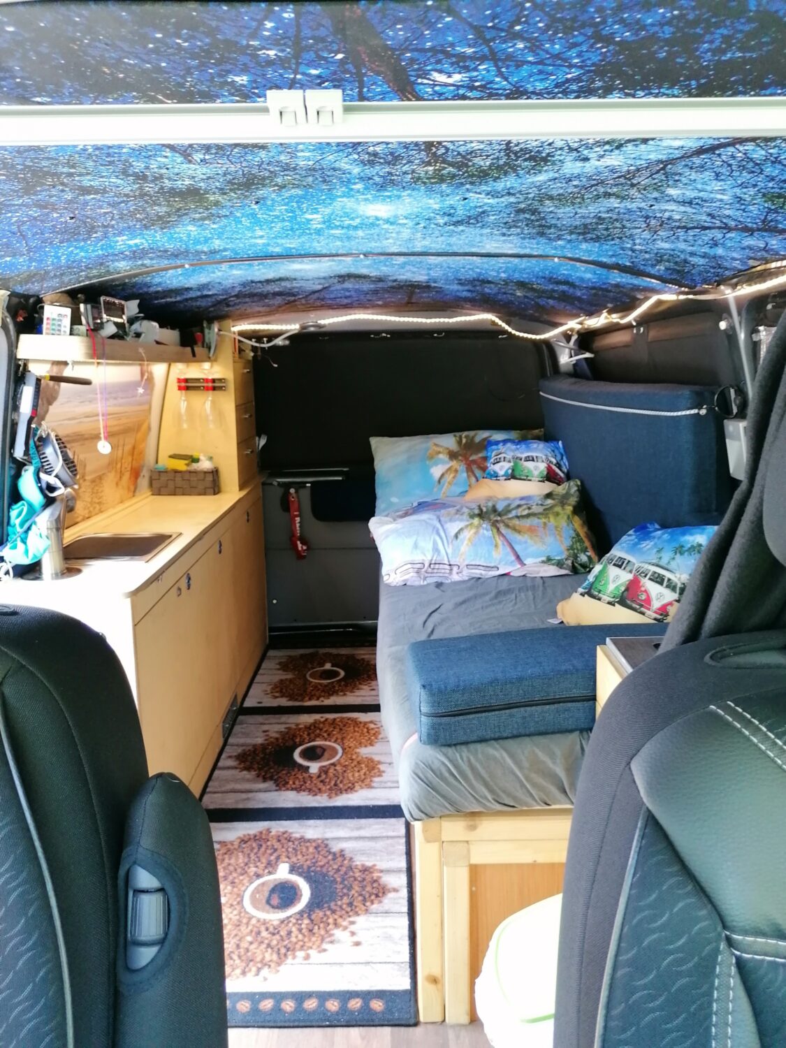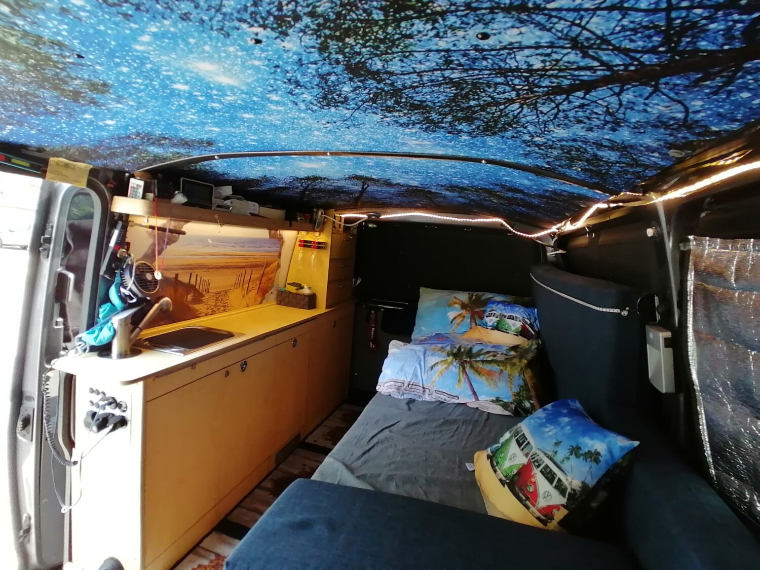 Offroadumbau mit Sternenhimmel. Im März2020 haben wir uns unseren Traum von einem T5 erfüllt. Wir haben ihn ohne fremde Hilfe vom Handwerkertransporter zum Offroad Campervan umgebaut. Dabei sind wir stolz auf unseren Sternenhimmel der genau den Stand der Sterne am Tag des Kauf zeigen. Freitag der 13.03.2020. Eingebaut haben wir unter anderem ein ausziebates Bett mit 140x200 cm. Eine Küche mit Steinarbeitsfläche, induktionsherd, kühlbox, 230v uns solar Anlage. Standheizungen, fussbodenheizung und Wasserversorgung mit Außendusche, Isolierung mit Armaflex sowie Höherlegung um 8cm gehören zu den weiteren Umbaumassnahmen. Wir können auch im Dachzelt schlafen oder auf unserer Dachterrasse chillen und bei einem Glas weil den Sonnenuntergang genießen Ã°à ¸ÃÂâ°