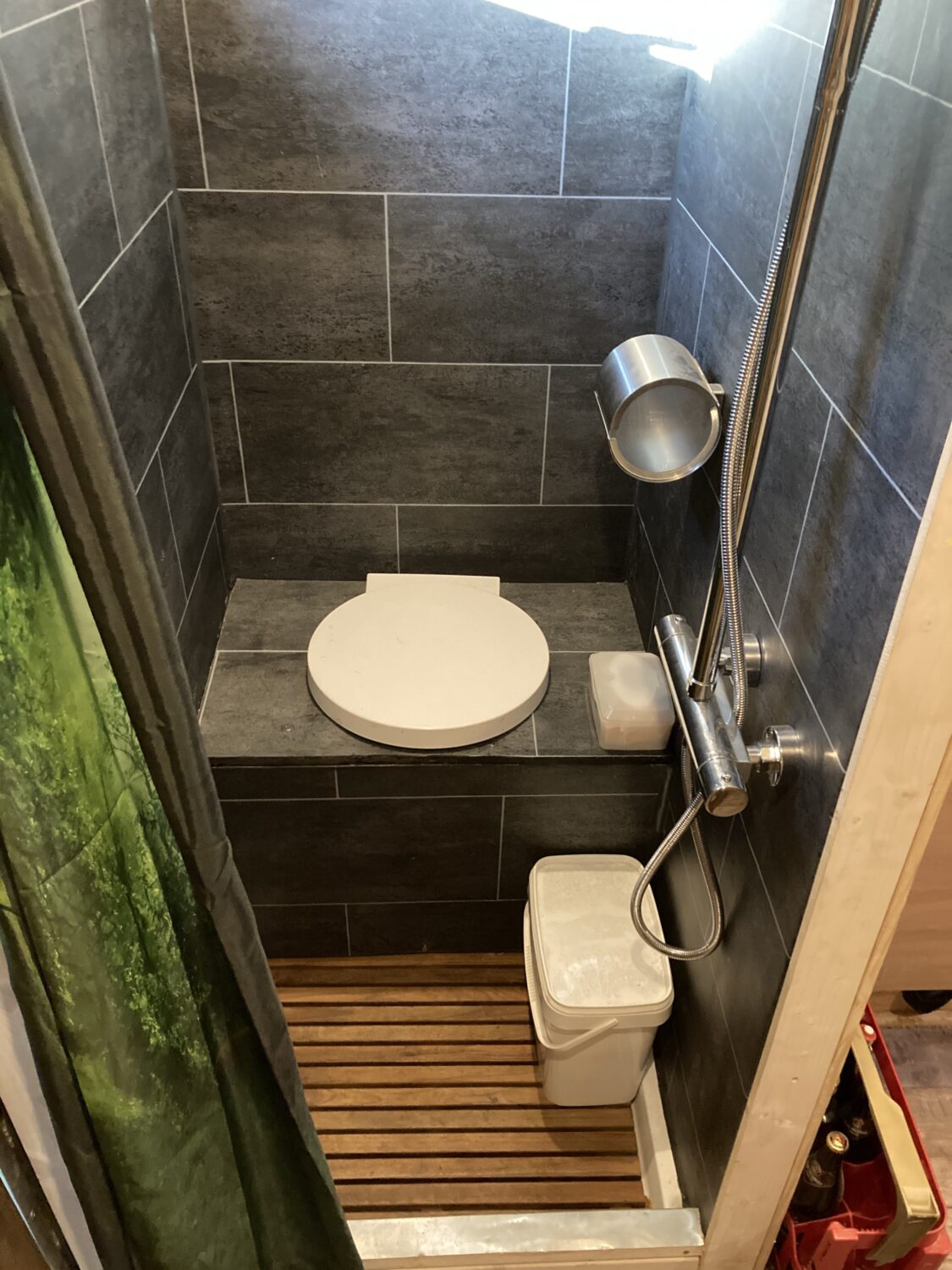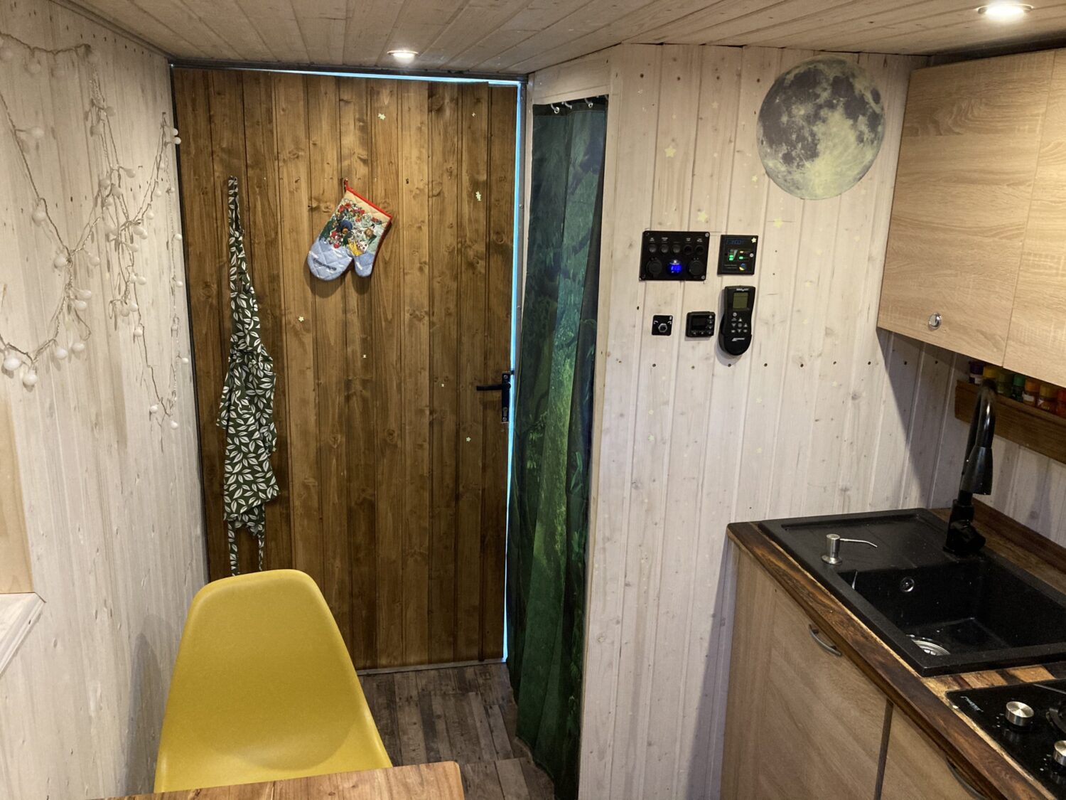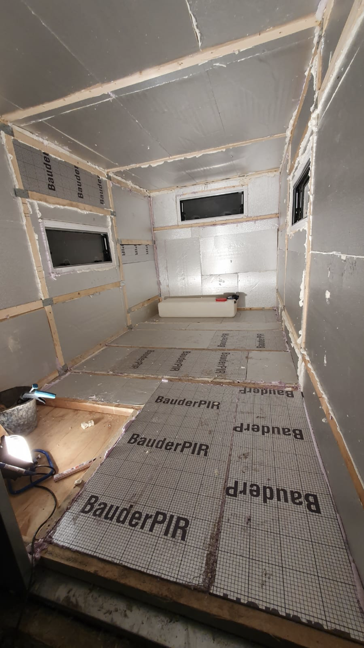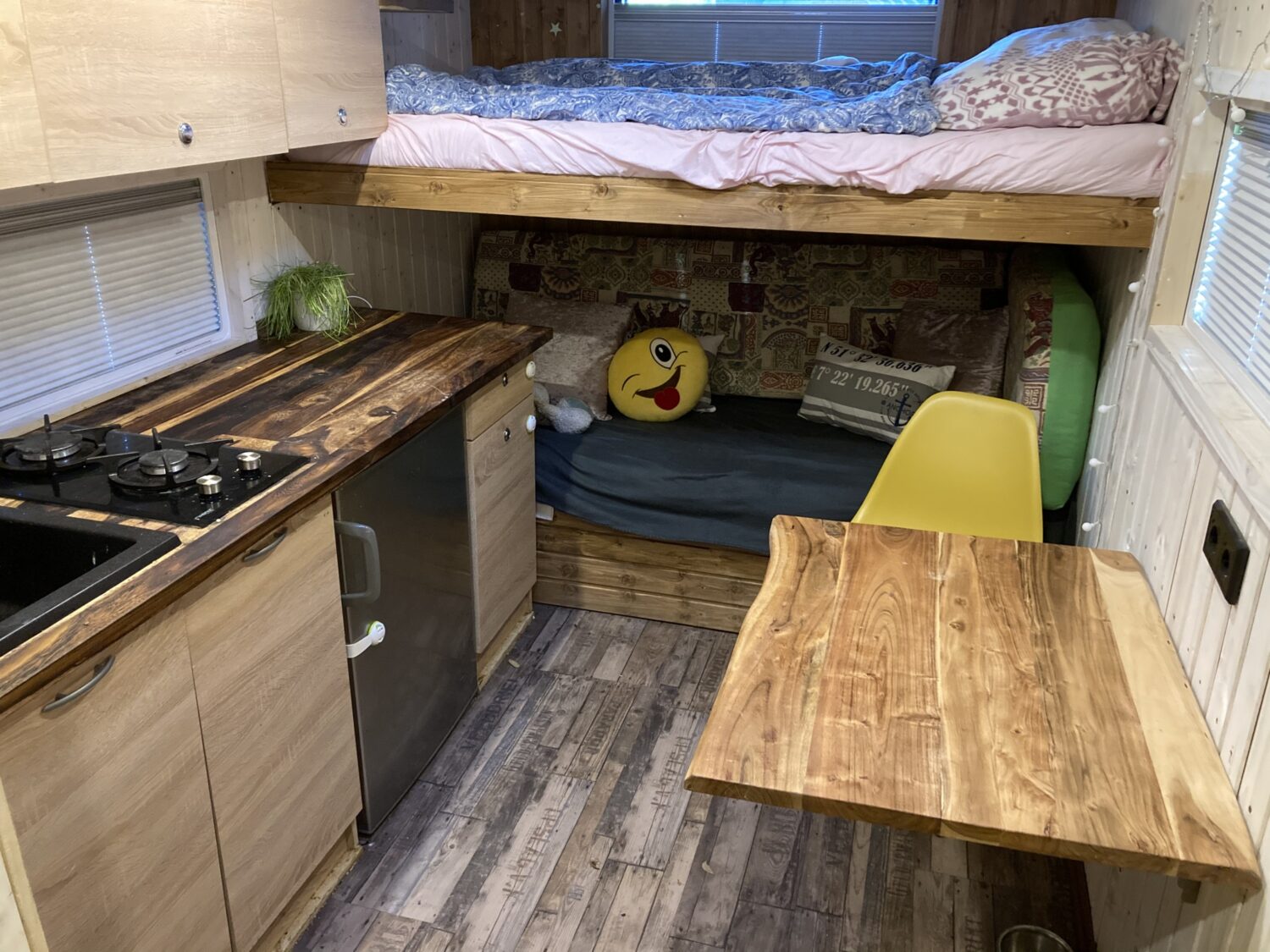 Unser Ausbau hat 1,5 Monate gedauert aus einem leeren Baustellen, Materielcontainer . Wir haben keine Kompromisse gemacht und alles in unsere Wohnkabine gepackt was geht. Gas Boiler, Heizung , Dusche, Toilette usw. Unser Van hat einen Klappbaren Baumkantentisch. Hier haben wir die Möglichkeit 3qm freie Nutzfläche zu haben.