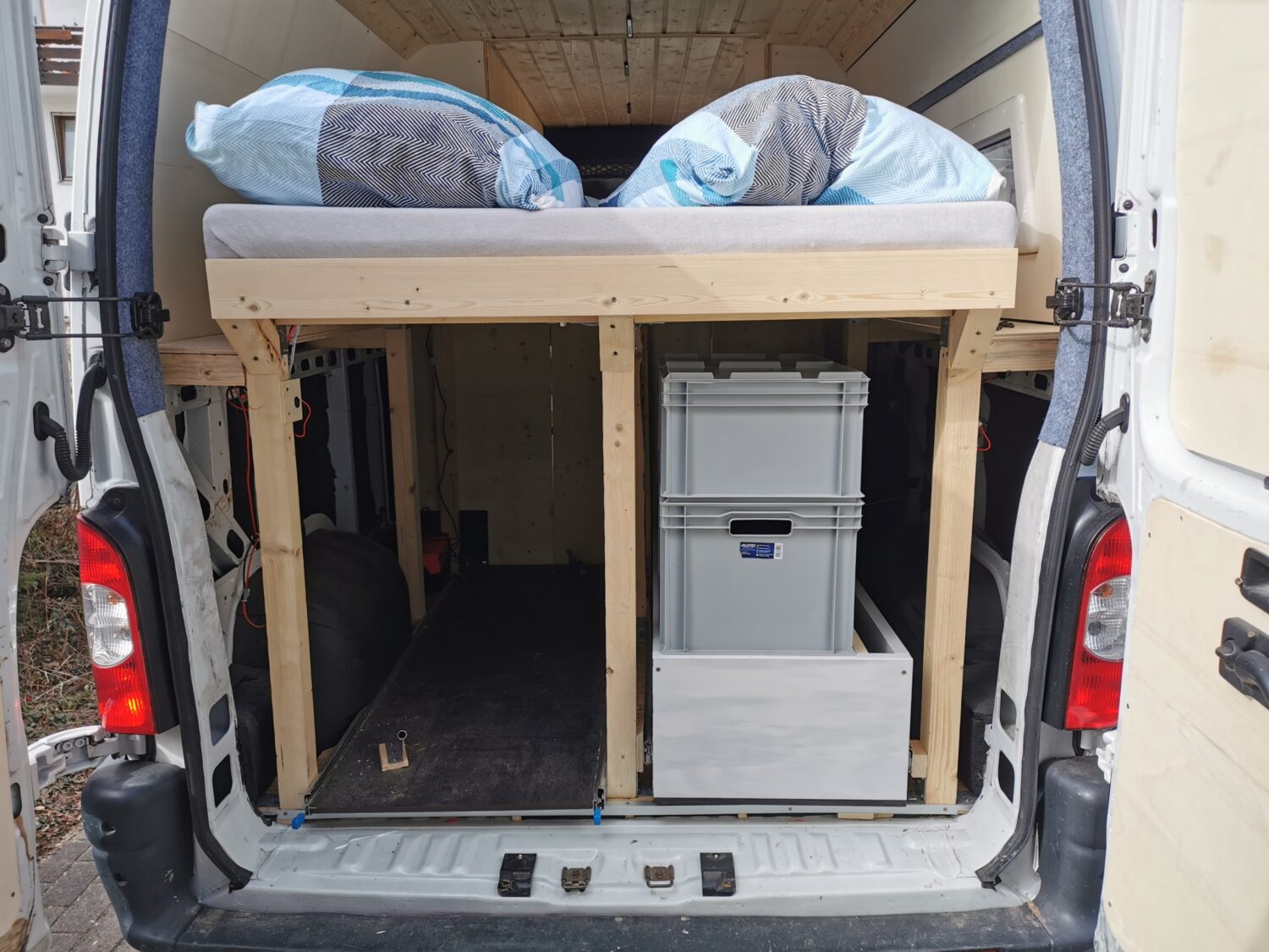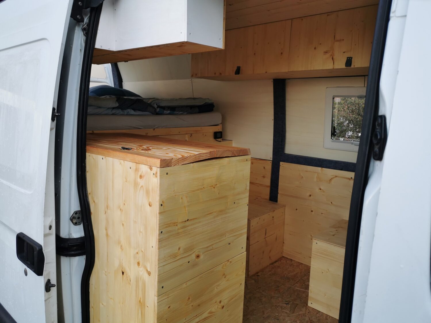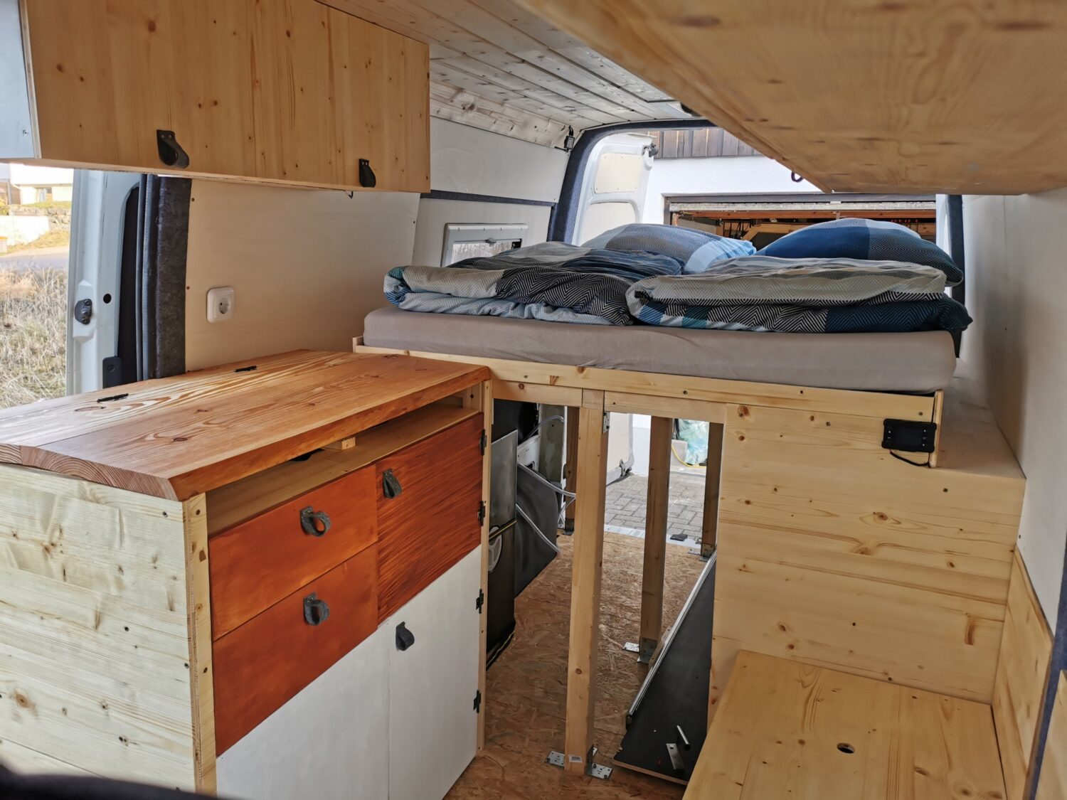 Ich hab ohne Vorkenntnisse dank YouTube ausgebaut. Also nicht professionell. Der Ausbau hat ca 5 Monate gedauert. Mein Haupt Augenmerk liegt an der Heckgarage in der meine Mautainbikes passen müssen, deshalb ist das Bett sehr hoch. Außerdem sind wir recht groß so das wir längs schlafen. Ich habe seit kurzem eine Außendusche die ich am Waschbecken im Küchenblock anschließen kann. Der Ausbau hat mich inkl. Fahrzeug, Elektrik und Solarmodul ca. 12500€ gekostet.