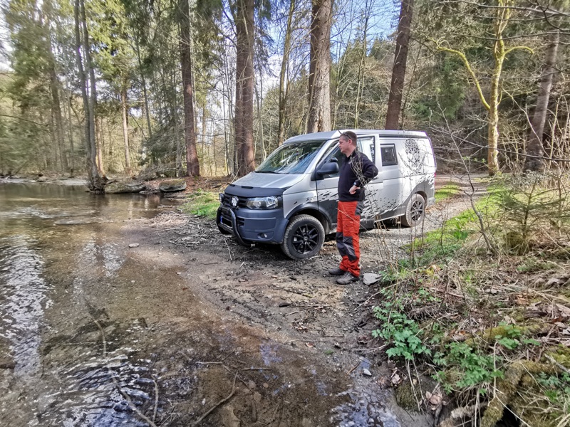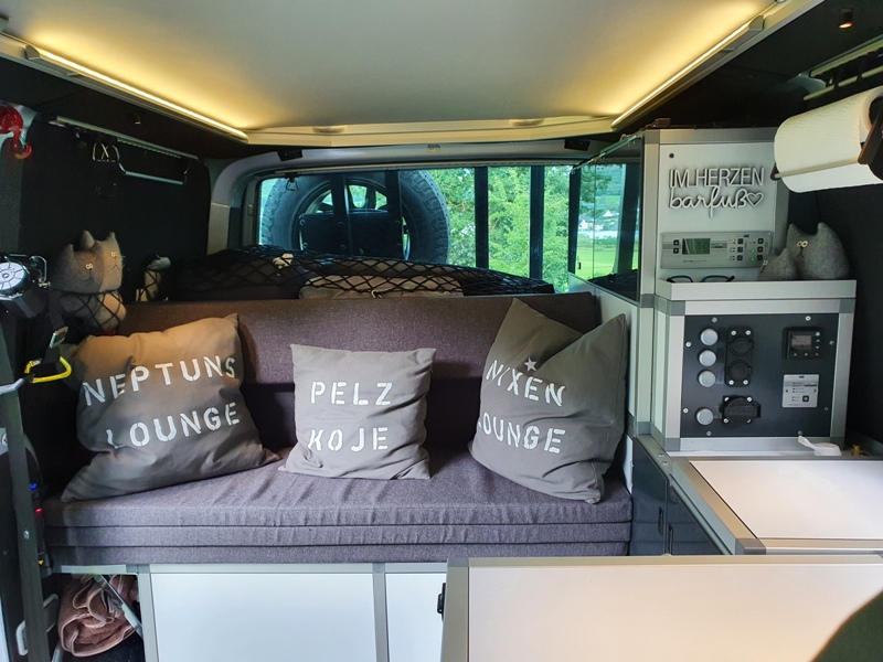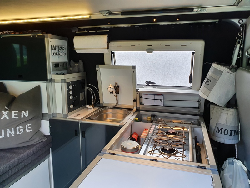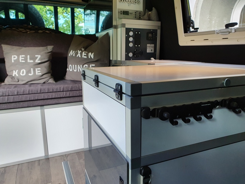 Nach ordentlicher Recherche und der Definition unseres Anspruches wurde das Projekt im Sommer 2018 gestartet und bis Frühjahr 2019 komplett umgesetzt, von der Fahrzeugsuche + Kauf, der Planung, die Materialrecherche, die Beschaffung und der eigentliche Ausbau. Grundlage ist ein gut gebrauchter VW T5, Transporter, 4Motion ,~150PS/ Diesel, Handschaltung, Hinterachsdifferenzial, Dieselzuheizer und eine gute Grundausstattung. Umgebaut auf Seikel Fahrwerk Desert HD, Bereifung GeneralTire Grabber AT3 235/65R17 auf Alu-Felge DEZENT. Seikel Unterfahrschutz, Delta Frontschutzbügel mit 2x LED-Fernlichtscheinwerfer (ges. Lichtstrom 22.000lm). Schlafdach SCA 195 in Fahrzeugfarbe 2x Reimo MultiRail Verbaut wurden zu 99% Leichtbauwerkstoffe wie Alu-Dilitet, Alu-Dibond, Aluminium, Robuste Stoffe mit Dämmung, Linoleum, 20mm Kaiflex und Alubutyl Autoterm Air 2D Deluxe Standheizung mit GSM-Modem Dometic Kompressor-Kühlbox 35L (12V=/ 230V~) Frischwasser 56L, Grauwasser 15L Warmwasserboiler 6L (12V=/ 230V~) Zusatzbatterien mit ges. 160Ah (Blei/Säure) Mini-LED-Spots und LED-Linien indirekt, in 2700K, dimmbar Büttner Info.-Panel Digital-200 und Lade-Booster MT BCB-20 IUOU … und vieles mehr. Aus diesem Herzens-Projekt, aus den unendlichen Ideen was man in einem Camper Van alles verbauen könnte und der Suche nach vielseitigen Befestigungsmöglichkeiten die wir im Bus benötigen, ist dann zum 02.02.2020 SeaLand-pro® geboren worden. Mit unsere Marke SeaLand-pro® haben wir ein Unternehmen gegründet und vertreiben nun selbst entwickelte Nischenprodukte. In unserem Shop unter www.SeaLand-pro.de findet Ihr unsere geschützten Befestigungen für Airline-Schienen und andere innovative Dinge. (Dazu gehören z.B.: Hakenleisten, Brausehalter, Flaschenhalter, Küchenpapierabroller, Fittings, Airlineschienen, usw.)