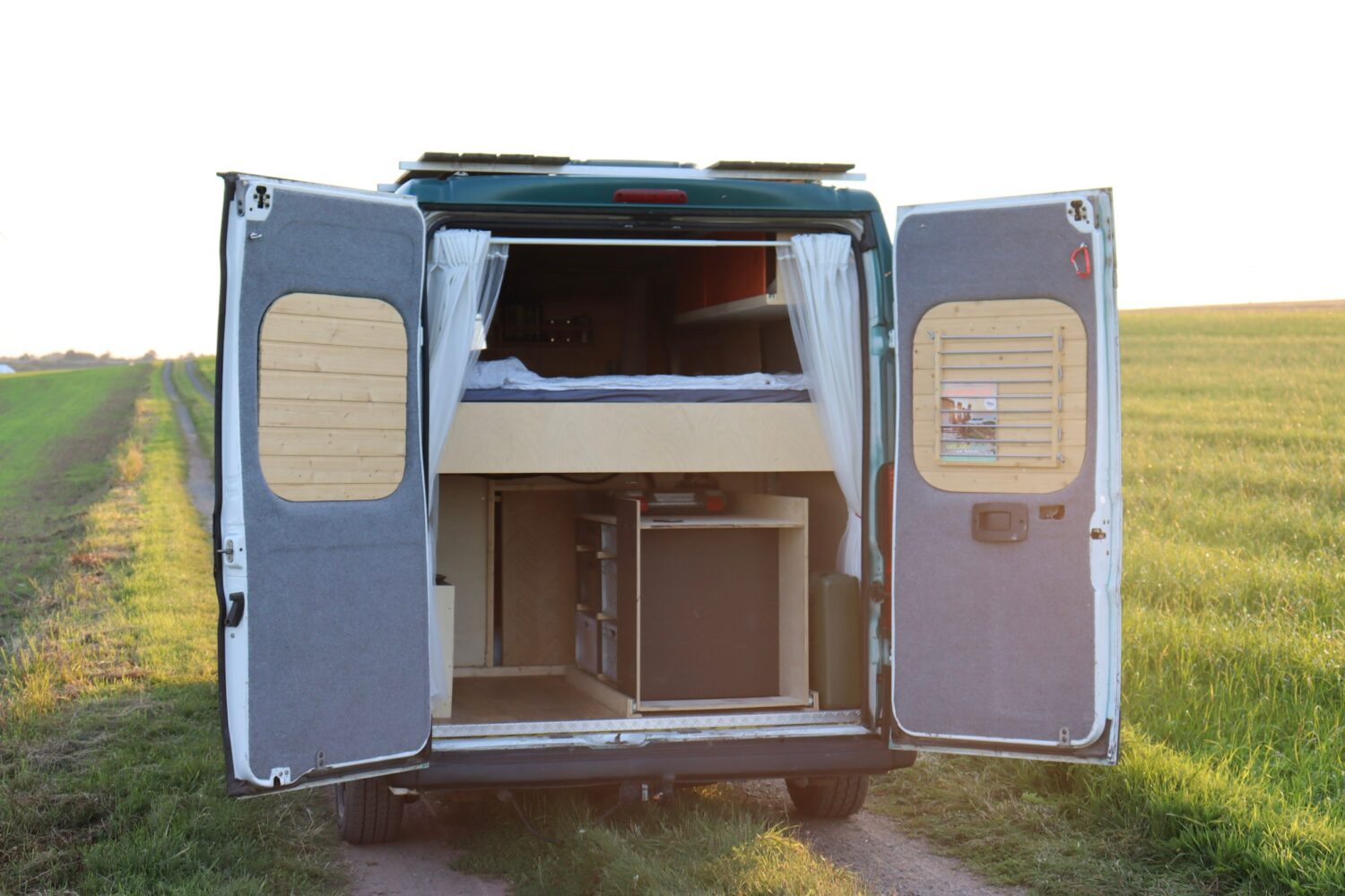 Der Vanausbau hat circa 4 Monate gedauert, es gibt eine große Spüle, Gaskochfeld, 50L Kompressorkühlbox, eine 180Ah AGM Batterie und eine Air 2D Dieselstandheizung. Eine Trockentrenntoilette ist auch mit dabei. Unter dem fest verbauten Bett ist eine große Ausziehbox und Platz für Ski und Mountainbike. Auf dem Bus sind 2 x 100Watt Solarmodule und eine großzügige Dachterrasse, um die Sonne in allen Arten voll auszunutzen. Die gemütliche Sitzecke kann bedarfsweise zu einem dritten Schlafplatz umfunktioniert werden.