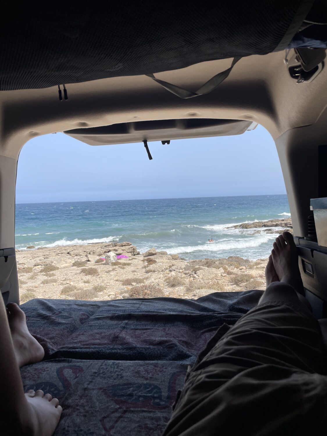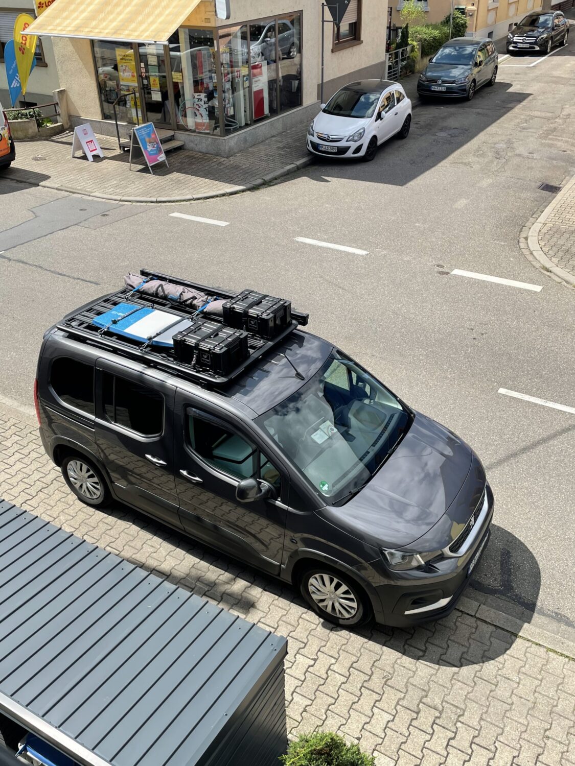 Wir haben uns für eine Campingbox von Campal entschieden, da das Fahrzeug ganz normal weiterhin als Familienfahrzeug fungiert. Auf dem Dach wurde ein Dachträger von Rhino-Rack mit Füßen von Frontrunner montiert. Hieran ist eine Markise von Sunseeker montiert. Wir haben eine Kompressorkühlbox, eine mobile Dusche (Decathlon), Tisch, Stühle, Bivyloo (Toilette), flexibles Solarpanel, Fensterberdunkelungen rundum und ein Stehzelt (Duschen, Toilette, Umziehen) dabei.