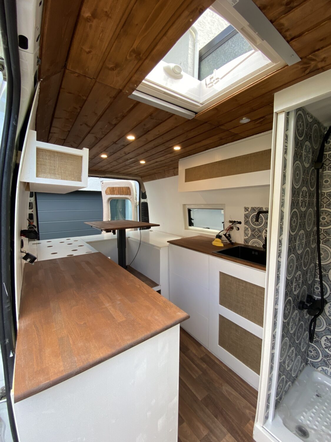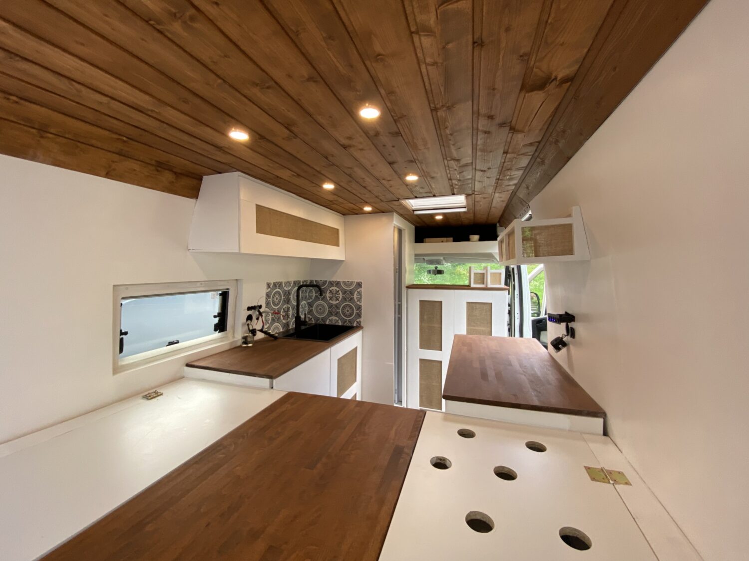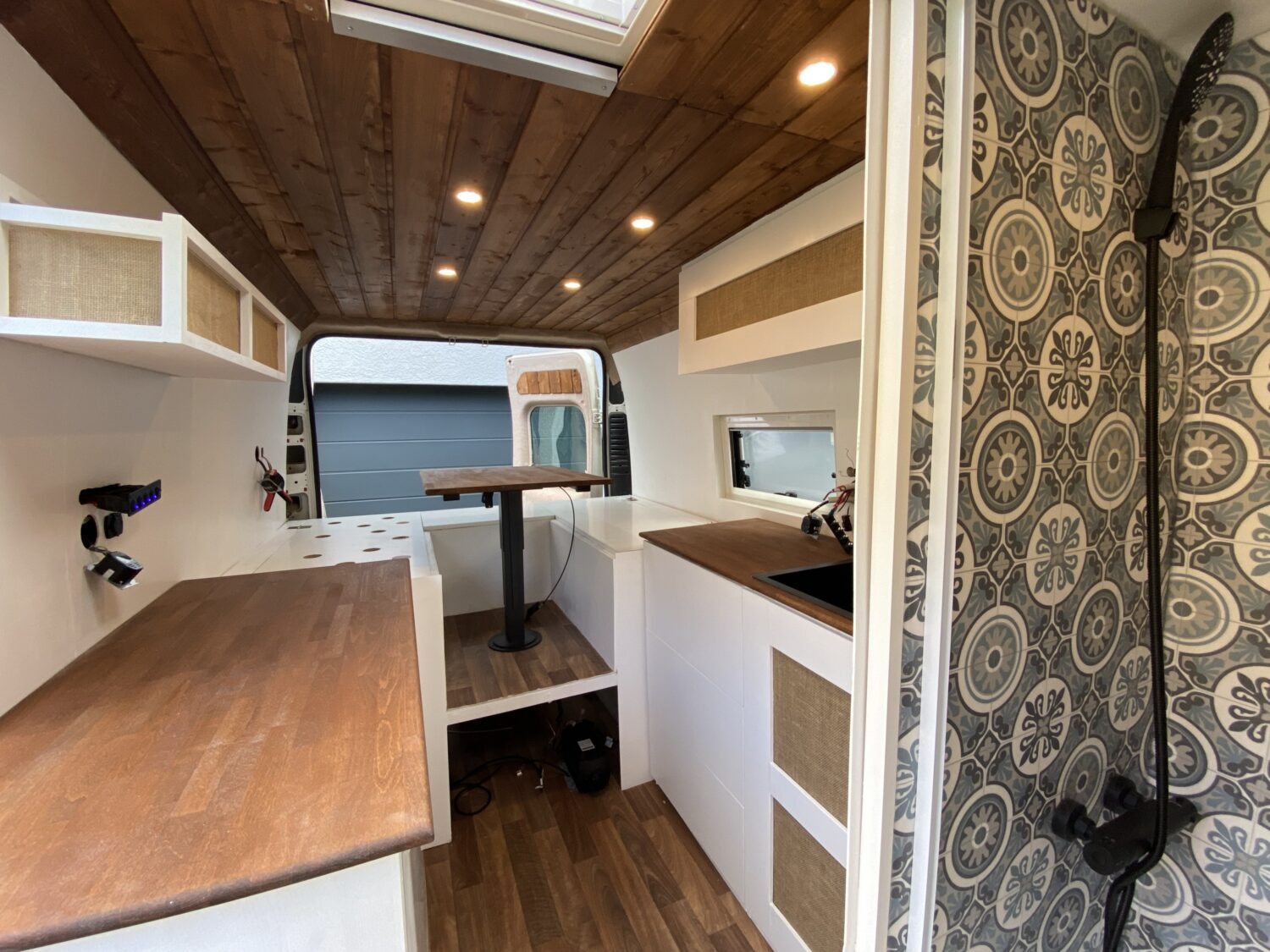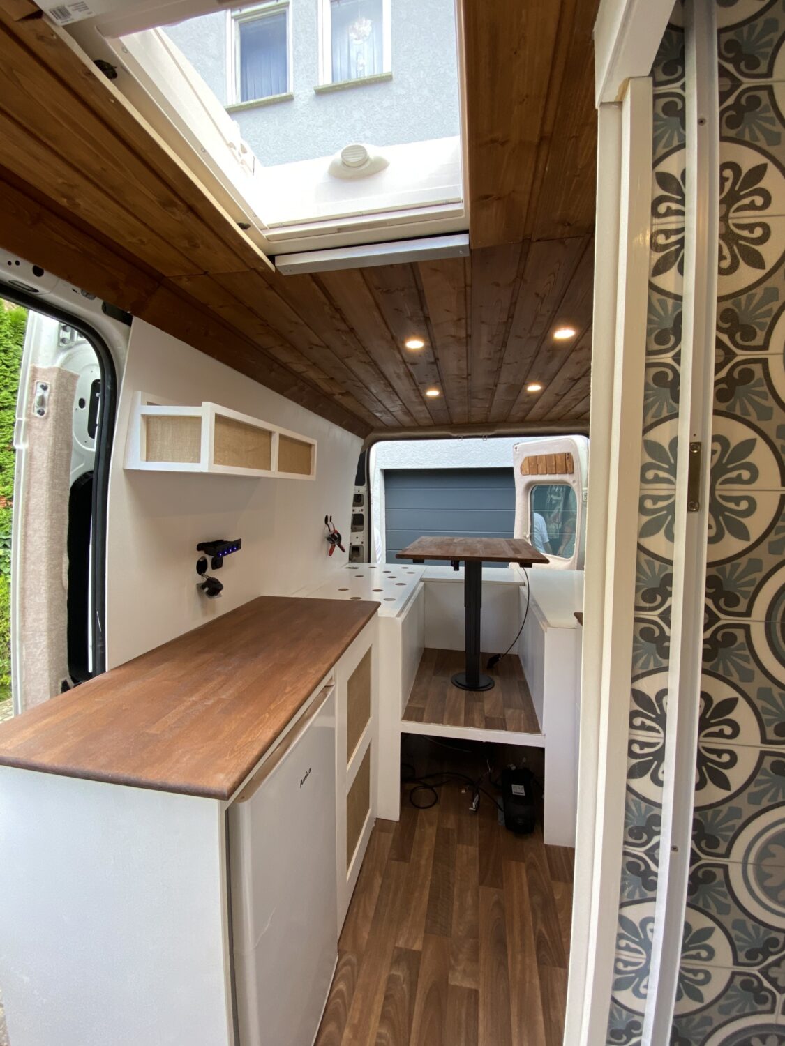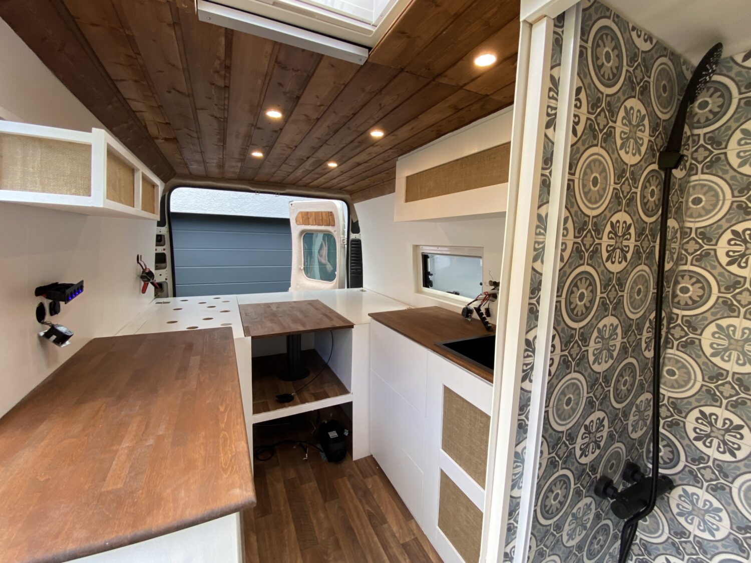 Ausbaudauer: 4 Monate Ausstattung: Wasser (Dusche, Spülbecken, Warmwasserboiler) Strom (12V und 230V Stromkreis, Solarpanele, Zweit-Batterie) Kochen: Gaskartuschenkocher Bett: Bettkonstruktion die zur Sitzecke umgebaut werden kann