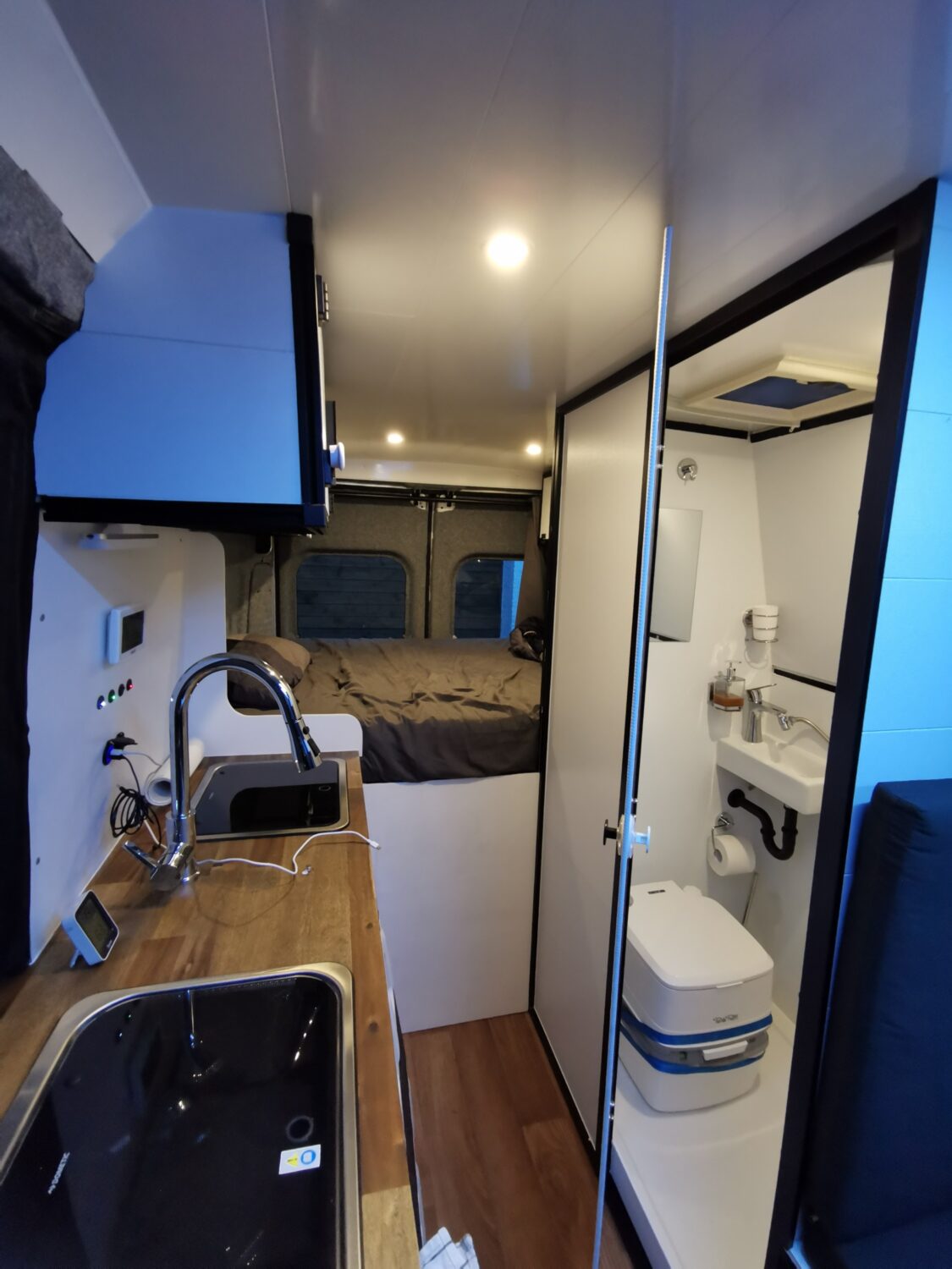 Komplettausbau in unter 6 Monaten, Aktuell wird noch eine Luftzusatzfederung verbaut. 200Ah LiFePo4 Eigenbau 300W Solar + 30A Ladebooster 90L Frischwassertank +10L Warmwasserboiler (Truma B10) Gaskochfeld