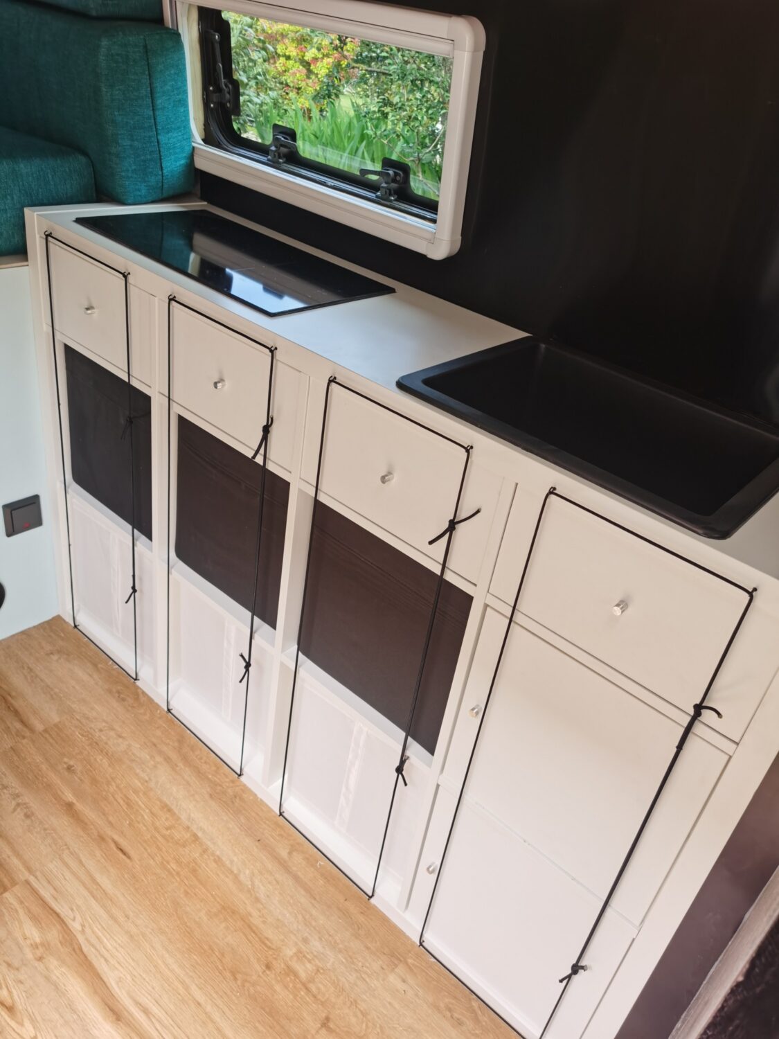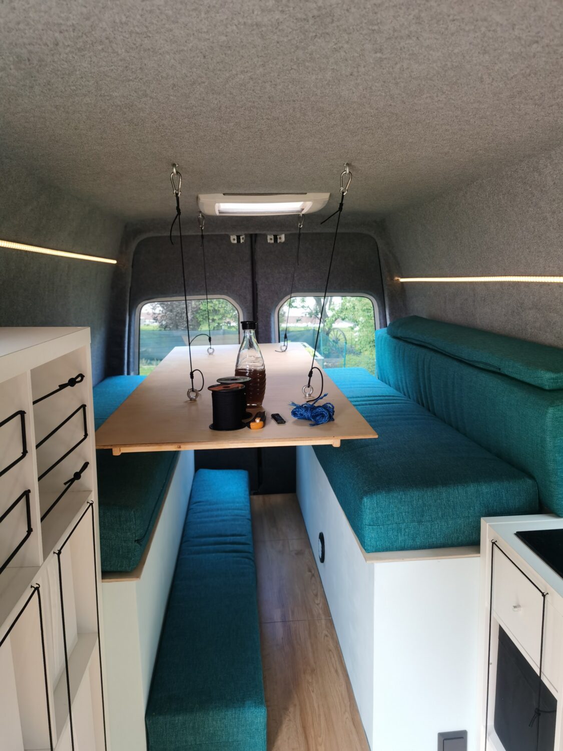 Ausbauzeit: ca. 9 Monate Einbauten: Dusche (Eigenbau), Trockentrenntoilette (Kildwick) , Induktionskochfeld, Solar (Offgridtec), Aufbaubatterie (Offgridtec), Laderegler (Votronic), Batteriemonitor (Votronic), Wechselrichter (Votronic), Kühlbox (Yeticool 12v Kompressor), Duckwassersystem (Lilie), div. modifizierte Möbel (Ikea), Bett (Eigenbau), hängender Esstisch (Eigenbau), Markise (Thule)