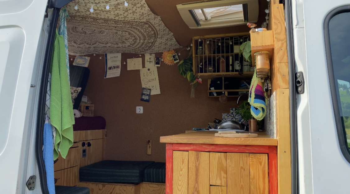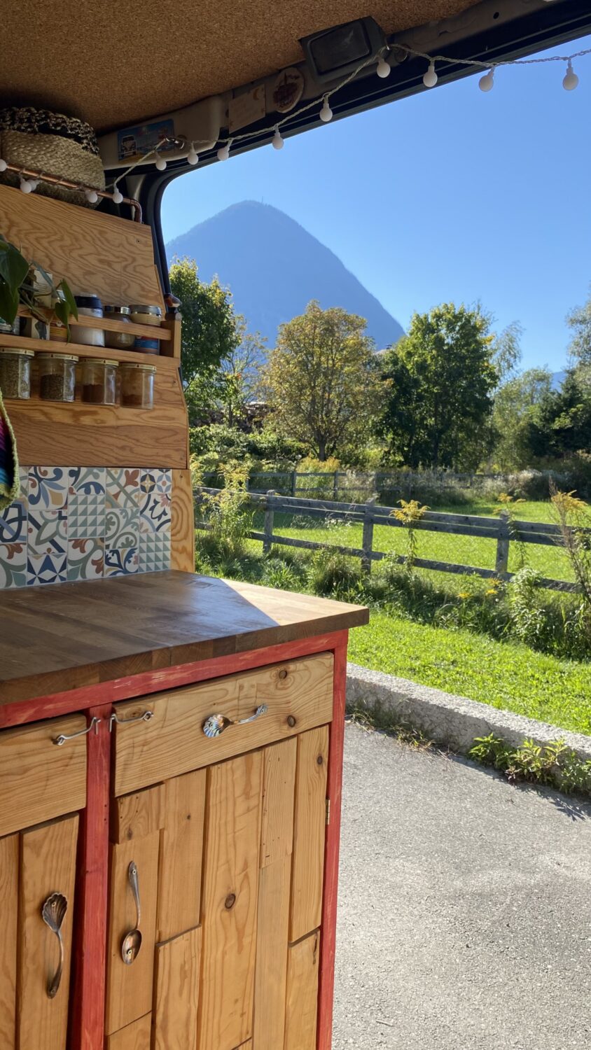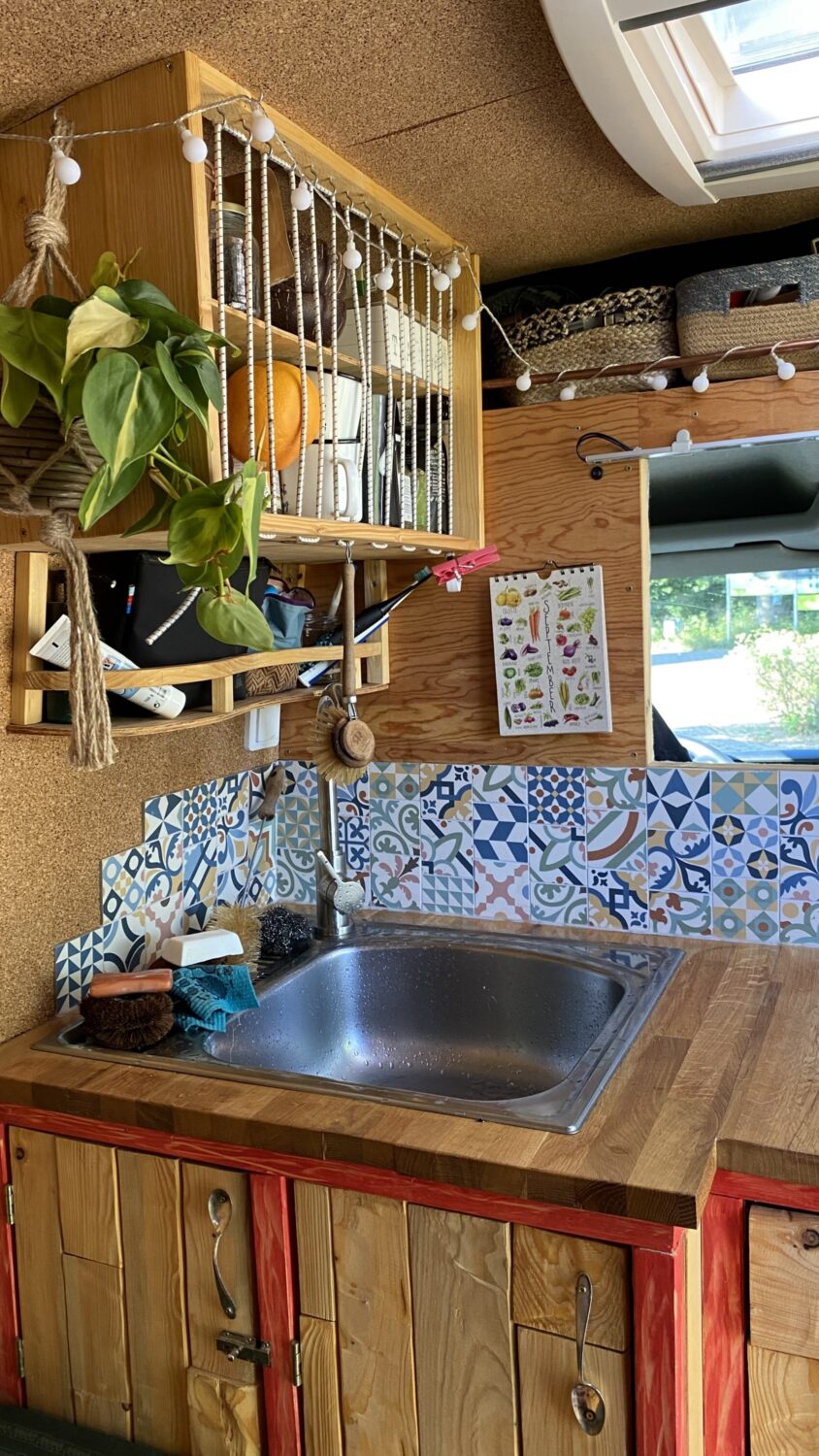 "Wir haben auch versucht ihn so nachhaltig wie möglich auszubauen, das Holz der Küche ist zum Beispiel von alten Einwegpaletten, die Arbeitsplatte hatten Freunde noch übrig" oekocamper