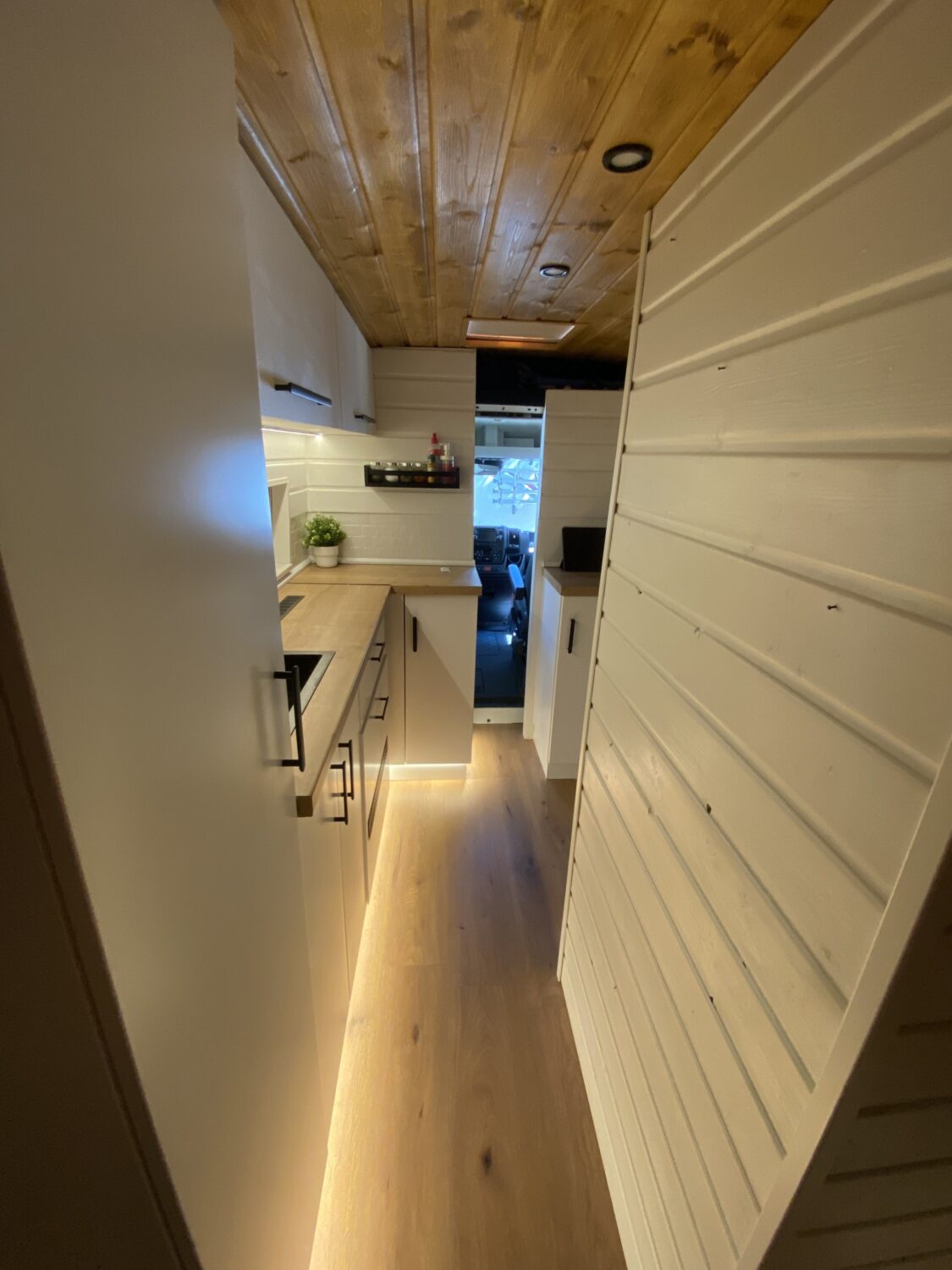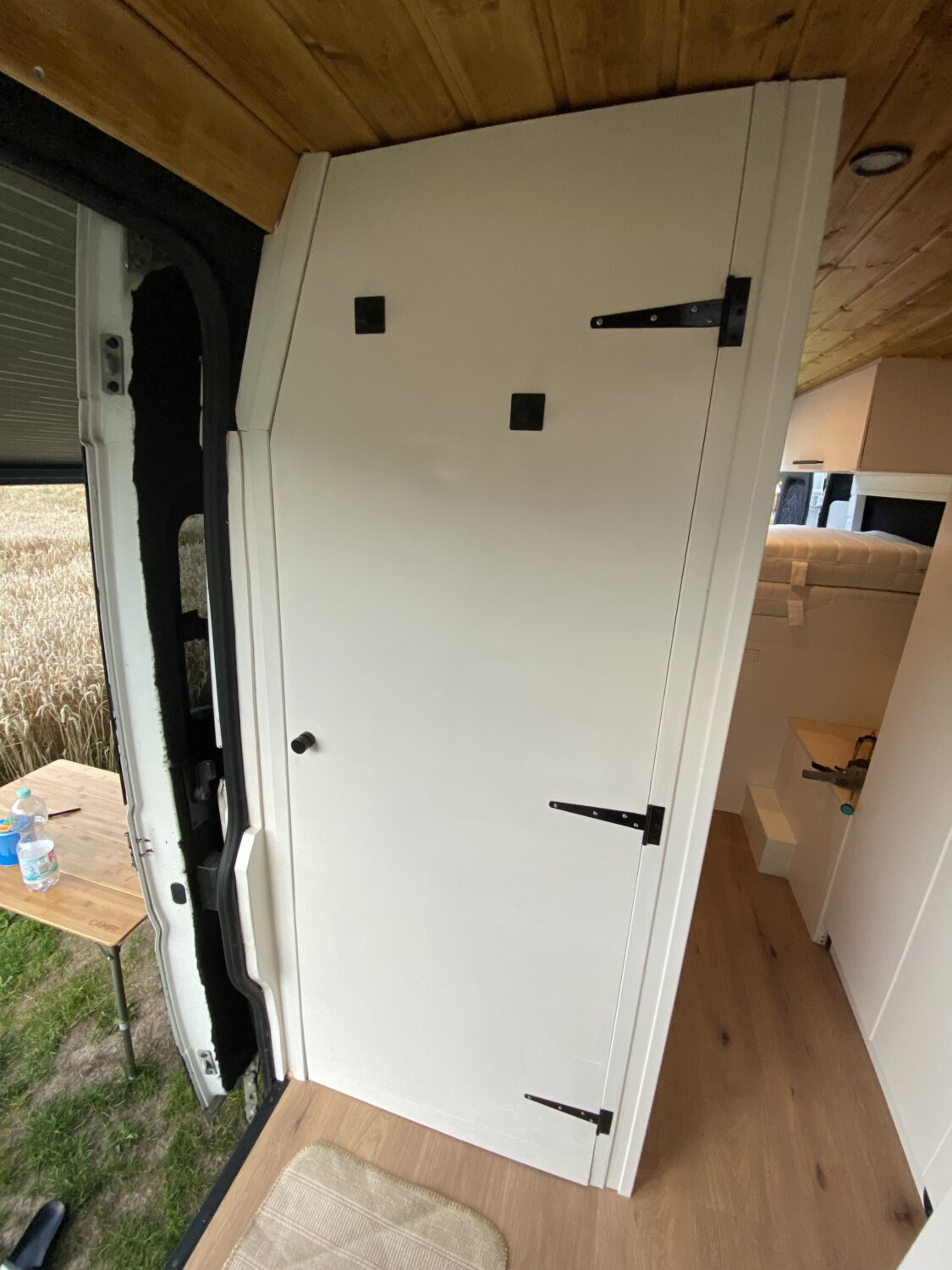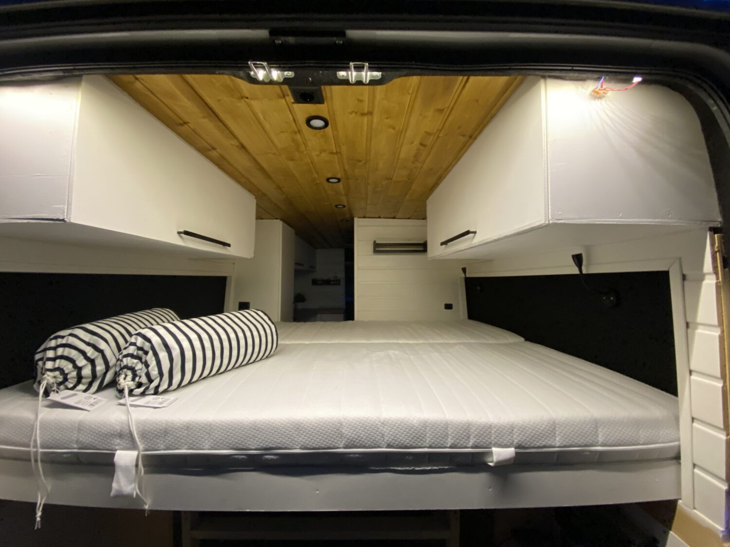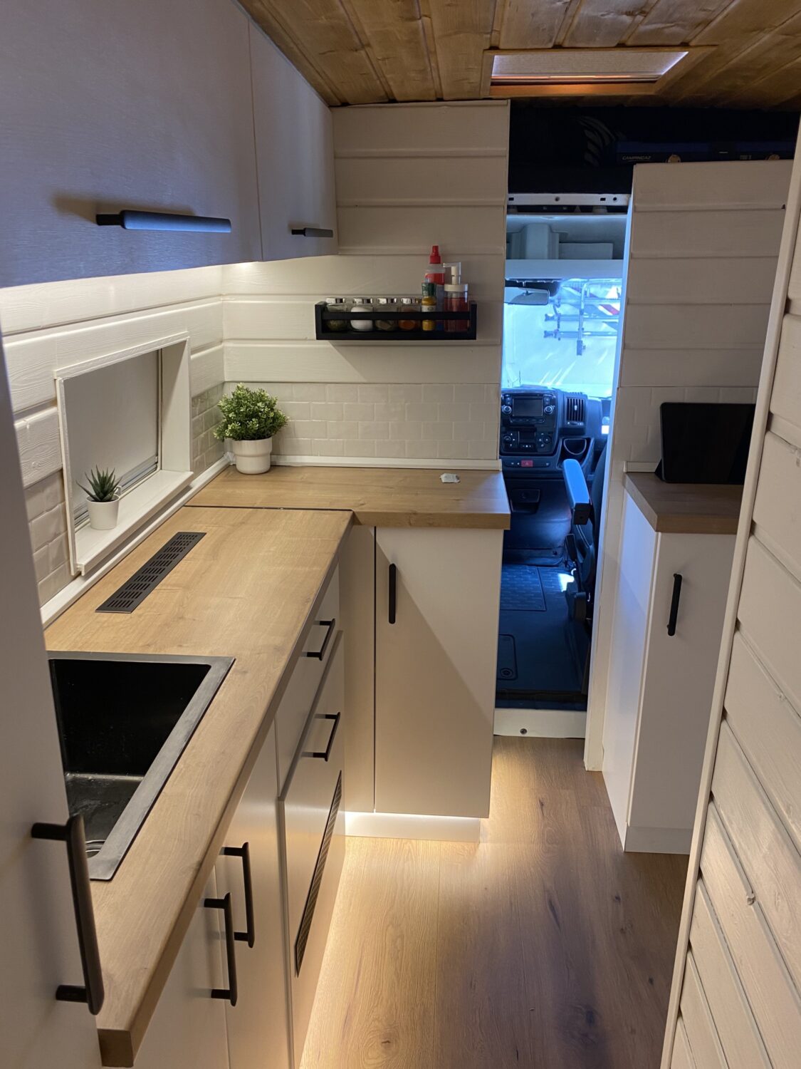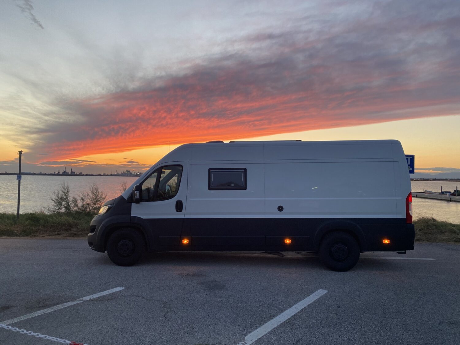 Unser Ausbau hat vom Kauf und Erkernung des Autos bis zur Fertigstellung 4 Monate gedauert. Wir haben jede freie Minute nach der Arbeit und am Wochenende genutzt, bis tief in die Nacht gewerkelt und bis zur Erschöpfung gearbeitet. Besonders stolz wir auf so viele DIY Lösungen, wie beispielsweise unsere speziellen mit Filz verkleideten Holzrahmen, sodass wir eine Breite für unser Bett von 1,9m erreichen konnten oder auch unsere verschiedenen Beleuchtungsmöglichkeiten und Stauräume. Besonders stolz sind wir auch unser Toilettenhäuschen und unsere Küche. Vor allem unsere schwarze Trenntoilette im Häuschen, die teilweise mehr Komfort hat als manche Schüssel zuhause, macht uns sehr glücklich. Allein das erste Mal zu sehen, wie die Lampen im Bus funktionieren und die Batterie über Solar lädt, war für uns Heimwerker-Nullen sensationell. Aber auch außen haben wir ein besonderes Highlight mit dem selbst angebrachten Raptorlack in schwarz mit einer sauberen Trennlinie zum Rest des Autos. In Kombination mit der orangenen Fahrzeugbeleuchtung ein echter Hingucker. Die Kosten für das Fahrzeug beliefen sich auf 11.000€ und mit Ausbau landeten wir am Ende bei 30.000€.