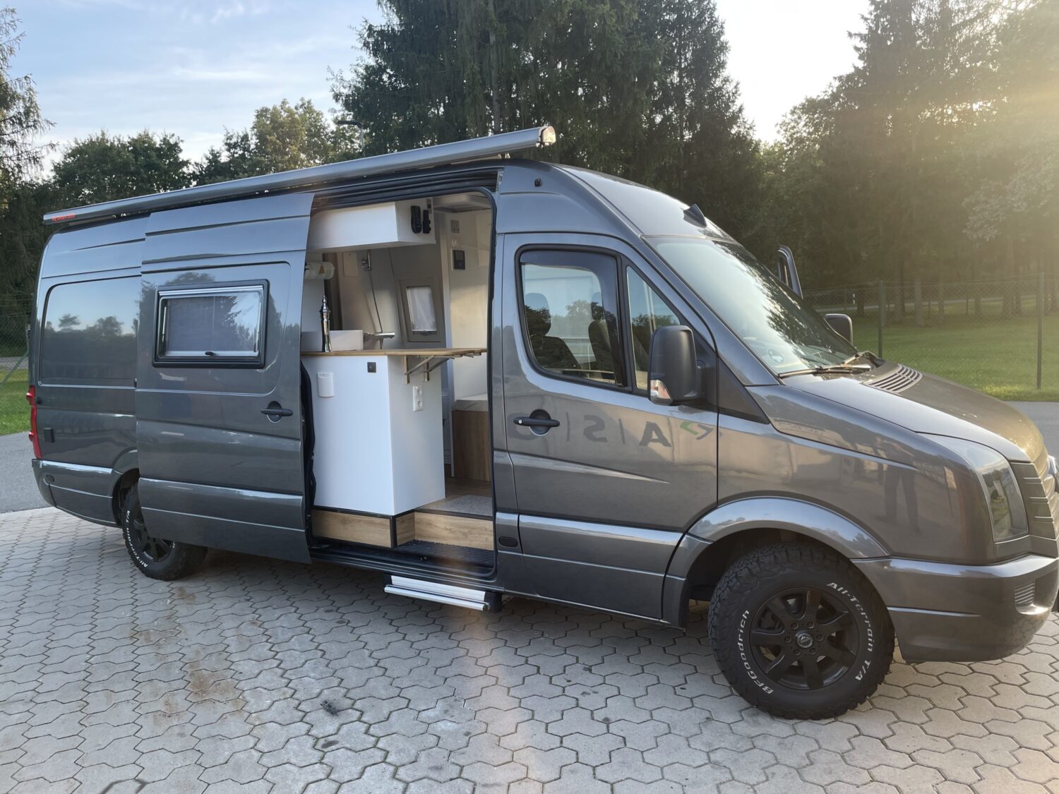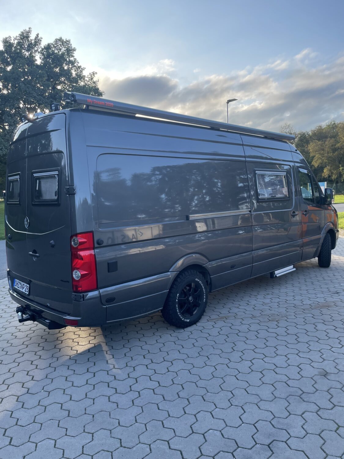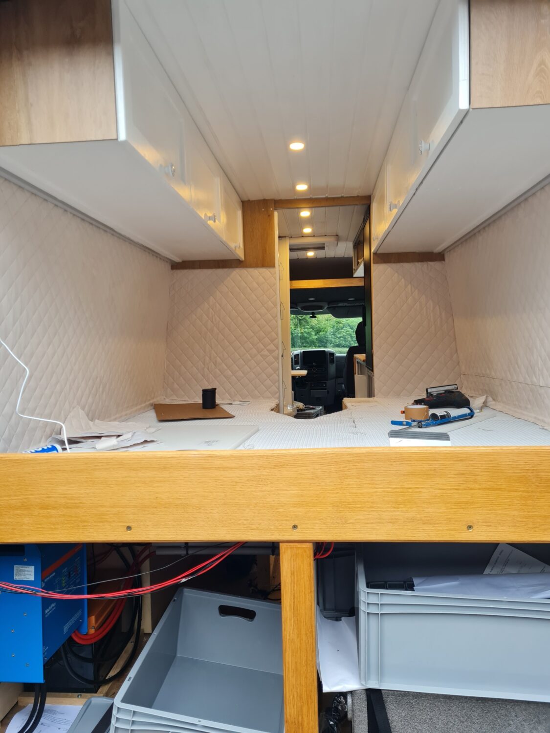 Der Ausbau hat ziemlich genau ein Jahr gedauert. Es wurde eine Dusche, Schiebetür zum Schlafbereich, Längsbett 2*1,80 m, Drehkonsolen Fahrer- und Beifahrerseite, Wechselrichter 3000 Watt Sinus, Solar, Standheizung und vieles mehr verbaut.