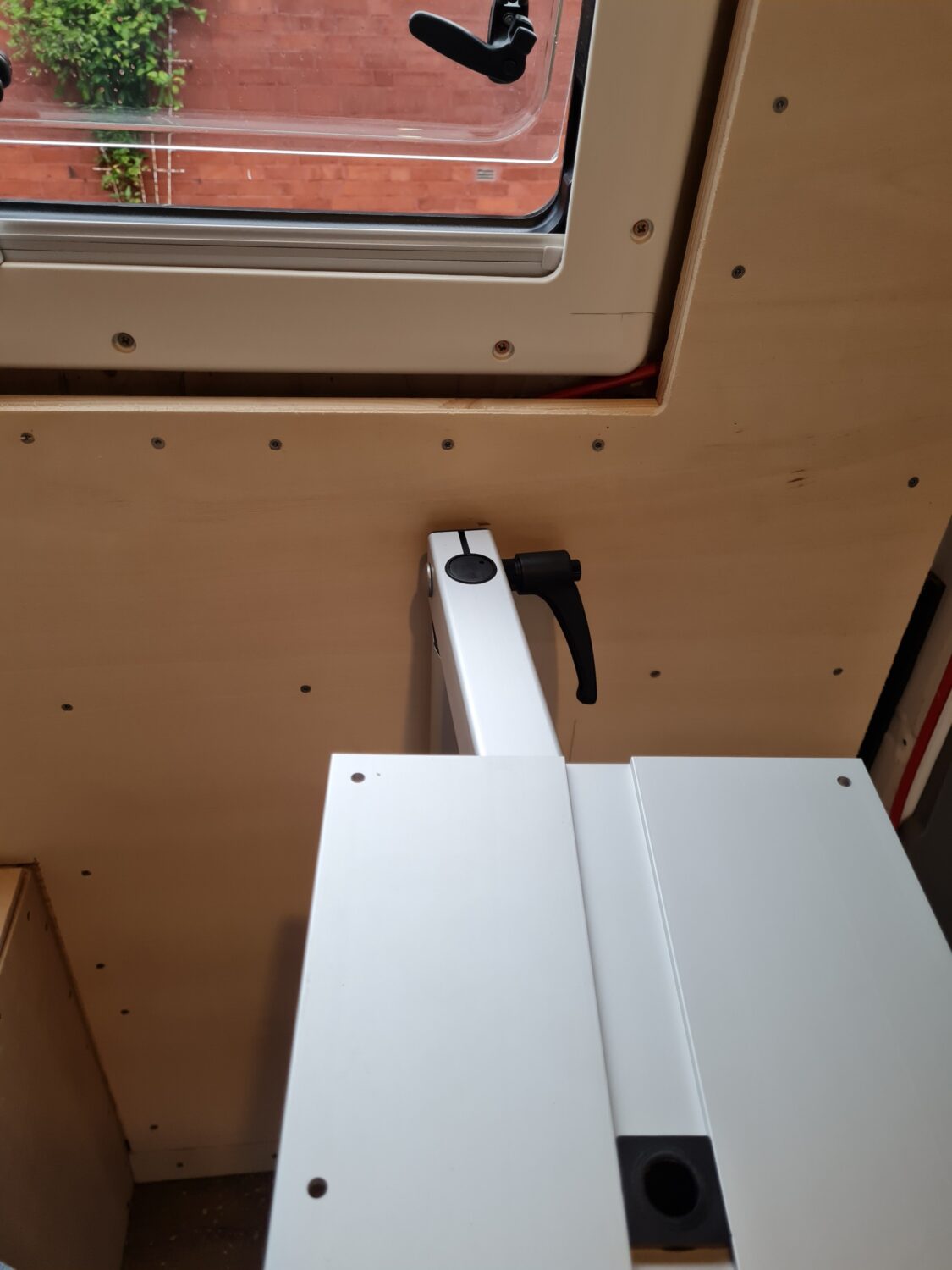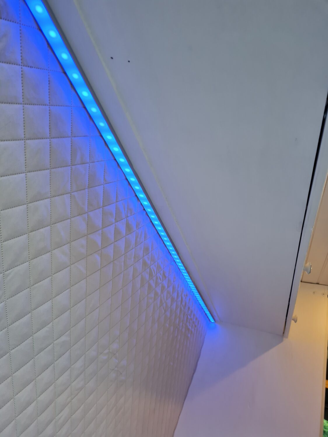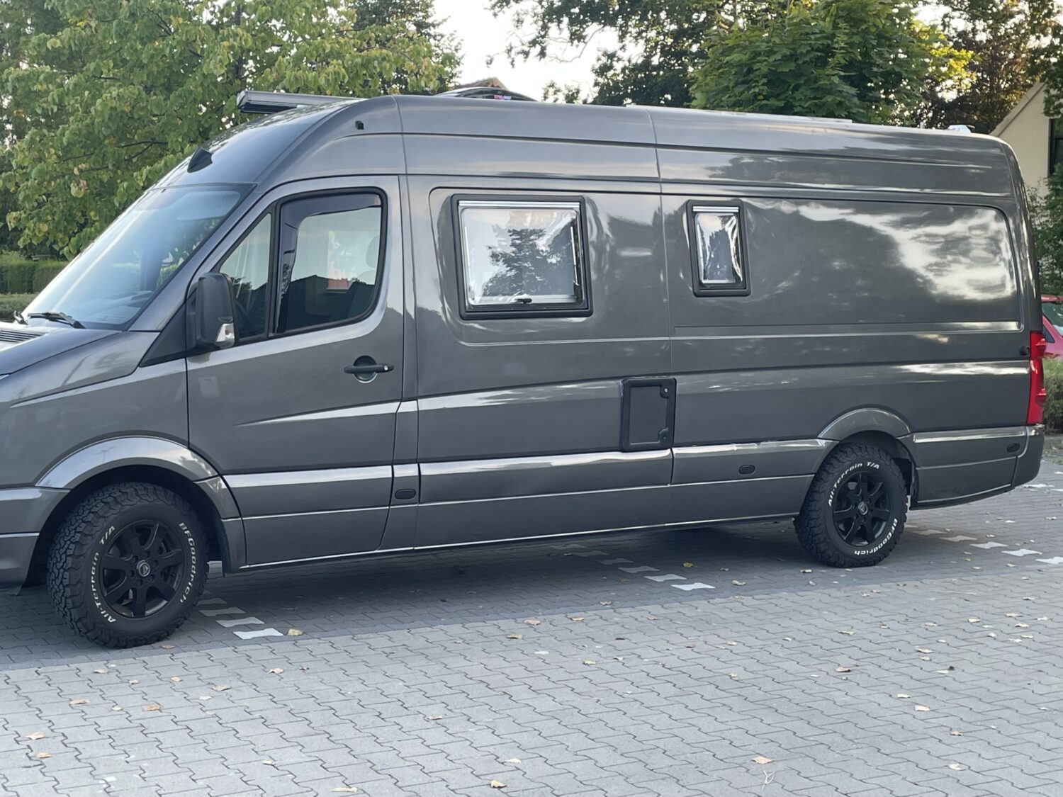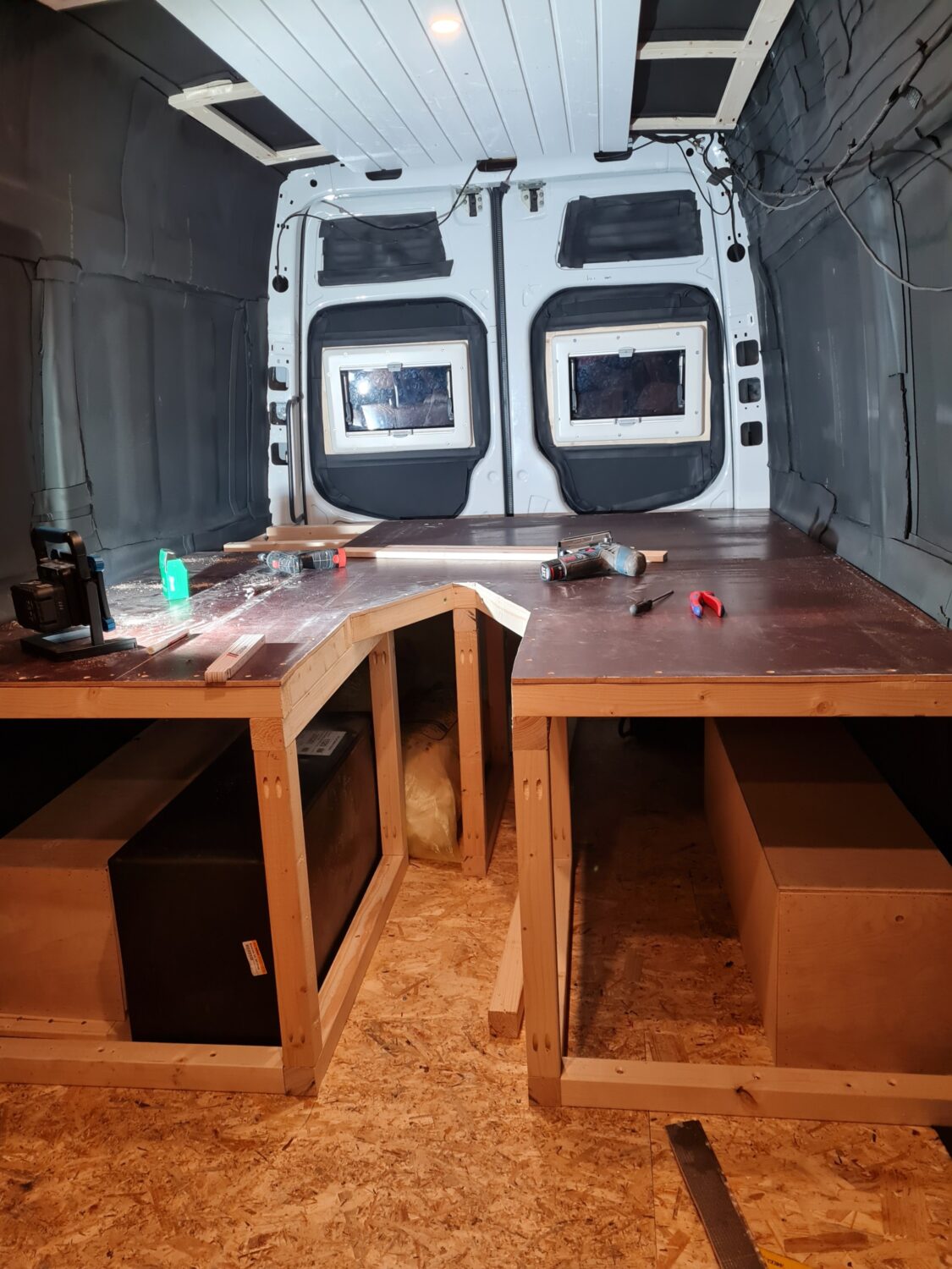 Der Ausbau hat ziemlich genau ein Jahr gedauert. Es wurde eine Dusche, Schiebetür zum Schlafbereich, Längsbett 2*1,80 m, Drehkonsolen Fahrer- und Beifahrerseite, Wechselrichter 3000 Watt Sinus, Solar, Standheizung und vieles mehr verbaut.