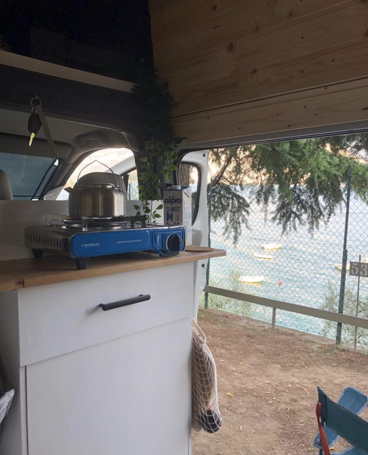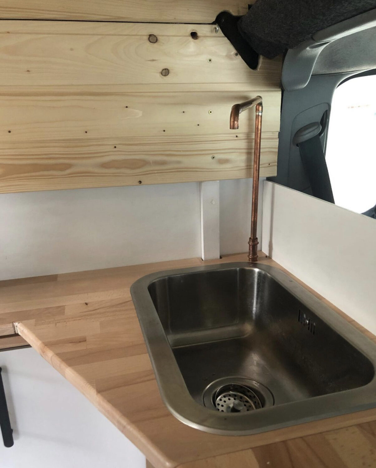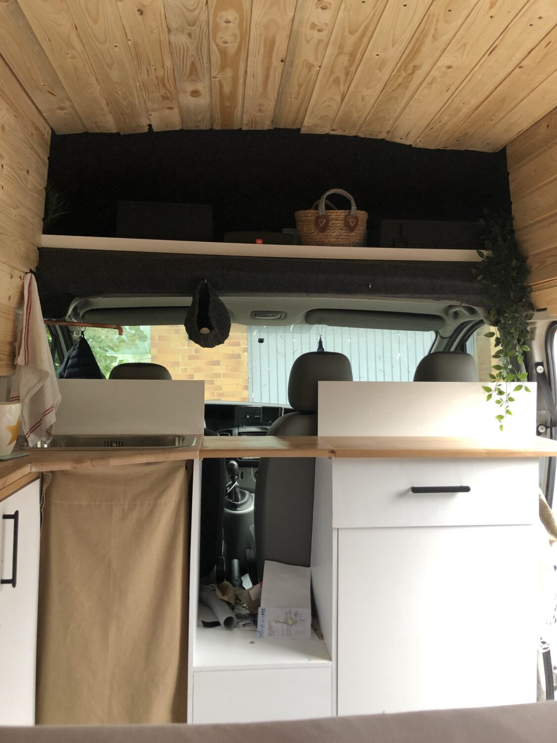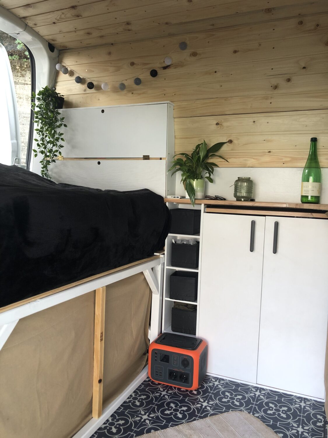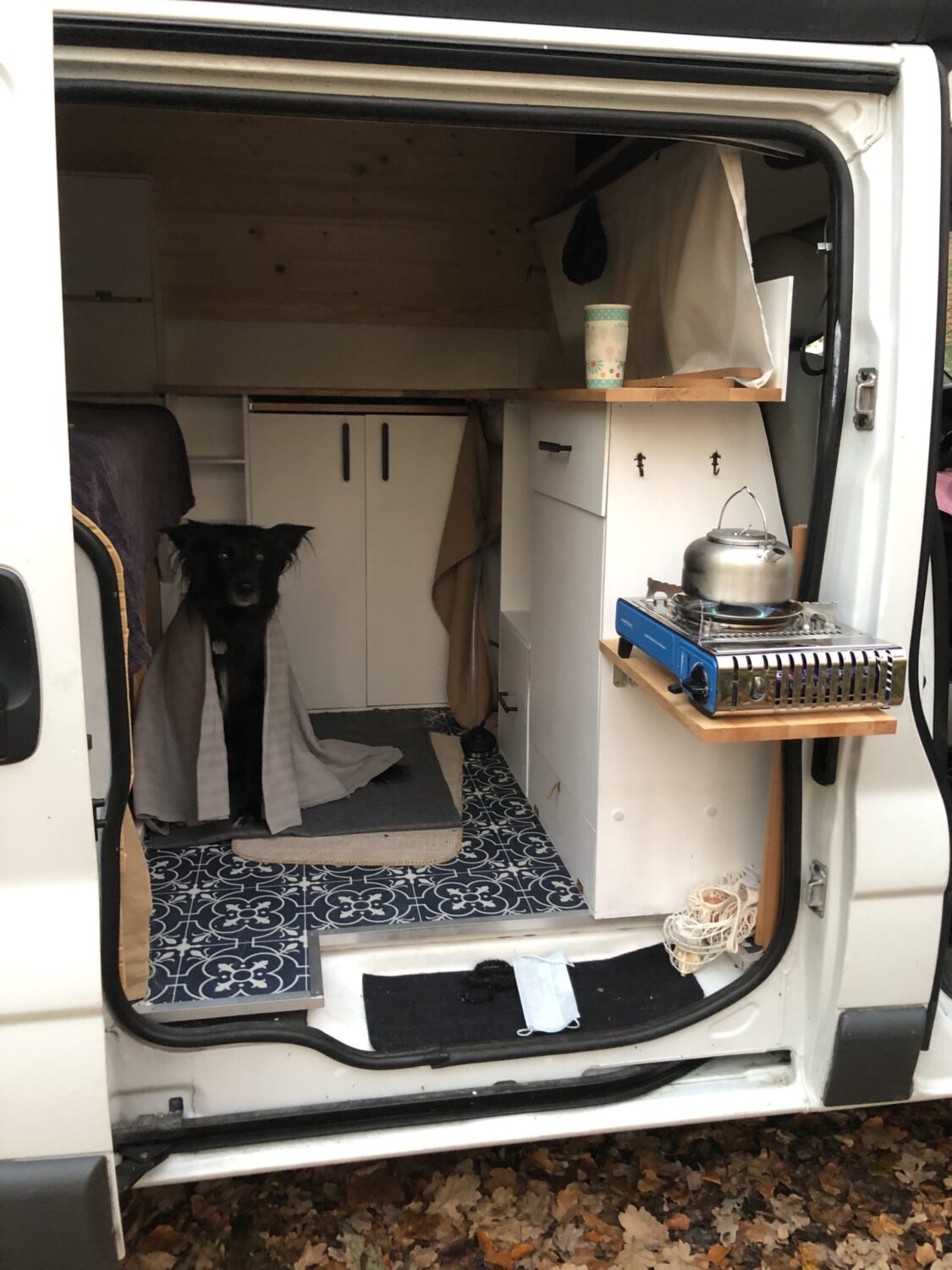 Meine Emma habe ich in ca. 3 1/2 Monaten Vollzeit Ausbau fertig gestellt. Der Ausbau stellte mich zunächst vor eine große Herausforderung. Die innen Boden Maße betragen 240x170cm. Doch mir war eine große Küche und ein normal großes Bett wichtig. Schlussendlich habe ich geschafft diese zwei Sachen zu kombinieren. Mein Bett lässt sich zu 195x140cm Liegefläche ausziehen und besteht aus zwei Matratzen Teilen. Zudem habe ich ein normales Lattenrost verbaut und habe somit einen sehr hohen Schlafkomfort. Ich habe keinen festen Strom verlegt da er mir für diesen kleinen Raum nicht notwendig vorkam. Stattdessen benutze eine Power Station und ein mobiles Solar Panel für den täglichen Bedarf. Zum abwaschen habe ich eine manuelle Fußpumpe, so bin ich komplett autark auch wenn die Sonne es mal nicht so gut mit mir meint. Zum Kochen habe ich einen mobilen Gas Kartuschen Kocher. Meine Arbeitsplatte ein einen herausnehmbaren Teil in der Mitte damit ich ohne Probleme in die Fahrerkabine gelangen kann. Durch die Stehhöhe im Van habe ich auch ausreichend Stauraum unter dem Bett sowie weiteren durch verbaute Schränke und die Ablage über der Fahrer Kabine. Mein Hund schläft vorne auf der Beifahrerbank. Damit sie mehr Platzt hat habe ich ein mobiles Brett, mit welchem ich den Fußraum ihrer Liegefläche hinzufügen kann. Es ist alles selbst gemacht, vom Fenster Einbau, dem verlegen des Bodens bis hin zum Bau der Möbel. Für mehr Bilder schaut gerne auf meinem Instagram Kanal vorbei: vivaro.emma
