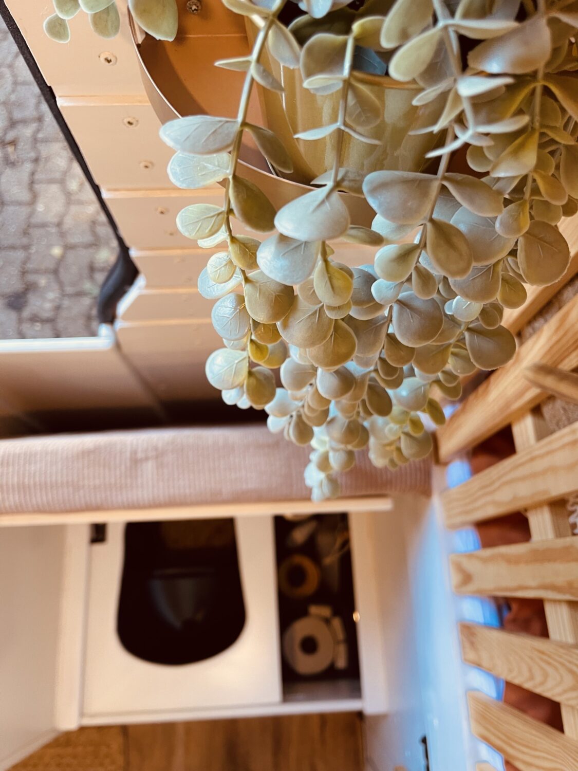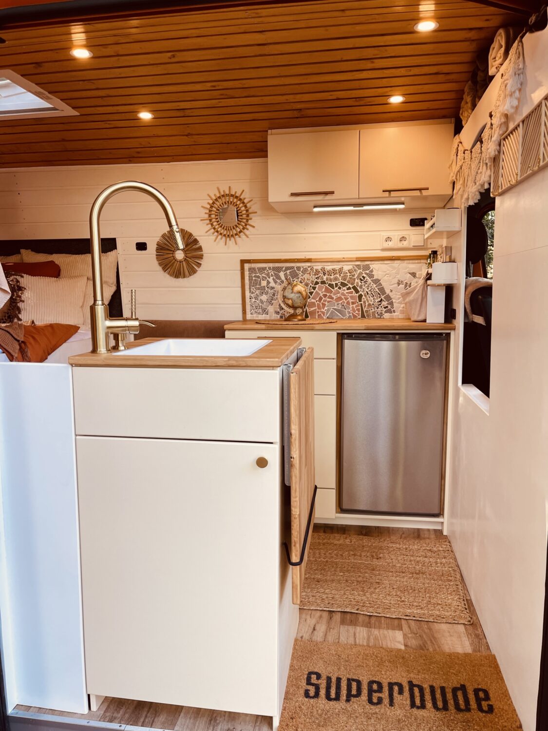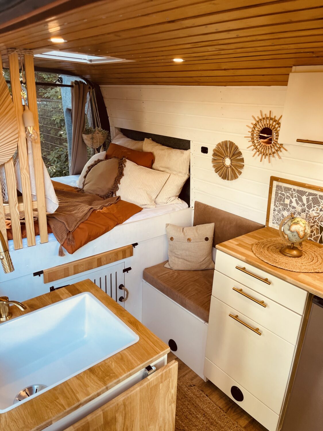 Mahpee verfügt über eine Solaranlage und eine Außensteckdose, damit wir uns keinerlei Sorgen um die Stromversorgung machen müssen. Dadurch sind wir komplett Autark unterwegs. Neben den vielen Verstaumöglichkeiten, verfügt Mahpee über zwei Betten. Eines zum direkten reinwerfen und relaxen und eines, dass wir mit wenigen Handgriffen in der Fahrerkabine errichten. Ideal als Kinderbett. Essen und Trinken? Kein Problem, Mahpee hat eine Küche inkl. Kühlschrank, Spüle und Kochfeld, in der wir alles was unserer Herz begehrt zubereiten können. An kalten Tagen? Sorgt die Standheizung dafür, dass uns warm ums Herz wird. Einige Fakten zum Fahrzeug: - Baujahr: 2014 - 125 PS - Automatik - 80l Tank - Einparkhilfe: hinten - 3 Sitzer - Klimaanlage - L2H2 - Anhängerkupplung Einzelheiten zum Ausbau: - Gewicht ausgebaut: 2.450kg - Zul. Gesamtgewicht: 3,3T - Gedämmt: 19mm & 6mm Armaflex - 1. Bett: 130x190cm - 2. Fahrerkabine (Kinderbett) - Solaranlage 2x 150W - Batterie: 100Ah lithium - Außensteckdose - 12 & 230 Volt Stromkreis - LED Lampen + dimmbares Küchenlicht mit Touch - Waschbecken mit Membranpumpe & integrierten Seifenspender - 70l Frischwassertank - 30l Abwassertank - 80l Kühlschrank - Primus Gaskochfeld - Tisch ausziehbar (80x60cm) - Klapptisch Waschbecken - Dachfenster und Fenster in der Schiebetür