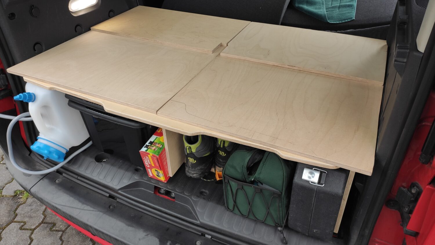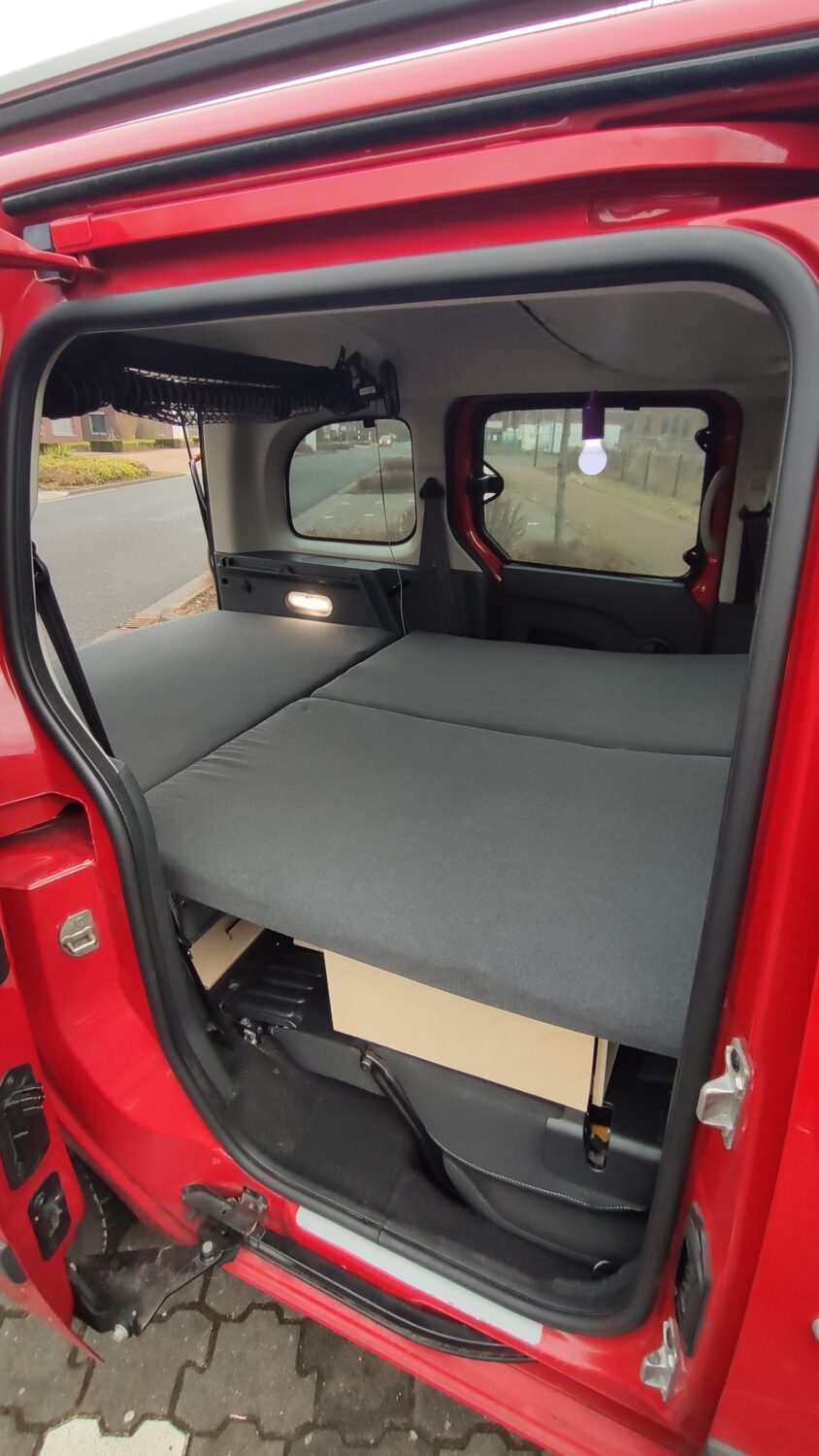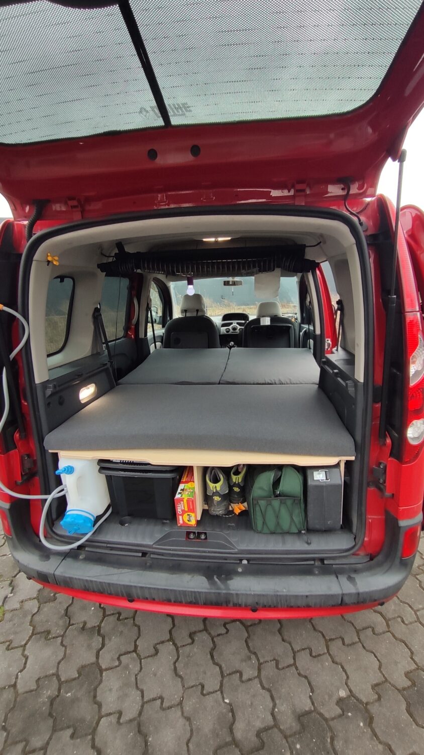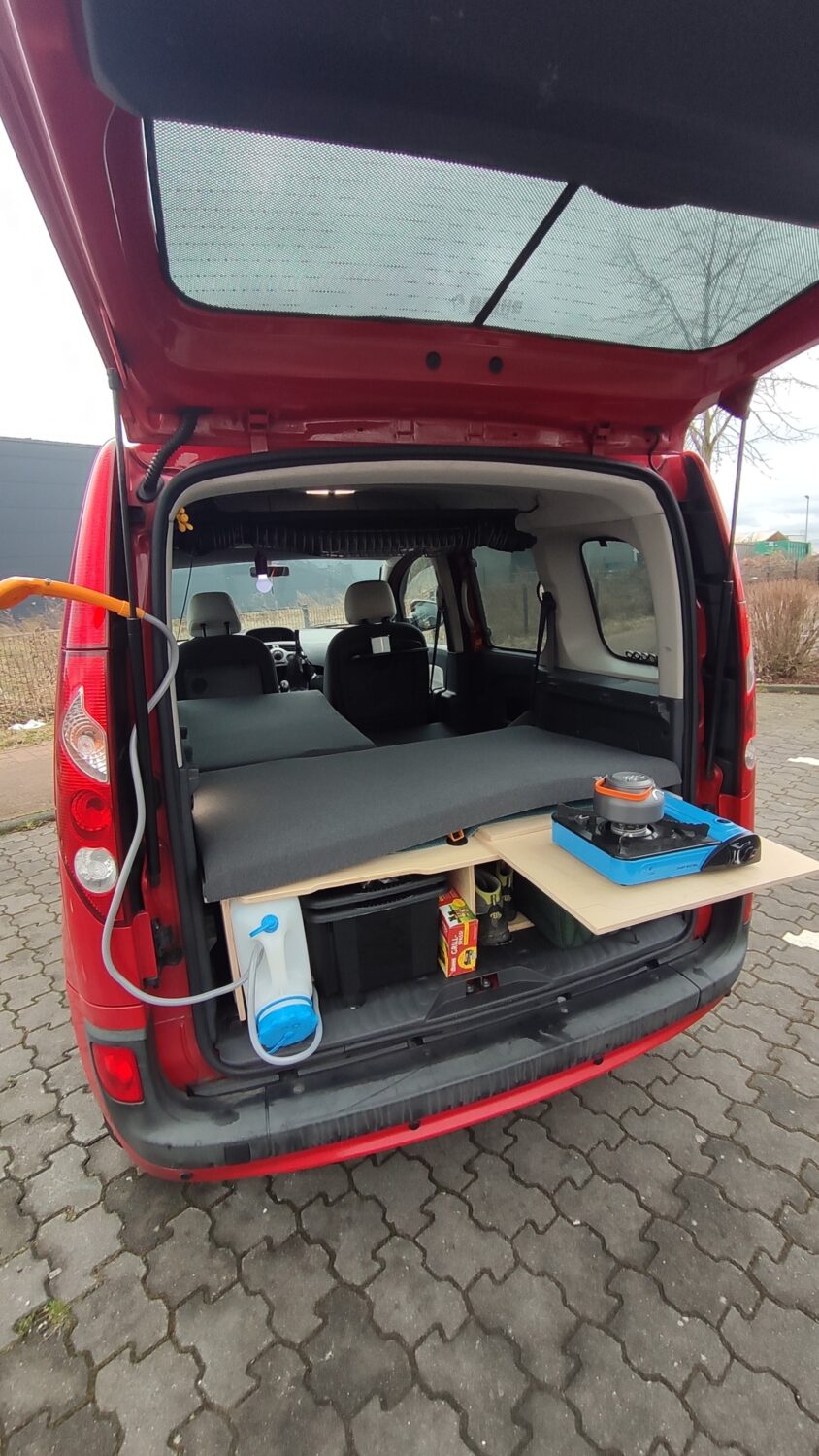 Es ist ein Doppelbett verbaut ,das einfach auch zum Einzelbett umgebaut werden kann. Dann wird der Teil zum Tisch für unter der Heckklappe. Es gibt ein 10 l Wasserkanister eine Außendusche und einen Gaskocher. Unter dem Bett ist Platz für Kisten. Der original "Schrank" im Dachhimmel ist für Kleidung groß genug. Der Wagen ist für Wochenden, Kurztrips und auf Campingplätzen gut geeignet. Bauzeit wären ca 14 Tage und Kosten ca 200€