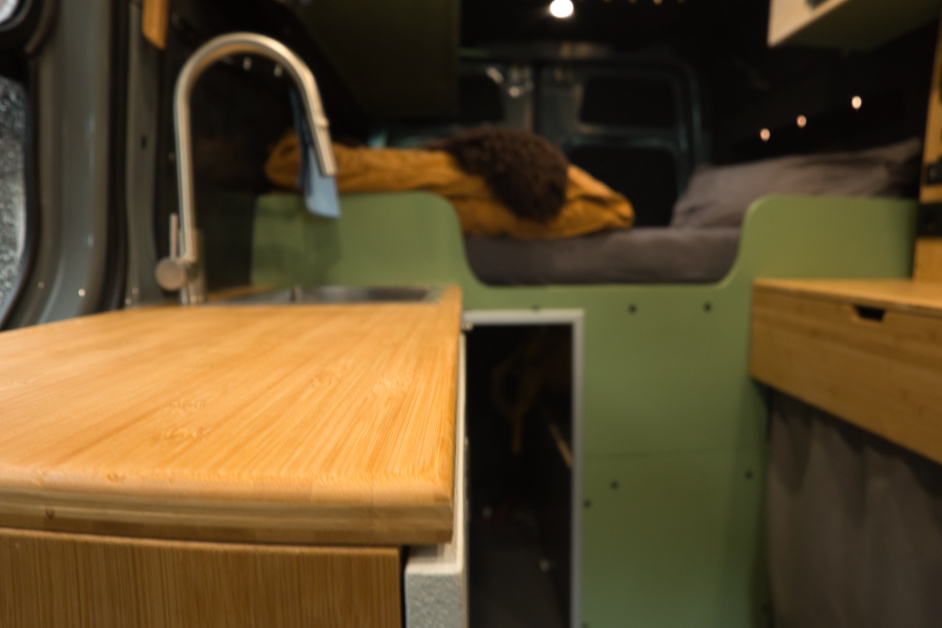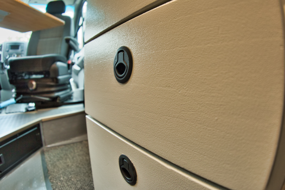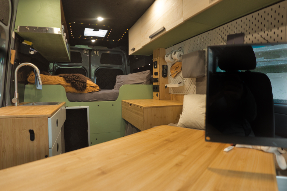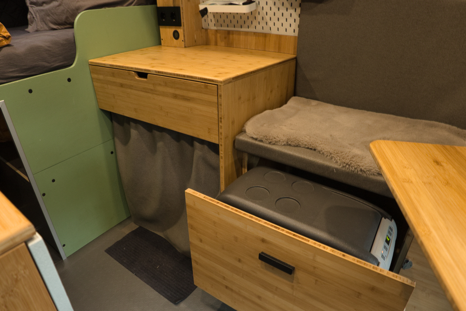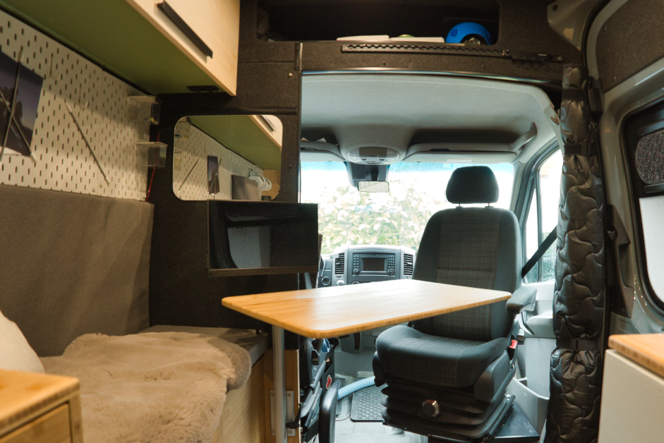 Der Ausbau wird nie fertig, weil es immer was zu tun gibt, immer findet man etwas, das verändert oder verbessert werden kann und das ist auch gut so :-) Ausbauen ist, obwohl völlig "Fachfremd" meine Leidenschaft geworden, aus der ich gerne mehr machen würde. Worauf ich wirklich stolz bin? Ich bin selten auf etwas stolz, aber auf diesen Bus im Ganzen bin ich es, weil ich ihn ganz alleine und ohne Hilfe ausgebaut habe: Von Dämmung über Elektrik/Solar bis Möbelbau, Longsleepern, Dachluken, Standheizung und alles, was sonst noch drinnen ist. Er ist mein fahrendes Büro und Freizeitmobil mit 2 LTE und einer WLAN-Antenne, man kann sitzend und stehend arbeiten, autark mit 240W Solar. Er hat viel Ladefläche, sodass meine ganzen Sporthobbies, meine Feuertonne und die Fotoausrüstung und wenn's ist noch eine zweite Person problemlos mitfahren können. Schlau ist vermutlich das mit Thermomatte abtrennbare Fahrerhaus, wenn es draußen mal richtig zapfig ist; sonst ist der Beifahrersitz drehbar und man kann sich bequem gegenüber sitzen.
