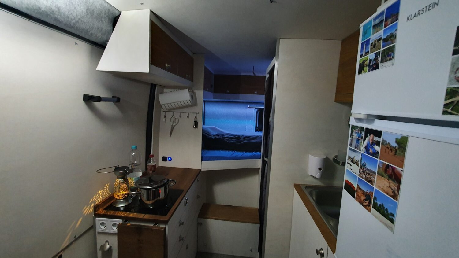 Ausbaudauer ca. 1 Jahr seit 2020 und uns fallen immer noch Verbesserungen ein. Außen schlicht mit Kratzern und Beulen, innen gemütlich in weiß/eiche, mit Dusche, Kühl-/Gefrierkombi, drehbarer Doppelsitzbank, Dachträger und und und.