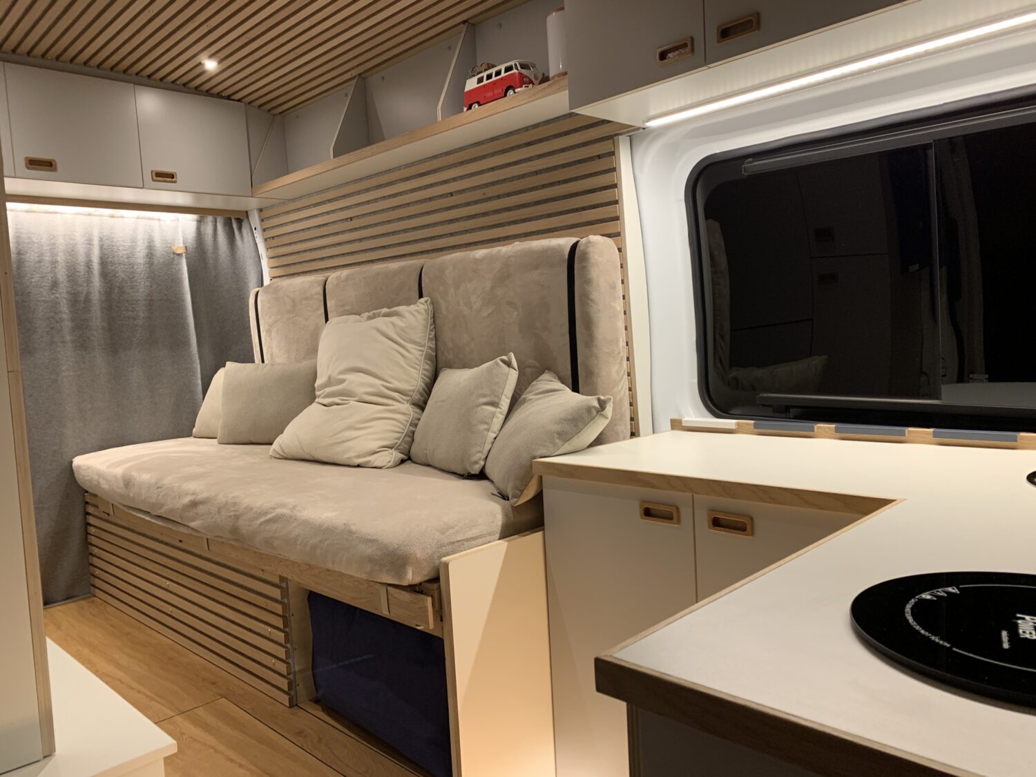 Der Ausbau von „ meinem Dicken- hat rund acht Monate gedauert, insgesamt komme ich auf ca. 1500 Arbeitsstunden. Besonders wichtig war mir ein großer Küchenbereich und Sofa, das ich ganz einfach zum Bett (140 x 200 Meter) umbauen kann. Das Raumkonzept ist sehr offen, obwohl das Fahrzeug nur sechs Meter lang ist. Die Jungfernfahrt ist jetzt (4/2022) gerade zu Ende. Es hat alles funktioniert, nix klappt, nix lose, fast keine offenen Wünsche mehr - ein tolles Gefühl.