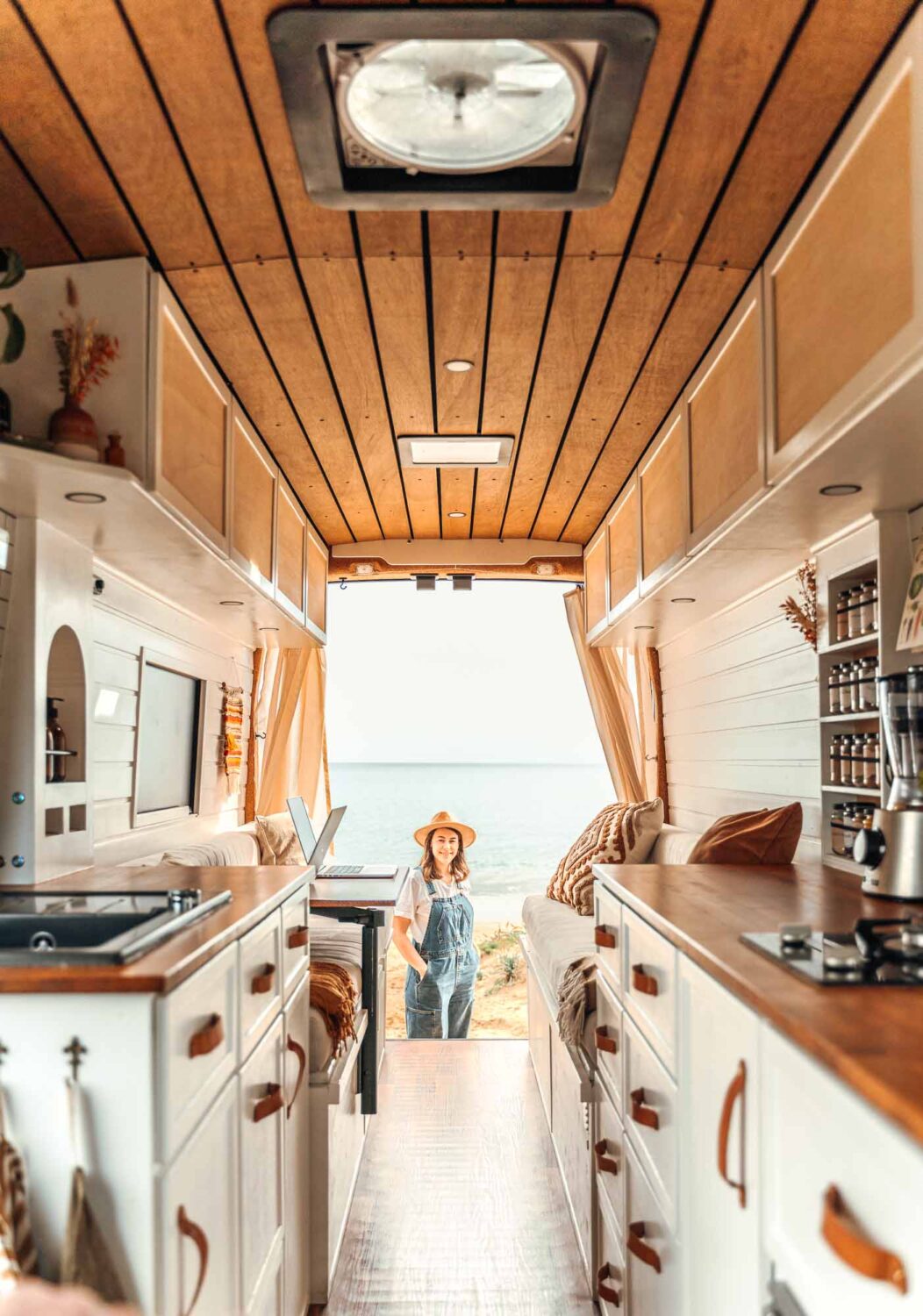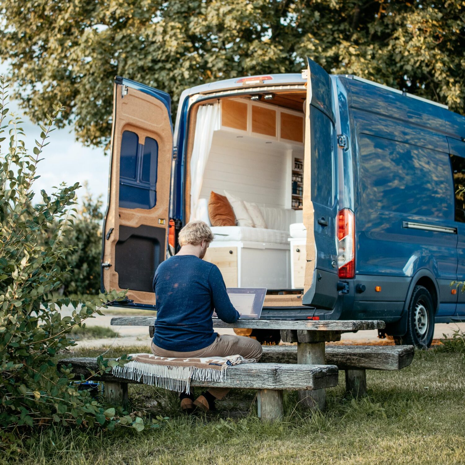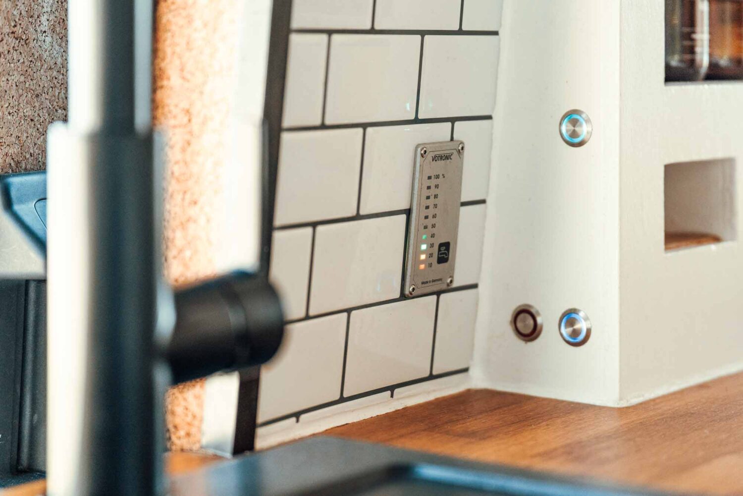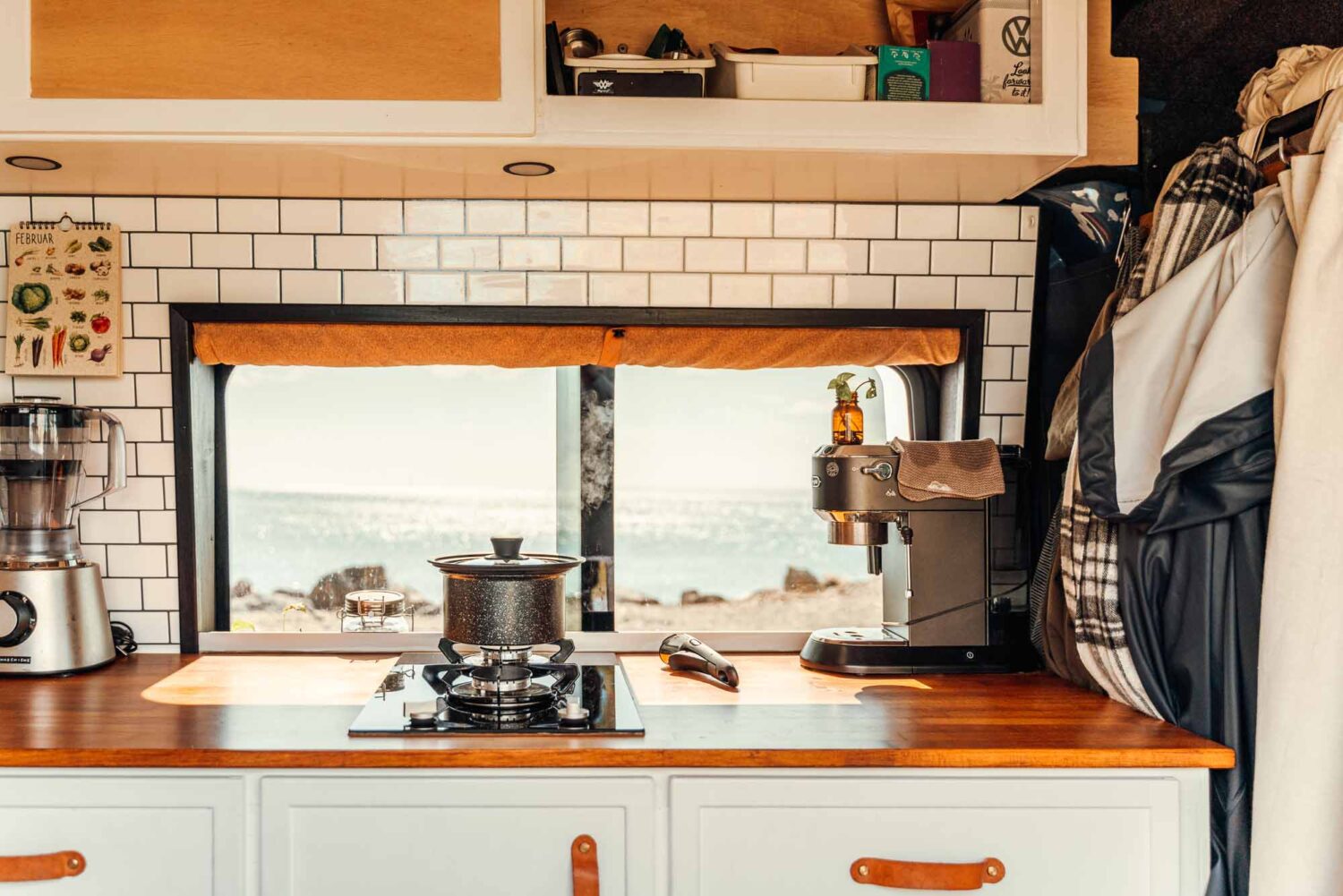 Optik: Wir haben uns für einen hellen, modernen Boho Style mit Landhaustouch entschieden. Uns war sehr wichtig, dass der Van offen und hell wirkt, aber auch nicht komplett weiß ist. Deshalb haben wir mit vielen warmen, erdigen Tönen gearbeitet und Akzente mit Holz und Kork gesetzt. Layout: In der vorderen Hälfte unseres Campervans ist unsere vollausgestattete Küche, mit einer geräumigen Spüle (mit warmen Druckwasser), einem Gaskochfeld mit zwei Brennern, einer Siebträgermaschine, sowie einer multifunktionalen Küchenmaschine und genügend Stauraum für Vorräte. In der hinteren Hälfte haben wir zwei lange Sitzbänke, die uns genug Platz zum Sitzen und Arbeiten bieten. Auch können wir mit unseren zwei Tischen bis zu 8 Personen im Van Platz bieten, gemeinsam Kochen, Essen und einen gemütlichen Spieleabend machen. Der Gang dazwischen lässt den Van offen und geräumig wirken und wir können so durch den kompletten Van durchlaufen â⬓ was wir persönlich total praktisch finden. Abends platzieren wir die Tischplatten zwischen den Bänken, ziehen ein kleines Ausziehgitter im hinteren Drittel der Sitzbank raus und legen die Polster zu einem riesigen 1,70 ÃÂâ 2 m Bett zusammen. Technik: Da wir von unterwegs aus arbeiten haben wir einen Router mit einer externen Antenne verbaut, sowie 200 Ah Lithium Batterien, einen Wechselrichter mit bis zu 3kW, einer 560 Wh Solaranlage und einen Ladebooster verbaut. Außerdem haben wir eine selbstgebaute Alarmanlage gebaut, die automatisch sämtliche Schubladen beim Motorstart verriegelt. Kosten: Insgesamt haben wir für unseren vollausgestatteten Campervan 30.000 € ausgegeben. Darunter befinden sich 8.300 € für unser Basisfahrzeug, 3.500 € für Austausch von Verschleißteilen, 15.000 € für den Ausbau und die Technik und ca.1.000 € für unsere Campingausstattung.