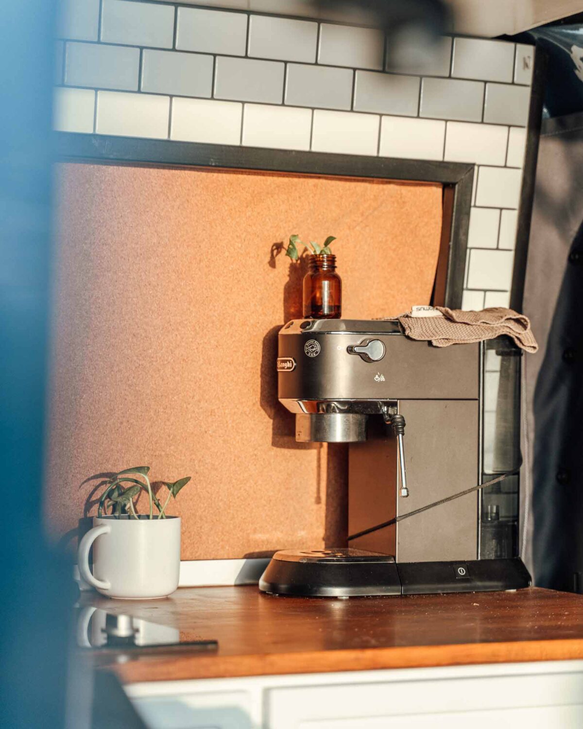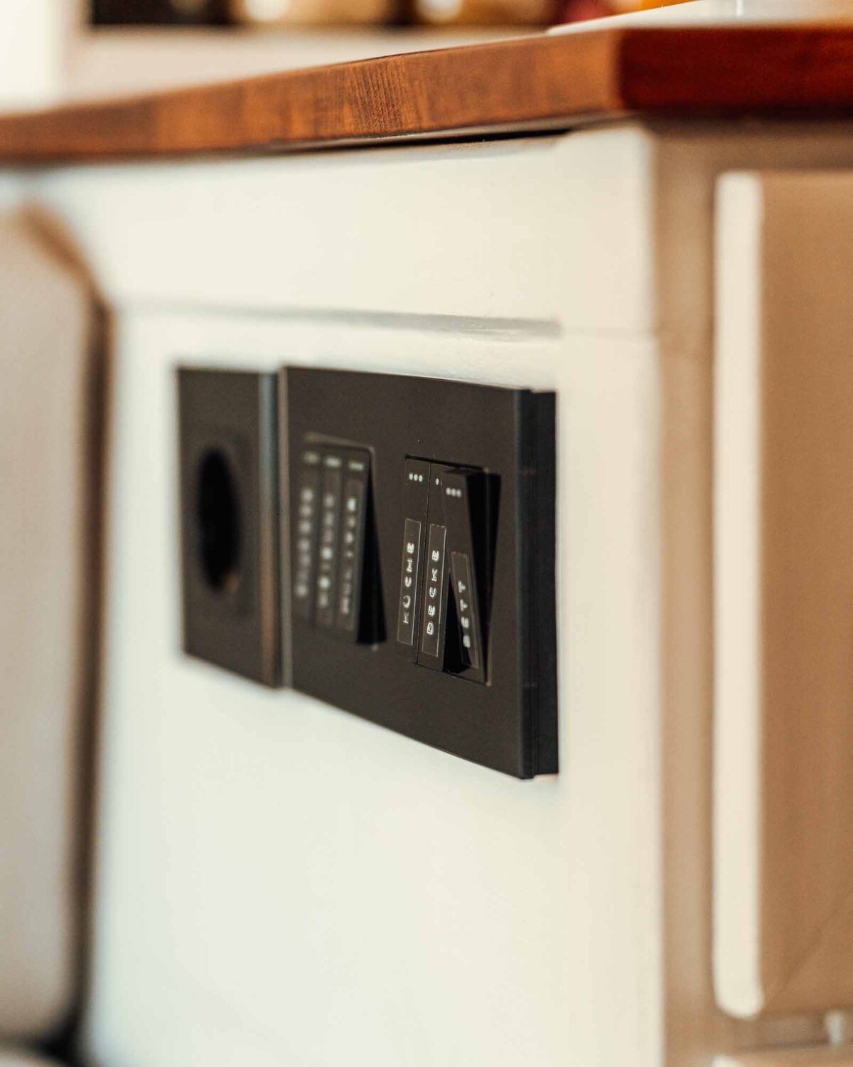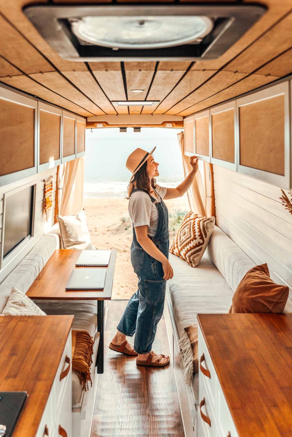 Optik: Wir haben uns für einen hellen, modernen Boho Style mit Landhaustouch entschieden. Uns war sehr wichtig, dass der Van offen und hell wirkt, aber auch nicht komplett weiß ist. Deshalb haben wir mit vielen warmen, erdigen Tönen gearbeitet und Akzente mit Holz und Kork gesetzt. Layout: In der vorderen Hälfte unseres Campervans ist unsere vollausgestattete Küche, mit einer geräumigen Spüle (mit warmen Druckwasser), einem Gaskochfeld mit zwei Brennern, einer Siebträgermaschine, sowie einer multifunktionalen Küchenmaschine und genügend Stauraum für Vorräte. In der hinteren Hälfte haben wir zwei lange Sitzbänke, die uns genug Platz zum Sitzen und Arbeiten bieten. Auch können wir mit unseren zwei Tischen bis zu 8 Personen im Van Platz bieten, gemeinsam Kochen, Essen und einen gemütlichen Spieleabend machen. Der Gang dazwischen lässt den Van offen und geräumig wirken und wir können so durch den kompletten Van durchlaufen â⬓ was wir persönlich total praktisch finden. Abends platzieren wir die Tischplatten zwischen den Bänken, ziehen ein kleines Ausziehgitter im hinteren Drittel der Sitzbank raus und legen die Polster zu einem riesigen 1,70 ÃÂâ 2 m Bett zusammen. Technik: Da wir von unterwegs aus arbeiten haben wir einen Router mit einer externen Antenne verbaut, sowie 200 Ah Lithium Batterien, einen Wechselrichter mit bis zu 3kW, einer 560 Wh Solaranlage und einen Ladebooster verbaut. Außerdem haben wir eine selbstgebaute Alarmanlage gebaut, die automatisch sämtliche Schubladen beim Motorstart verriegelt. Kosten: Insgesamt haben wir für unseren vollausgestatteten Campervan 30.000 € ausgegeben. Darunter befinden sich 8.300 € für unser Basisfahrzeug, 3.500 € für Austausch von Verschleißteilen, 15.000 € für den Ausbau und die Technik und ca.1.000 € für unsere Campingausstattung.