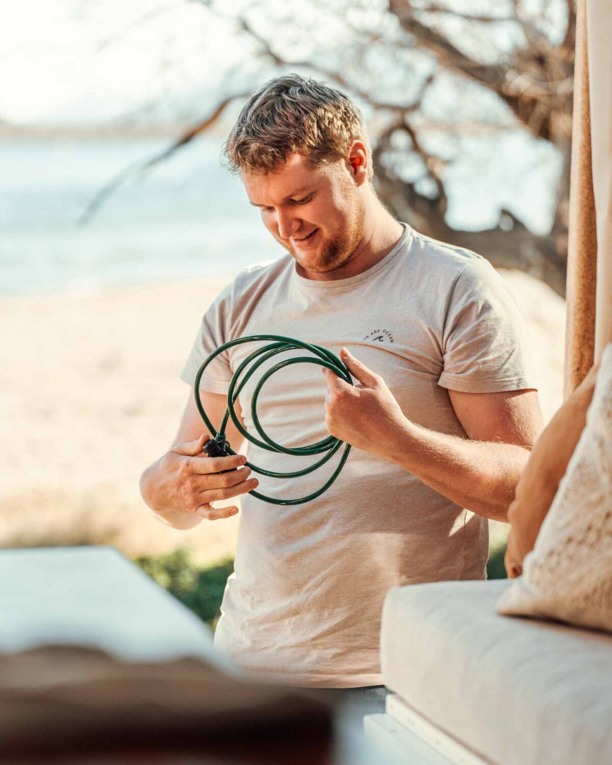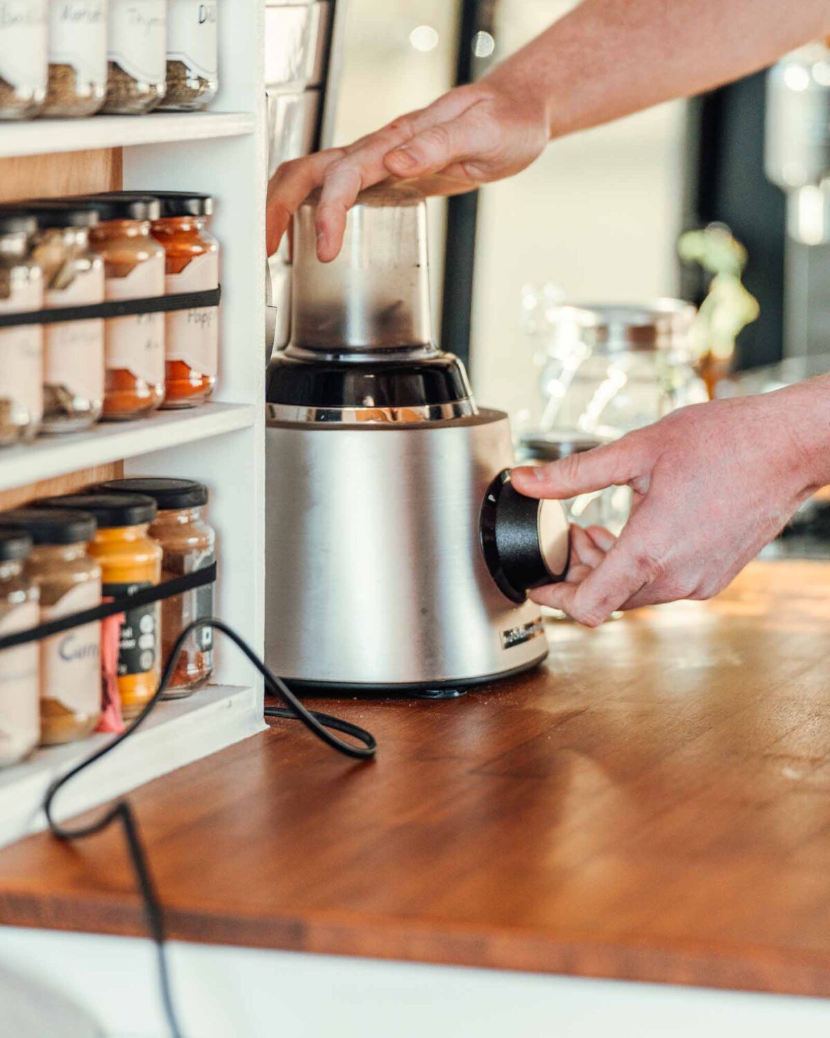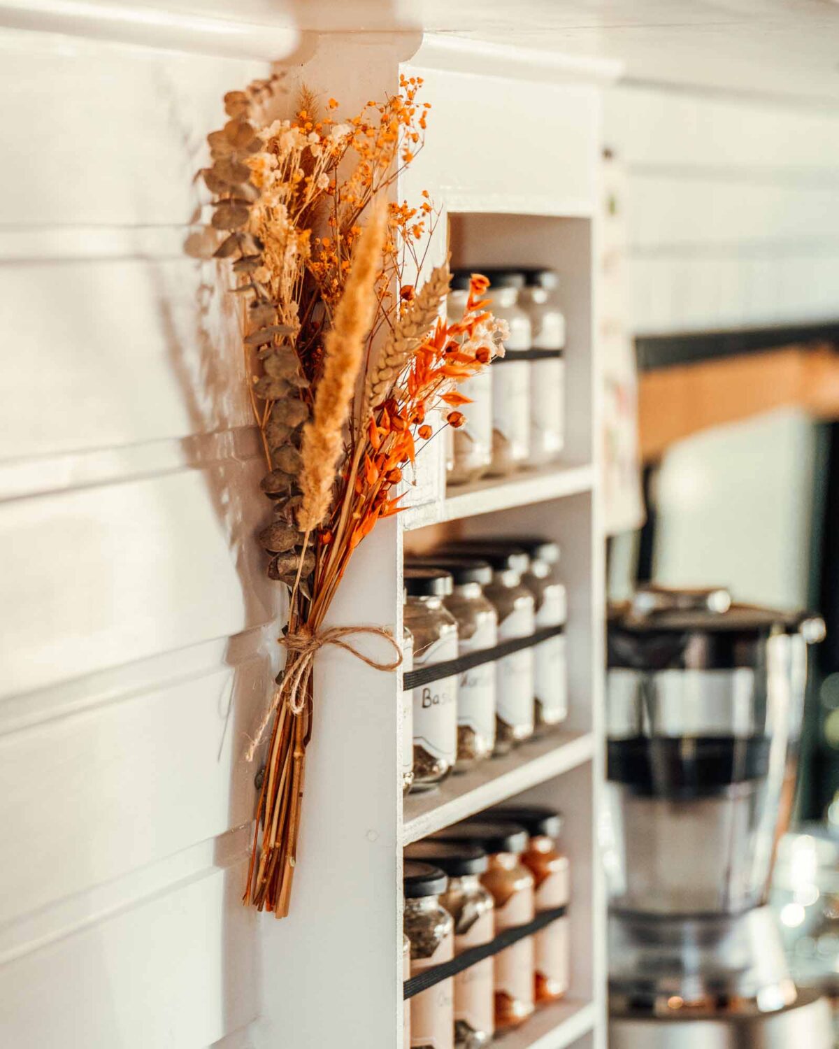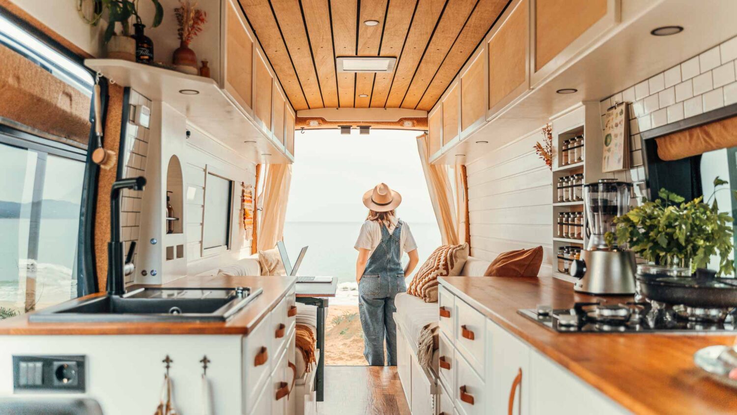 Optik: Wir haben uns für einen hellen, modernen Boho Style mit Landhaustouch entschieden. Uns war sehr wichtig, dass der Van offen und hell wirkt, aber auch nicht komplett weiß ist. Deshalb haben wir mit vielen warmen, erdigen Tönen gearbeitet und Akzente mit Holz und Kork gesetzt. Layout: In der vorderen Hälfte unseres Campervans ist unsere vollausgestattete Küche, mit einer geräumigen Spüle (mit warmen Druckwasser), einem Gaskochfeld mit zwei Brennern, einer Siebträgermaschine, sowie einer multifunktionalen Küchenmaschine und genügend Stauraum für Vorräte. In der hinteren Hälfte haben wir zwei lange Sitzbänke, die uns genug Platz zum Sitzen und Arbeiten bieten. Auch können wir mit unseren zwei Tischen bis zu 8 Personen im Van Platz bieten, gemeinsam Kochen, Essen und einen gemütlichen Spieleabend machen. Der Gang dazwischen lässt den Van offen und geräumig wirken und wir können so durch den kompletten Van durchlaufen â⬓ was wir persönlich total praktisch finden. Abends platzieren wir die Tischplatten zwischen den Bänken, ziehen ein kleines Ausziehgitter im hinteren Drittel der Sitzbank raus und legen die Polster zu einem riesigen 1,70 ÃÂâ 2 m Bett zusammen. Technik: Da wir von unterwegs aus arbeiten haben wir einen Router mit einer externen Antenne verbaut, sowie 200 Ah Lithium Batterien, einen Wechselrichter mit bis zu 3kW, einer 560 Wh Solaranlage und einen Ladebooster verbaut. Außerdem haben wir eine selbstgebaute Alarmanlage gebaut, die automatisch sämtliche Schubladen beim Motorstart verriegelt. Kosten: Insgesamt haben wir für unseren vollausgestatteten Campervan 30.000 € ausgegeben. Darunter befinden sich 8.300 € für unser Basisfahrzeug, 3.500 € für Austausch von Verschleißteilen, 15.000 € für den Ausbau und die Technik und ca.1.000 € für unsere Campingausstattung.