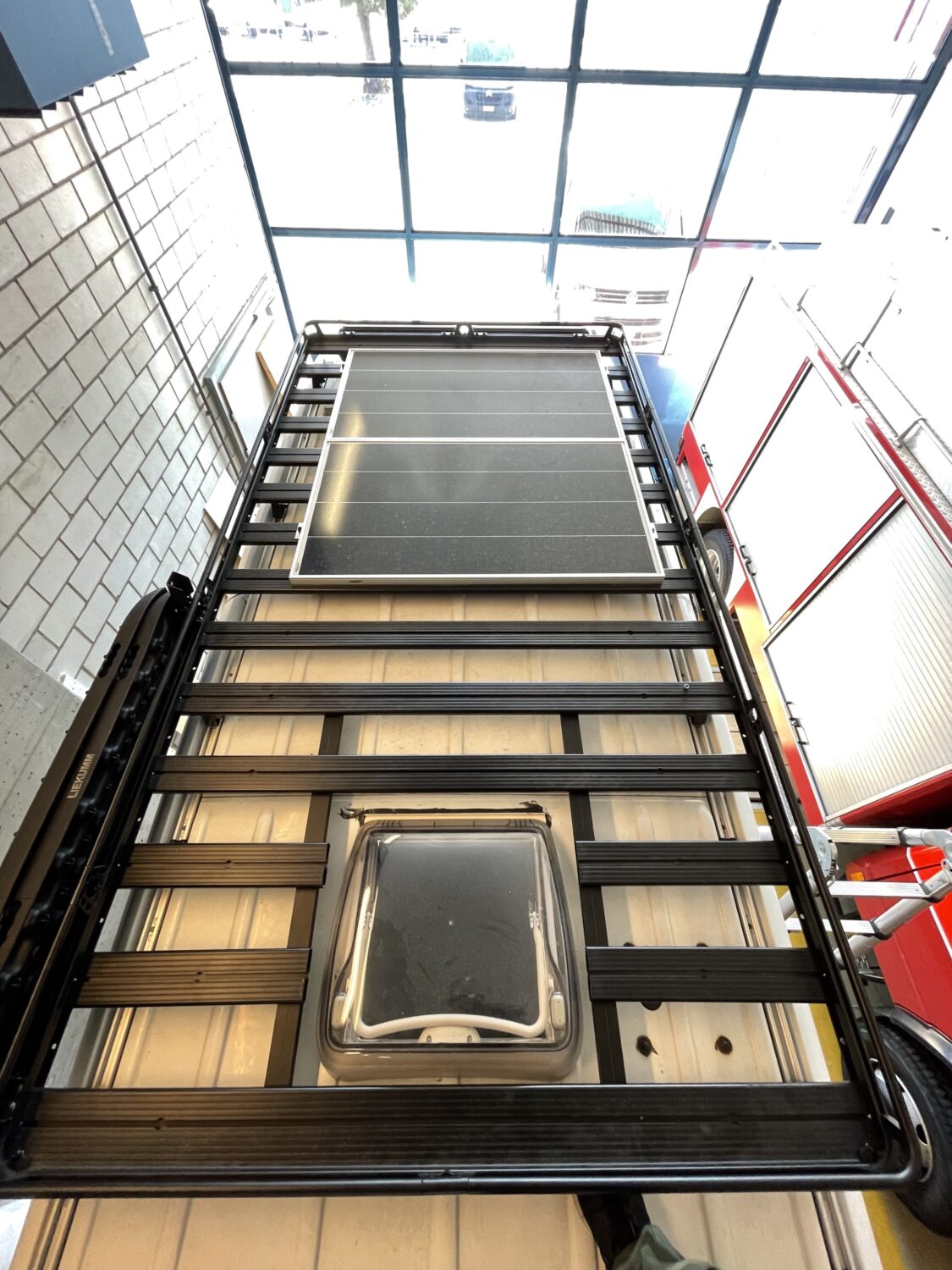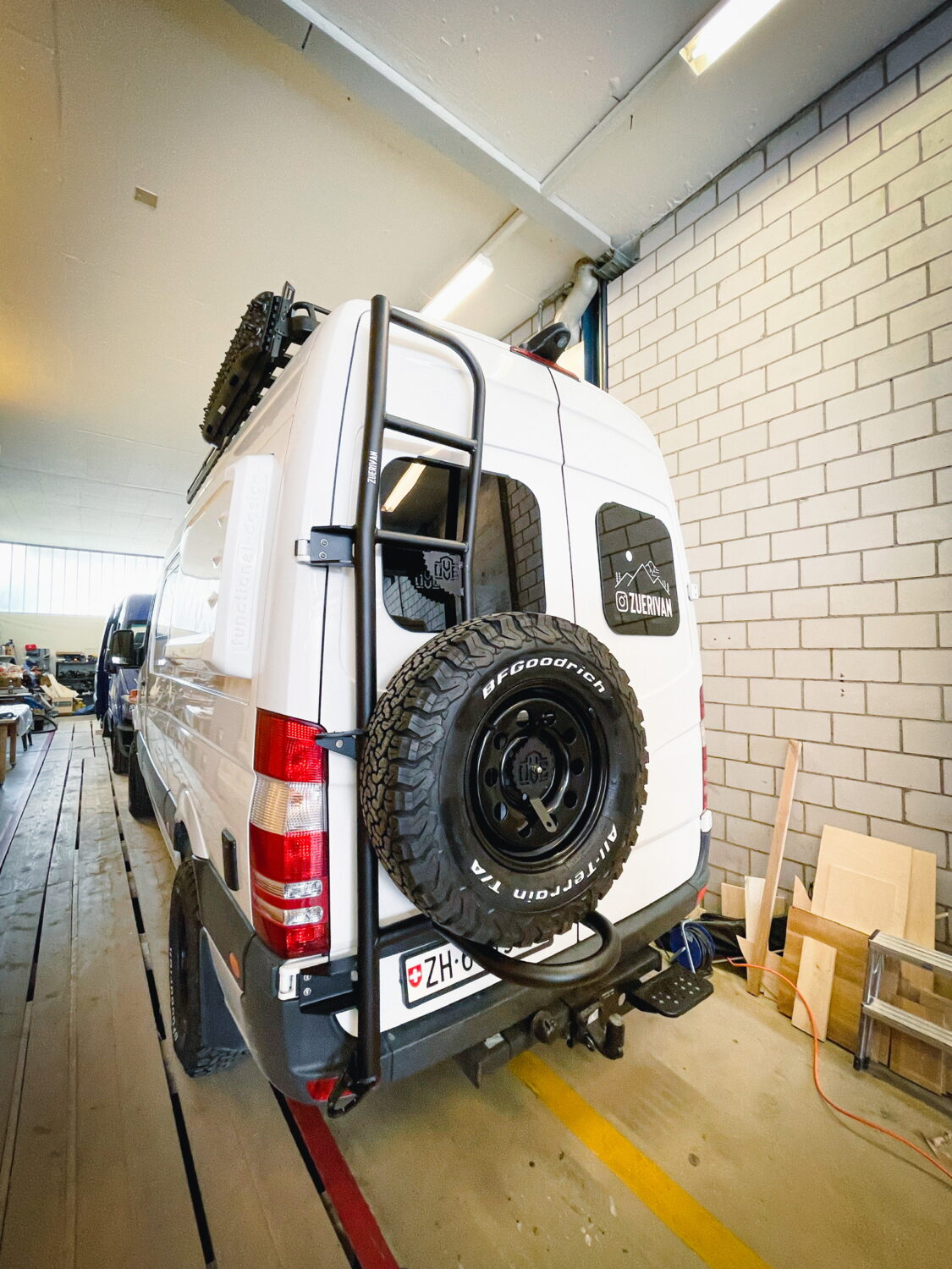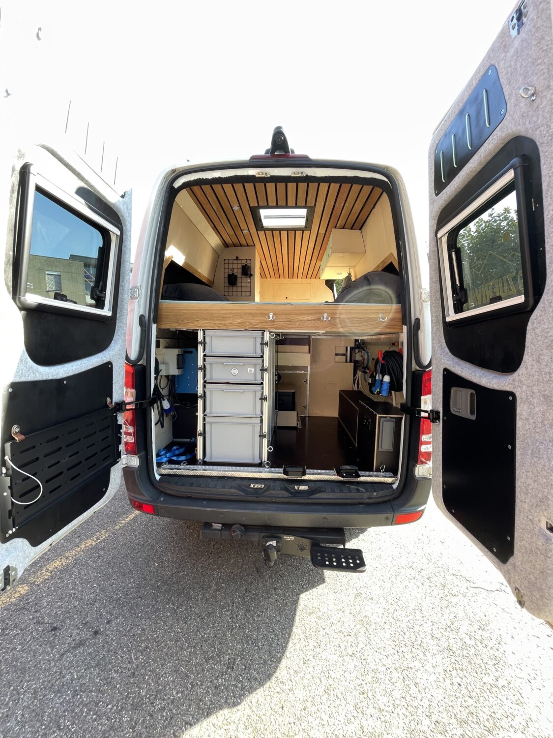 Der Ausbau dauerte ca. 1 Jahr wobei ich etwa 1/2 Jahr intensiver dran gearbeitet habe. Dank ordentlich Batterien (400 Ah) und 300 W Solarpanes bin ich lange autark unterwegs. In der Garage hats Platz für 2 Bikes und ne Menge Material. Geduscht wird Outdoor aber dank Boiler mit warmem Wasser. Hab die Seiten verbreitert um quer schlafen zu können. So hab ich 1.80 x 1.40 m Liegefläche.