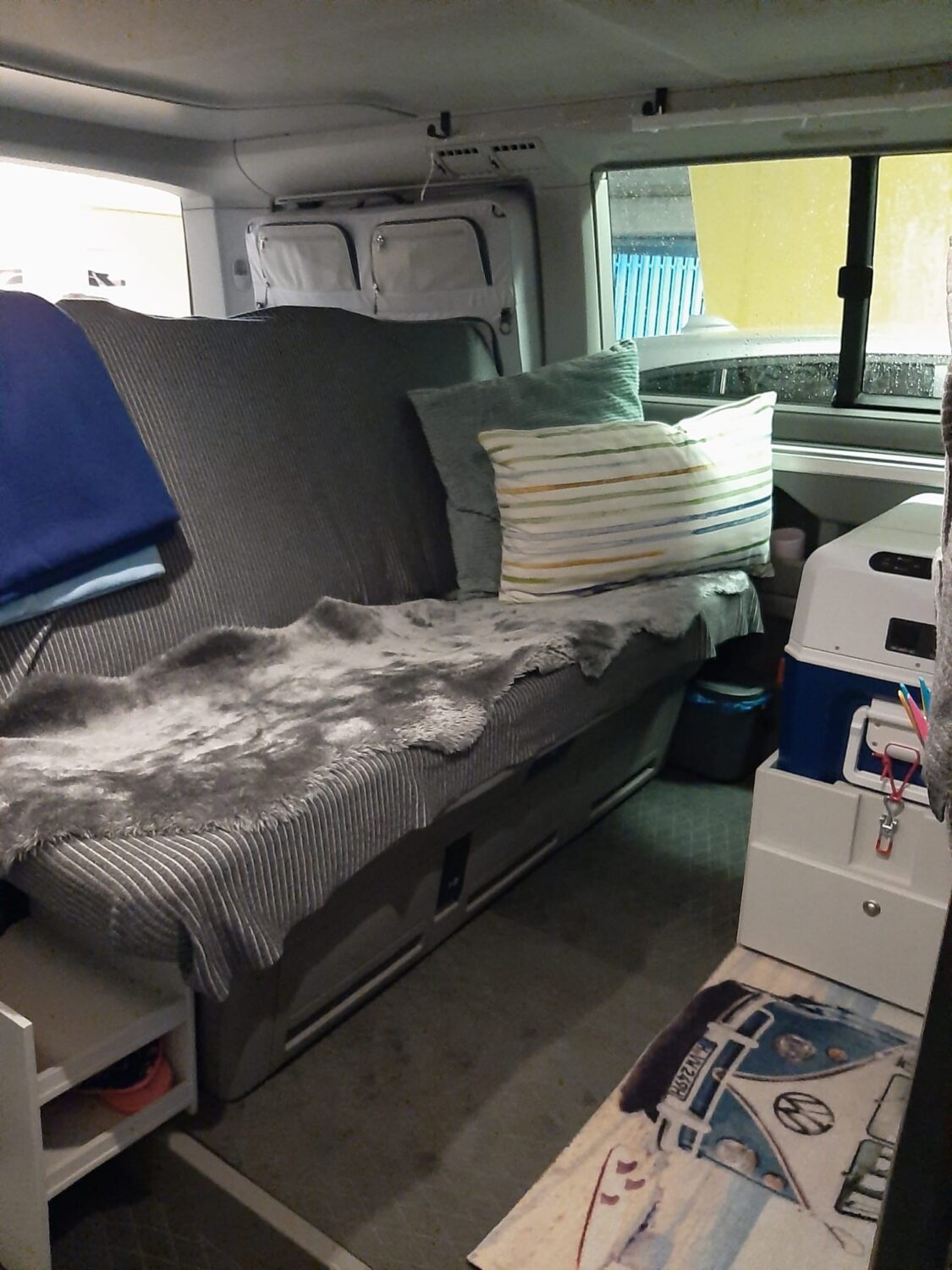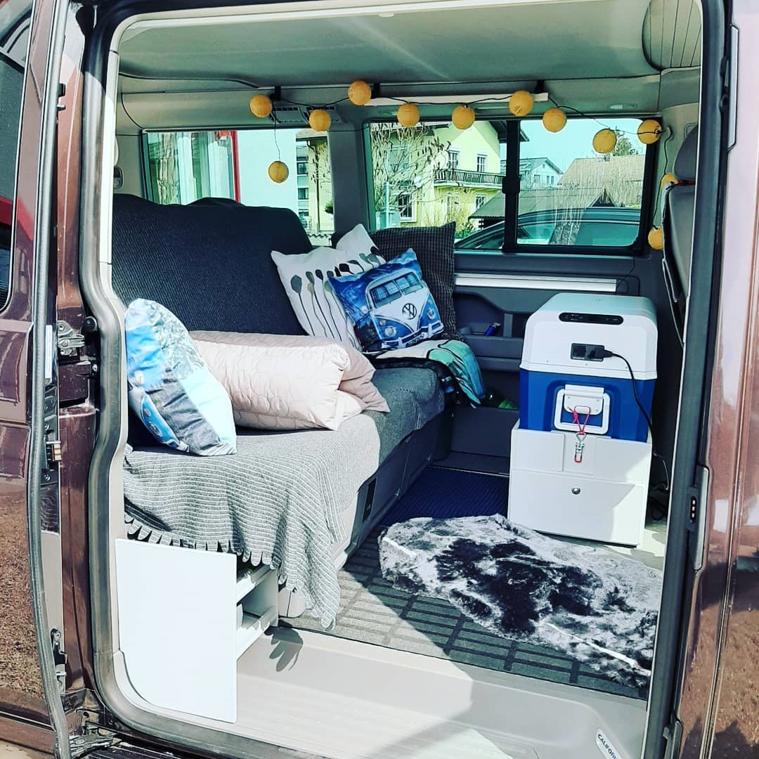 Mit meinem Papa gemeinsam habe ich 3 Monate lang den Grund-Ausbau geplant und ausgeführt. Die diversen Veränderungen und Upgrades kommen laufend dazu (meistens im Winter). Besonders stolz bin ich darauf, dass der Bruno einfach so sau-gemütlich eingerichtet ist und man sich auch bei Schlechtwetter super wohl darin fühlt. Außerdem bin ich total happy damit, dass ich wenig Sachen mit habe und mit dem nötigsten auskomme. Besonders freue ich mich zur Zeit über meinen Basilikum, der am Fenster hängt und mitreist. Den Topf samt Aufhängung habe ich aus Kopenhagen mitgenommen.