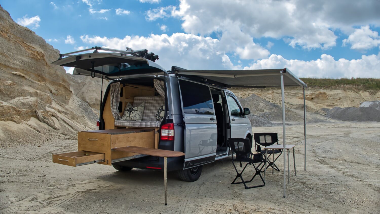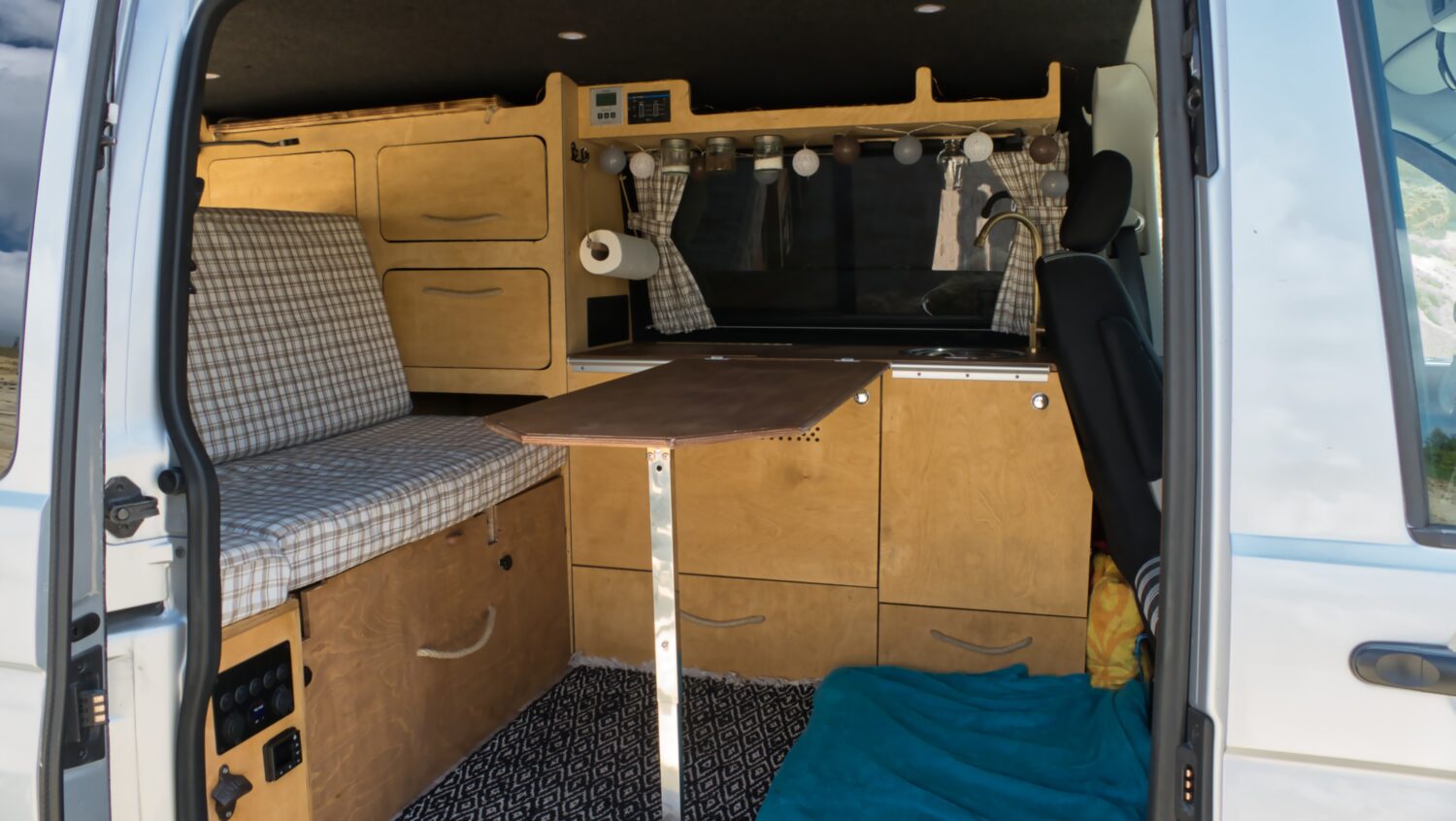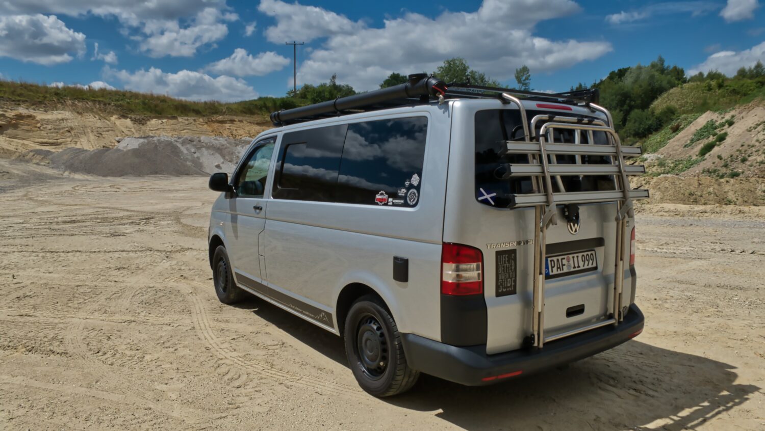 Der komplette Ausbau hat sich über 6 Monate hingezogen und oft hat Eins das Andere ergeben. Der grobe Plan hat nur im Kopf existiert und wurde hin und wieder angepasst. Und da es nur ein Transporter war, musste auch nicht viel entrümpelt werden. Dann ging es auch schon los mit dem Dämmen und Filzen des kompletten Innenraumes, neuer Dachhimmel und Heckklappenverkleidung mit LED-Spots, Bodenplatte und Kleiderschrank. Die Indoor-Küche mit Kühlbox, Spülbecken,15L Frisch- und Grauwasser, einer Kaffeemaschine und weiterem Stauraum. Die Outdoor-Heck-Küche ist per Schwerlastauszug ausziehbar. Nach diesem Prinzip funktioniert auch das Bett. Der Doppelbeifahrersitz hat eine Drehkonsole spendiert bekommen. Die Stromversorgung besteht aus einem LiFePO4-Akku, Ladebooster, 1500W Wechselrichter, 180WP Solarmodul und einer nachgerüsteten CEE-Dose. Auf dem Dach ist ein Dachträger von ND-Rack verbaut, welcher Platz für die Markise, das Solarmodul, Boxen, die Solardusche und Windsurfequipment bietet. Am Heck befindet sich ein Fahrradträger und unterm Bus eine Autoterm Air 2D Standheizung. Demnächst sind noch All Terrain Reifen geplant. Besonders "stolz" sind wir darauf, dass alles in Eigenleistung geschaffen wurde.