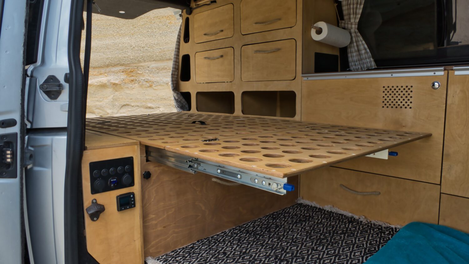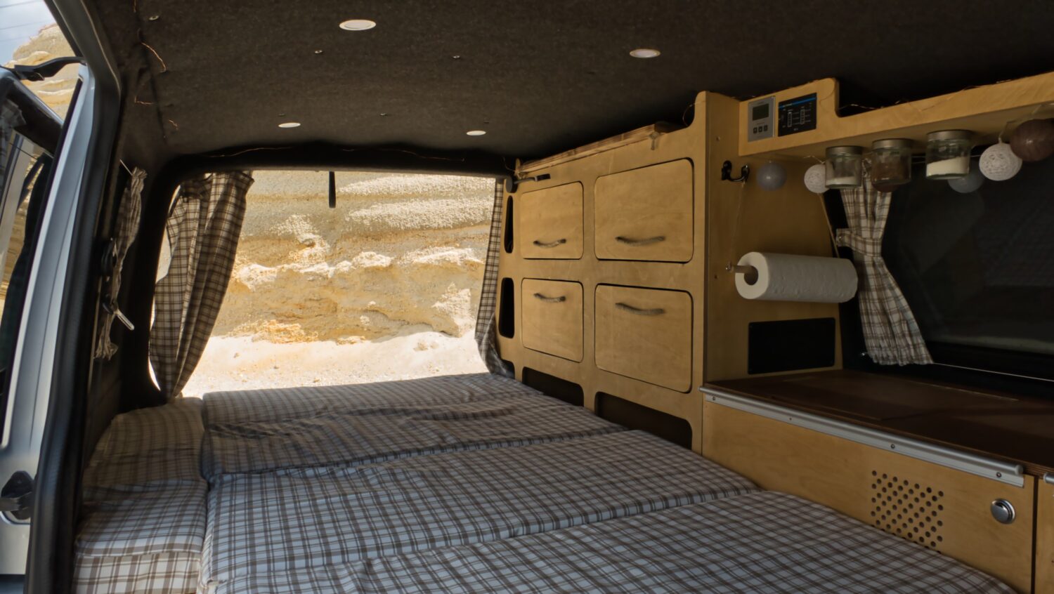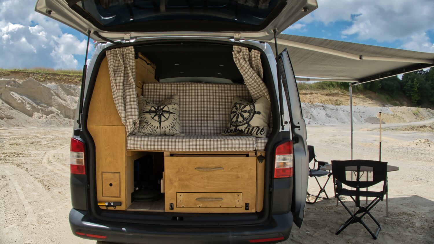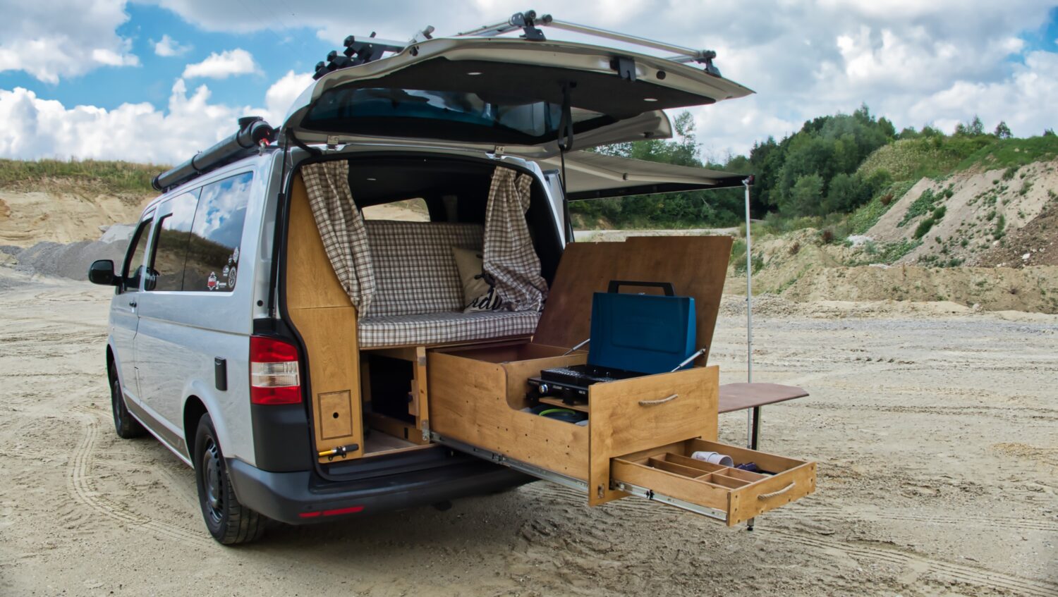 Der komplette Ausbau hat sich über 6 Monate hingezogen und oft hat Eins das Andere ergeben. Der grobe Plan hat nur im Kopf existiert und wurde hin und wieder angepasst. Und da es nur ein Transporter war, musste auch nicht viel entrümpelt werden. Dann ging es auch schon los mit dem Dämmen und Filzen des kompletten Innenraumes, neuer Dachhimmel und Heckklappenverkleidung mit LED-Spots, Bodenplatte und Kleiderschrank. Die Indoor-Küche mit Kühlbox, Spülbecken,15L Frisch- und Grauwasser, einer Kaffeemaschine und weiterem Stauraum. Die Outdoor-Heck-Küche ist per Schwerlastauszug ausziehbar. Nach diesem Prinzip funktioniert auch das Bett. Der Doppelbeifahrersitz hat eine Drehkonsole spendiert bekommen. Die Stromversorgung besteht aus einem LiFePO4-Akku, Ladebooster, 1500W Wechselrichter, 180WP Solarmodul und einer nachgerüsteten CEE-Dose. Auf dem Dach ist ein Dachträger von ND-Rack verbaut, welcher Platz für die Markise, das Solarmodul, Boxen, die Solardusche und Windsurfequipment bietet. Am Heck befindet sich ein Fahrradträger und unterm Bus eine Autoterm Air 2D Standheizung. Demnächst sind noch All Terrain Reifen geplant. Besonders "stolz" sind wir darauf, dass alles in Eigenleistung geschaffen wurde.