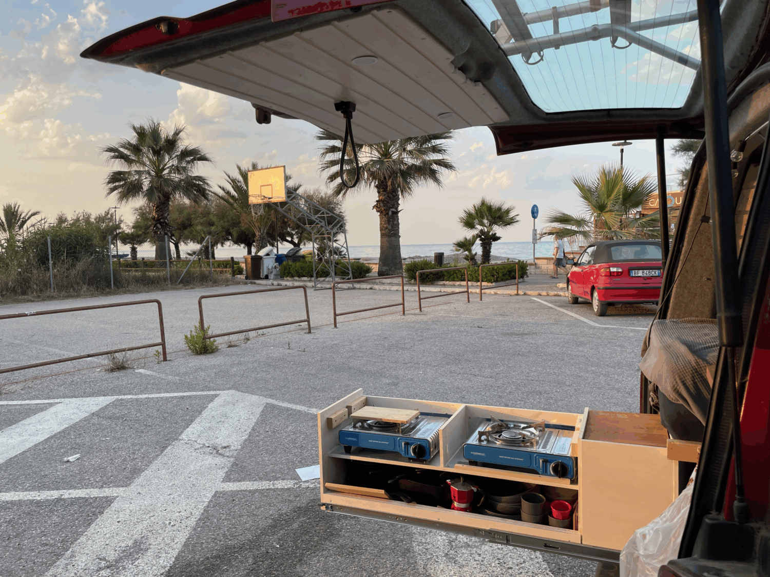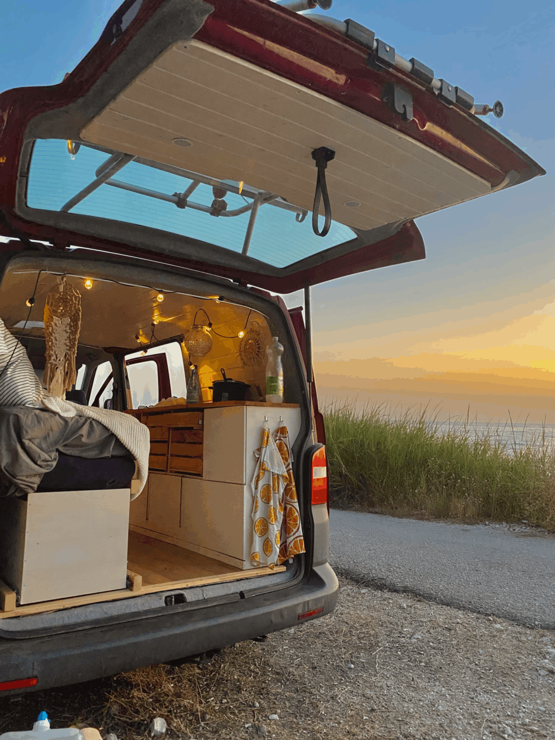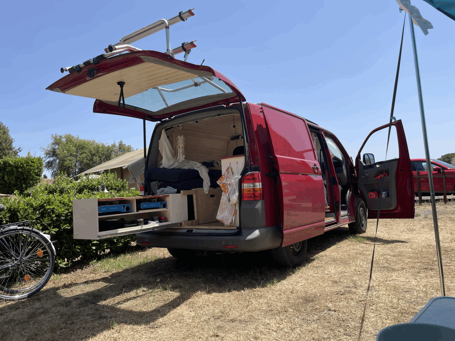 Ich bin Ludwig, habe mein erstes Leben als treues Handwerkerauto hinter mir und wurde anschließend in ca. 10 Monaten zu einem gemütlichen Sommercamper umgebaut. Wichtig war hierbei autark stehen zu können (Solar) und draußen kochen zu können. Daher verfüge ich über einen Heckauszug mit zwei Gaskochern. Ich sollte möglichst unauffällig bleiben und habe daher keine Camping-Seitenfenster, sondern nur eine kleine Dachluke (und ab Werk eine Heckscheibe). Wichtig war außerdem möglichst viel auf Plastik und nicht nachwachsende Rohstoffe zu verzichten: Meine gesamte Küchenausstattung ist beispielsweise aus Bambusfasern. Außerdem habe ich einen kleinen Safe unter dem Beifahrersitz, sodass sich auch Laptops bei einem Stadtbummel problemlos einschließen lassen.